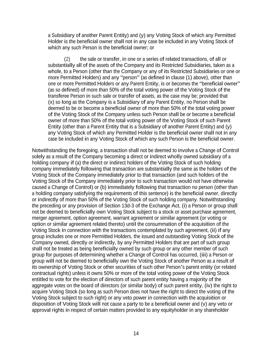 14 a Subsidiary of another Parent Entity) and (y) any Voting Stock of which any Permitted Holder is the beneficial owner shall not in any case be included in any Voting Stock of which any such Person is the beneficial owner; or (2) the sale or transfer, in one or a series of related transactions, of all or substantially all of the assets of the Company and its Restricted Subsidiaries, taken as a whole, to a Person (other than the Company or any of its Restricted Subsidiaries or one or more Permitted Holders) and any “person” (as defined in clause (1) above), other than one or more Permitted Holders or any Parent Entity, is or becomes the “beneficial owner” (as so defined) of more than 50% of the total voting power of the Voting Stock of the transferee Person in such sale or transfer of assets, as the case may be; provided that (x) so long as the Company is a Subsidiary of any Parent Entity, no Person shall be deemed to be or become a beneficial owner of more than 50% of the total voting power of the Voting Stock of the Company unless such Person shall be or become a beneficial owner of more than 50% of the total voting power of the Voting Stock of such Parent Entity (other than a Parent Entity that is a Subsidiary of another Parent Entity) and (y) any Voting Stock of which any Permitted Holder is the beneficial owner shall not in any case be included in any Voting Stock of which any such Person is the beneficial owner. Notwithstanding the foregoing, a transaction shall not be deemed to involve a Change of Control solely as a result of the Company becoming a direct or indirect wholly owned subsidiary of a holding company if (a) the direct or indirect holders of the Voting Stock of such holding company immediately following that transaction are substantially the same as the holders of the Voting Stock of the Company immediately prior to that transaction (and such holders of the Voting Stock of the Company immediately prior to such transaction would not have otherwise caused a Change of Control) or (b) immediately following that transaction no person (other than a holding company satisfying the requirements of this sentence) is the beneficial owner, directly or indirectly of more than 50% of the Voting Stock of such holding company. Notwithstanding the preceding or any provision of Section 13d-3 of the Exchange Act, (i) a Person or group shall not be deemed to beneficially own Voting Stock subject to a stock or asset purchase agreement, merger agreement, option agreement, warrant agreement or similar agreement (or voting or option or similar agreement related thereto) until the consummation of the acquisition of the Voting Stock in connection with the transactions contemplated by such agreement, (ii) if any group includes one or more Permitted Holders, the issued and outstanding Voting Stock of the Company owned, directly or indirectly, by any Permitted Holders that are part of such group shall not be treated as being beneficially owned by such group or any other member of such group for purposes of determining whether a Change of Control has occurred, (iii) a Person or group will not be deemed to beneficially own the Voting Stock of another Person as a result of its ownership of Voting Stock or other securities of such other Person’s parent entity (or related contractual rights) unless it owns 50% or more of the total voting power of the Voting Stock entitled to vote for the election of directors of such parent entity having a majority of the aggregate votes on the board of directors (or similar body) of such parent entity, (iv) the right to acquire Voting Stock (so long as such Person does not have the right to direct the voting of the Voting Stock subject to such right) or any veto power in connection with the acquisition or disposition of Voting Stock will not cause a party to be a beneficial owner and (v) any veto or approval rights in respect of certain matters provided to any equityholder in any shareholder