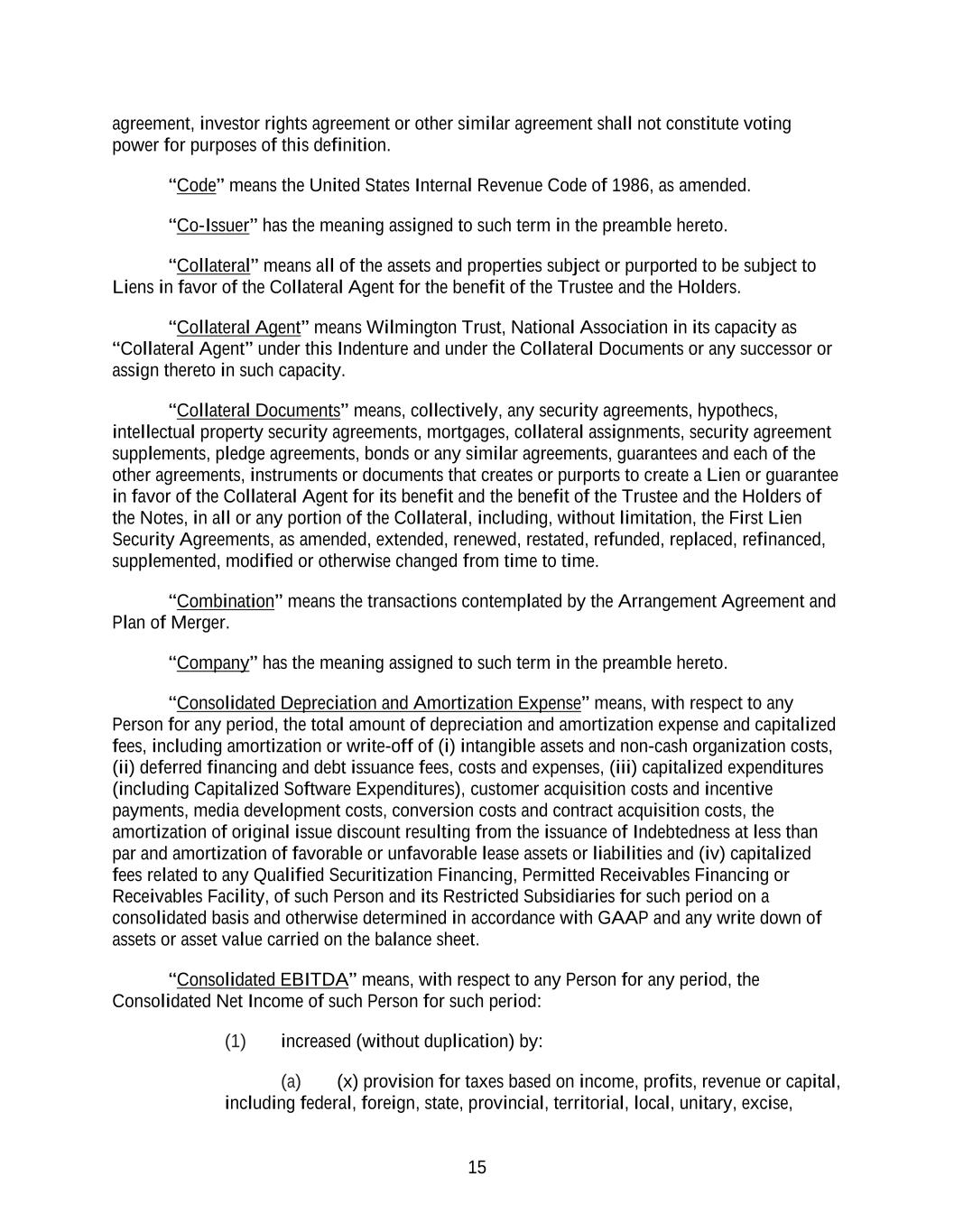 15 agreement, investor rights agreement or other similar agreement shall not constitute voting power for purposes of this definition. “Code” means the United States Internal Revenue Code of 1986, as amended. “Co-Issuer” has the meaning assigned to such term in the preamble hereto. “Collateral” means all of the assets and properties subject or purported to be subject to Liens in favor of the Collateral Agent for the benefit of the Trustee and the Holders. “Collateral Agent” means Wilmington Trust, National Association in its capacity as “Collateral Agent” under this Indenture and under the Collateral Documents or any successor or assign thereto in such capacity. “Collateral Documents” means, collectively, any security agreements, hypothecs, intellectual property security agreements, mortgages, collateral assignments, security agreement supplements, pledge agreements, bonds or any similar agreements, guarantees and each of the other agreements, instruments or documents that creates or purports to create a Lien or guarantee in favor of the Collateral Agent for its benefit and the benefit of the Trustee and the Holders of the Notes, in all or any portion of the Collateral, including, without limitation, the First Lien Security Agreements, as amended, extended, renewed, restated, refunded, replaced, refinanced, supplemented, modified or otherwise changed from time to time. “Combination” means the transactions contemplated by the Arrangement Agreement and Plan of Merger. “Company” has the meaning assigned to such term in the preamble hereto. “Consolidated Depreciation and Amortization Expense” means, with respect to any Person for any period, the total amount of depreciation and amortization expense and capitalized fees, including amortization or write-off of (i) intangible assets and non-cash organization costs, (ii) deferred financing and debt issuance fees, costs and expenses, (iii) capitalized expenditures (including Capitalized Software Expenditures), customer acquisition costs and incentive payments, media development costs, conversion costs and contract acquisition costs, the amortization of original issue discount resulting from the issuance of Indebtedness at less than par and amortization of favorable or unfavorable lease assets or liabilities and (iv) capitalized fees related to any Qualified Securitization Financing, Permitted Receivables Financing or Receivables Facility, of such Person and its Restricted Subsidiaries for such period on a consolidated basis and otherwise determined in accordance with GAAP and any write down of assets or asset value carried on the balance sheet. “Consolidated EBITDA” means, with respect to any Person for any period, the Consolidated Net Income of such Person for such period: (1) increased (without duplication) by: (a) (x) provision for taxes based on income, profits, revenue or capital, including federal, foreign, state, provincial, territorial, local, unitary, excise,