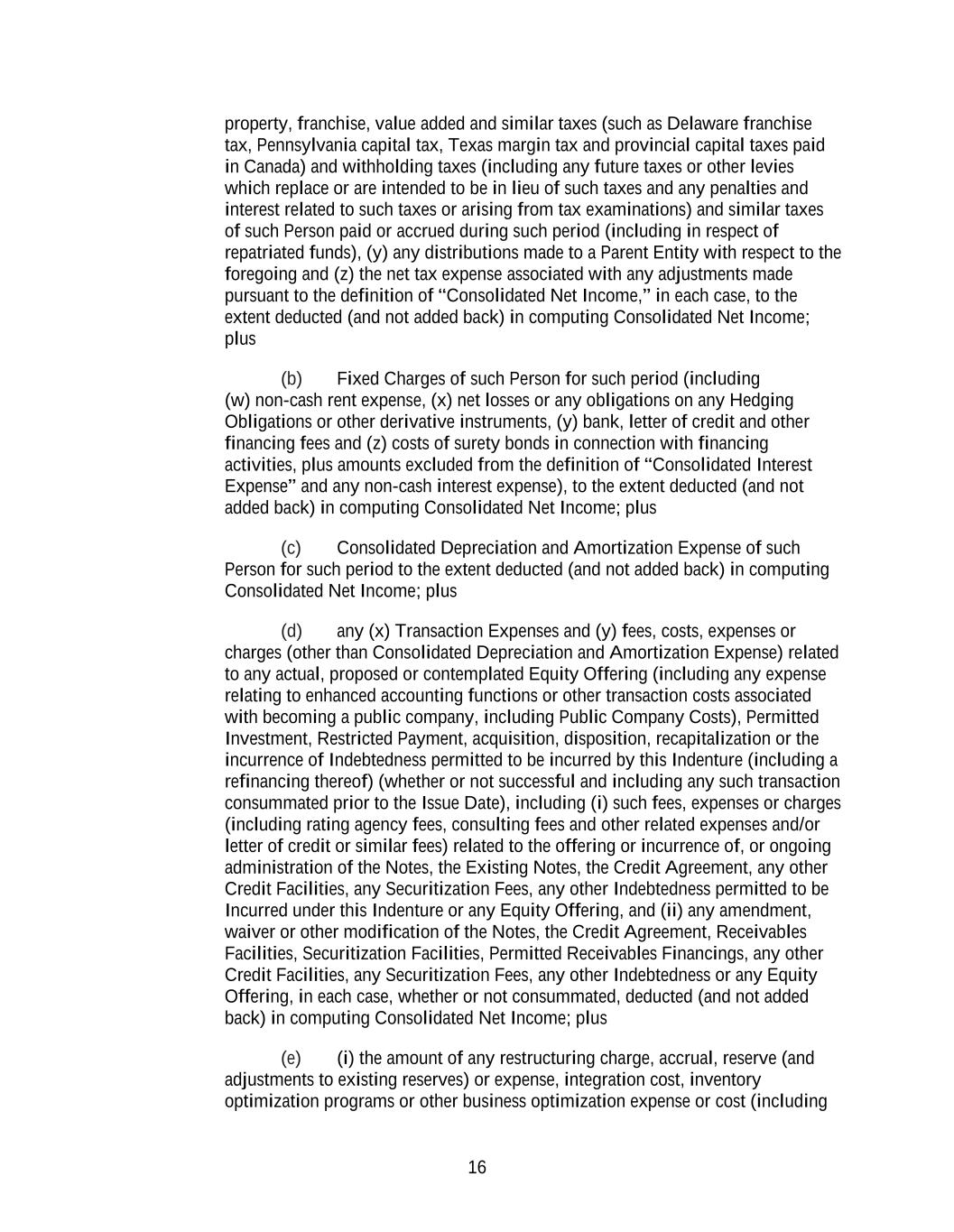 16 property, franchise, value added and similar taxes (such as Delaware franchise tax, Pennsylvania capital tax, Texas margin tax and provincial capital taxes paid in Canada) and withholding taxes (including any future taxes or other levies which replace or are intended to be in lieu of such taxes and any penalties and interest related to such taxes or arising from tax examinations) and similar taxes of such Person paid or accrued during such period (including in respect of repatriated funds), (y) any distributions made to a Parent Entity with respect to the foregoing and (z) the net tax expense associated with any adjustments made pursuant to the definition of “Consolidated Net Income,” in each case, to the extent deducted (and not added back) in computing Consolidated Net Income; plus (b) Fixed Charges of such Person for such period (including (w) non-cash rent expense, (x) net losses or any obligations on any Hedging Obligations or other derivative instruments, (y) bank, letter of credit and other financing fees and (z) costs of surety bonds in connection with financing activities, plus amounts excluded from the definition of “Consolidated Interest Expense” and any non-cash interest expense), to the extent deducted (and not added back) in computing Consolidated Net Income; plus (c) Consolidated Depreciation and Amortization Expense of such Person for such period to the extent deducted (and not added back) in computing Consolidated Net Income; plus (d) any (x) Transaction Expenses and (y) fees, costs, expenses or charges (other than Consolidated Depreciation and Amortization Expense) related to any actual, proposed or contemplated Equity Offering (including any expense relating to enhanced accounting functions or other transaction costs associated with becoming a public company, including Public Company Costs), Permitted Investment, Restricted Payment, acquisition, disposition, recapitalization or the incurrence of Indebtedness permitted to be incurred by this Indenture (including a refinancing thereof) (whether or not successful and including any such transaction consummated prior to the Issue Date), including (i) such fees, expenses or charges (including rating agency fees, consulting fees and other related expenses and/or letter of credit or similar fees) related to the offering or incurrence of, or ongoing administration of the Notes, the Existing Notes, the Credit Agreement, any other Credit Facilities, any Securitization Fees, any other Indebtedness permitted to be Incurred under this Indenture or any Equity Offering, and (ii) any amendment, waiver or other modification of the Notes, the Credit Agreement, Receivables Facilities, Securitization Facilities, Permitted Receivables Financings, any other Credit Facilities, any Securitization Fees, any other Indebtedness or any Equity Offering, in each case, whether or not consummated, deducted (and not added back) in computing Consolidated Net Income; plus (e) (i) the amount of any restructuring charge, accrual, reserve (and adjustments to existing reserves) or expense, integration cost, inventory optimization programs or other business optimization expense or cost (including