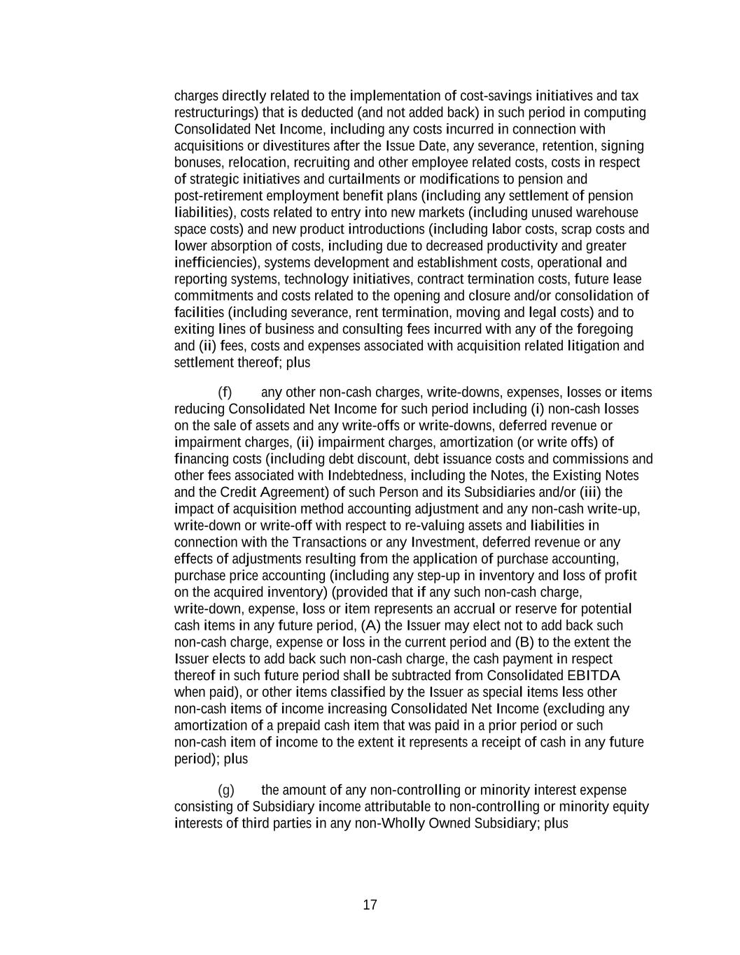 17 charges directly related to the implementation of cost-savings initiatives and tax restructurings) that is deducted (and not added back) in such period in computing Consolidated Net Income, including any costs incurred in connection with acquisitions or divestitures after the Issue Date, any severance, retention, signing bonuses, relocation, recruiting and other employee related costs, costs in respect of strategic initiatives and curtailments or modifications to pension and post-retirement employment benefit plans (including any settlement of pension liabilities), costs related to entry into new markets (including unused warehouse space costs) and new product introductions (including labor costs, scrap costs and lower absorption of costs, including due to decreased productivity and greater inefficiencies), systems development and establishment costs, operational and reporting systems, technology initiatives, contract termination costs, future lease commitments and costs related to the opening and closure and/or consolidation of facilities (including severance, rent termination, moving and legal costs) and to exiting lines of business and consulting fees incurred with any of the foregoing and (ii) fees, costs and expenses associated with acquisition related litigation and settlement thereof; plus (f) any other non-cash charges, write-downs, expenses, losses or items reducing Consolidated Net Income for such period including (i) non-cash losses on the sale of assets and any write-offs or write-downs, deferred revenue or impairment charges, (ii) impairment charges, amortization (or write offs) of financing costs (including debt discount, debt issuance costs and commissions and other fees associated with Indebtedness, including the Notes, the Existing Notes and the Credit Agreement) of such Person and its Subsidiaries and/or (iii) the impact of acquisition method accounting adjustment and any non-cash write-up, write-down or write-off with respect to re-valuing assets and liabilities in connection with the Transactions or any Investment, deferred revenue or any effects of adjustments resulting from the application of purchase accounting, purchase price accounting (including any step-up in inventory and loss of profit on the acquired inventory) (provided that if any such non-cash charge, write-down, expense, loss or item represents an accrual or reserve for potential cash items in any future period, (A) the Issuer may elect not to add back such non-cash charge, expense or loss in the current period and (B) to the extent the Issuer elects to add back such non-cash charge, the cash payment in respect thereof in such future period shall be subtracted from Consolidated EBITDA when paid), or other items classified by the Issuer as special items less other non-cash items of income increasing Consolidated Net Income (excluding any amortization of a prepaid cash item that was paid in a prior period or such non-cash item of income to the extent it represents a receipt of cash in any future period); plus (g) the amount of any non-controlling or minority interest expense consisting of Subsidiary income attributable to non-controlling or minority equity interests of third parties in any non-Wholly Owned Subsidiary; plus
