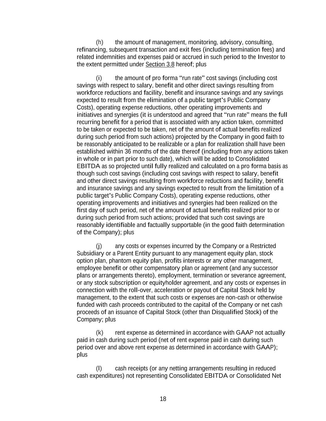 18 (h) the amount of management, monitoring, advisory, consulting, refinancing, subsequent transaction and exit fees (including termination fees) and related indemnities and expenses paid or accrued in such period to the Investor to the extent permitted under Section 3.8 hereof; plus (i) the amount of pro forma “run rate” cost savings (including cost savings with respect to salary, benefit and other direct savings resulting from workforce reductions and facility, benefit and insurance savings and any savings expected to result from the elimination of a public target’s Public Company Costs), operating expense reductions, other operating improvements and initiatives and synergies (it is understood and agreed that “run rate” means the full recurring benefit for a period that is associated with any action taken, committed to be taken or expected to be taken, net of the amount of actual benefits realized during such period from such actions) projected by the Company in good faith to be reasonably anticipated to be realizable or a plan for realization shall have been established within 36 months of the date thereof (including from any actions taken in whole or in part prior to such date), which will be added to Consolidated EBITDA as so projected until fully realized and calculated on a pro forma basis as though such cost savings (including cost savings with respect to salary, benefit and other direct savings resulting from workforce reductions and facility, benefit and insurance savings and any savings expected to result from the limitation of a public target’s Public Company Costs), operating expense reductions, other operating improvements and initiatives and synergies had been realized on the first day of such period, net of the amount of actual benefits realized prior to or during such period from such actions; provided that such cost savings are reasonably identifiable and factually supportable (in the good faith determination of the Company); plus (j) any costs or expenses incurred by the Company or a Restricted Subsidiary or a Parent Entity pursuant to any management equity plan, stock option plan, phantom equity plan, profits interests or any other management, employee benefit or other compensatory plan or agreement (and any successor plans or arrangements thereto), employment, termination or severance agreement, or any stock subscription or equityholder agreement, and any costs or expenses in connection with the roll-over, acceleration or payout of Capital Stock held by management, to the extent that such costs or expenses are non-cash or otherwise funded with cash proceeds contributed to the capital of the Company or net cash proceeds of an issuance of Capital Stock (other than Disqualified Stock) of the Company; plus (k) rent expense as determined in accordance with GAAP not actually paid in cash during such period (net of rent expense paid in cash during such period over and above rent expense as determined in accordance with GAAP); plus (l) cash receipts (or any netting arrangements resulting in reduced cash expenditures) not representing Consolidated EBITDA or Consolidated Net