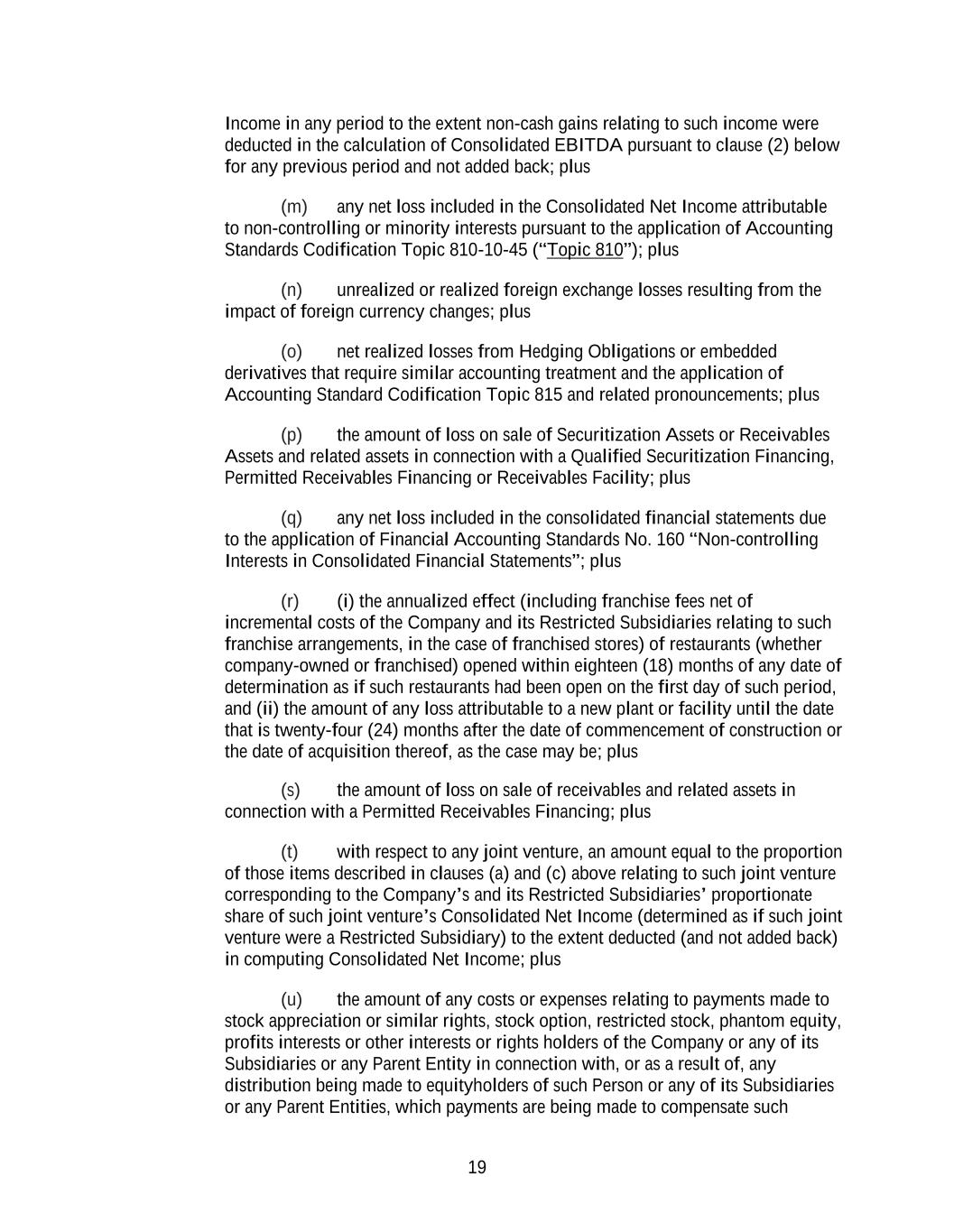19 Income in any period to the extent non-cash gains relating to such income were deducted in the calculation of Consolidated EBITDA pursuant to clause (2) below for any previous period and not added back; plus (m) any net loss included in the Consolidated Net Income attributable to non-controlling or minority interests pursuant to the application of Accounting Standards Codification Topic 810-10-45 (“Topic 810”); plus (n) unrealized or realized foreign exchange losses resulting from the impact of foreign currency changes; plus (o) net realized losses from Hedging Obligations or embedded derivatives that require similar accounting treatment and the application of Accounting Standard Codification Topic 815 and related pronouncements; plus (p) the amount of loss on sale of Securitization Assets or Receivables Assets and related assets in connection with a Qualified Securitization Financing, Permitted Receivables Financing or Receivables Facility; plus (q) any net loss included in the consolidated financial statements due to the application of Financial Accounting Standards No. 160 “Non-controlling Interests in Consolidated Financial Statements”; plus (r) (i) the annualized effect (including franchise fees net of incremental costs of the Company and its Restricted Subsidiaries relating to such franchise arrangements, in the case of franchised stores) of restaurants (whether company-owned or franchised) opened within eighteen (18) months of any date of determination as if such restaurants had been open on the first day of such period, and (ii) the amount of any loss attributable to a new plant or facility until the date that is twenty-four (24) months after the date of commencement of construction or the date of acquisition thereof, as the case may be; plus (s) the amount of loss on sale of receivables and related assets in connection with a Permitted Receivables Financing; plus (t) with respect to any joint venture, an amount equal to the proportion of those items described in clauses (a) and (c) above relating to such joint venture corresponding to the Company’s and its Restricted Subsidiaries’ proportionate share of such joint venture’s Consolidated Net Income (determined as if such joint venture were a Restricted Subsidiary) to the extent deducted (and not added back) in computing Consolidated Net Income; plus (u) the amount of any costs or expenses relating to payments made to stock appreciation or similar rights, stock option, restricted stock, phantom equity, profits interests or other interests or rights holders of the Company or any of its Subsidiaries or any Parent Entity in connection with, or as a result of, any distribution being made to equityholders of such Person or any of its Subsidiaries or any Parent Entities, which payments are being made to compensate such