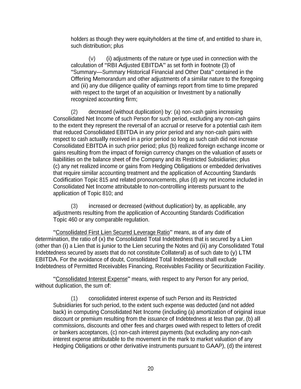 20 holders as though they were equityholders at the time of, and entitled to share in, such distribution; plus (v) (i) adjustments of the nature or type used in connection with the calculation of “RBI Adjusted EBITDA” as set forth in footnote (3) of “Summary—Summary Historical Financial and Other Data” contained in the Offering Memorandum and other adjustments of a similar nature to the foregoing and (ii) any due diligence quality of earnings report from time to time prepared with respect to the target of an acquisition or Investment by a nationally recognized accounting firm; (2) decreased (without duplication) by: (a) non-cash gains increasing Consolidated Net Income of such Person for such period, excluding any non-cash gains to the extent they represent the reversal of an accrual or reserve for a potential cash item that reduced Consolidated EBITDA in any prior period and any non-cash gains with respect to cash actually received in a prior period so long as such cash did not increase Consolidated EBITDA in such prior period; plus (b) realized foreign exchange income or gains resulting from the impact of foreign currency changes on the valuation of assets or liabilities on the balance sheet of the Company and its Restricted Subsidiaries; plus (c) any net realized income or gains from Hedging Obligations or embedded derivatives that require similar accounting treatment and the application of Accounting Standards Codification Topic 815 and related pronouncements, plus (d) any net income included in Consolidated Net Income attributable to non-controlling interests pursuant to the application of Topic 810; and (3) increased or decreased (without duplication) by, as applicable, any adjustments resulting from the application of Accounting Standards Codification Topic 460 or any comparable regulation. “Consolidated First Lien Secured Leverage Ratio” means, as of any date of determination, the ratio of (x) the Consolidated Total Indebtedness that is secured by a Lien (other than (i) a Lien that is junior to the Lien securing the Notes and (ii) any Consolidated Total Indebtedness secured by assets that do not constitute Collateral) as of such date to (y) LTM EBITDA. For the avoidance of doubt, Consolidated Total Indebtedness shall exclude Indebtedness of Permitted Receivables Financing, Receivables Facility or Securitization Facility. “Consolidated Interest Expense” means, with respect to any Person for any period, without duplication, the sum of: (1) consolidated interest expense of such Person and its Restricted Subsidiaries for such period, to the extent such expense was deducted (and not added back) in computing Consolidated Net Income (including (a) amortization of original issue discount or premium resulting from the issuance of Indebtedness at less than par, (b) all commissions, discounts and other fees and charges owed with respect to letters of credit or bankers acceptances, (c) non-cash interest payments (but excluding any non-cash interest expense attributable to the movement in the mark to market valuation of any Hedging Obligations or other derivative instruments pursuant to GAAP), (d) the interest