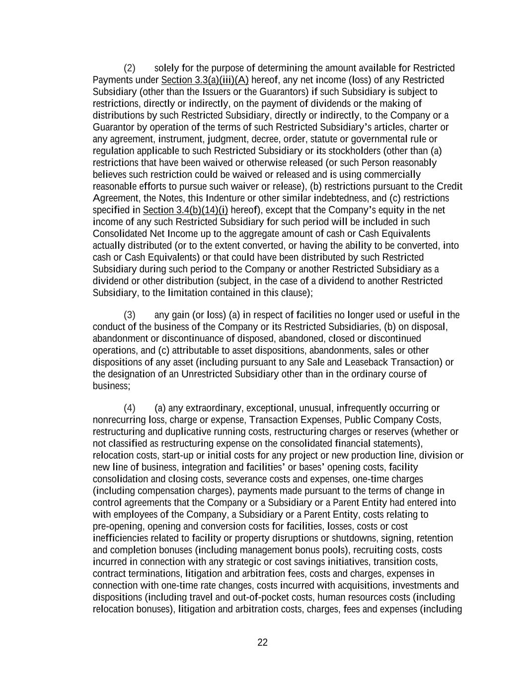 22 (2) solely for the purpose of determining the amount available for Restricted Payments under Section 3.3(a)(iii)(A) hereof, any net income (loss) of any Restricted Subsidiary (other than the Issuers or the Guarantors) if such Subsidiary is subject to restrictions, directly or indirectly, on the payment of dividends or the making of distributions by such Restricted Subsidiary, directly or indirectly, to the Company or a Guarantor by operation of the terms of such Restricted Subsidiary’s articles, charter or any agreement, instrument, judgment, decree, order, statute or governmental rule or regulation applicable to such Restricted Subsidiary or its stockholders (other than (a) restrictions that have been waived or otherwise released (or such Person reasonably believes such restriction could be waived or released and is using commercially reasonable efforts to pursue such waiver or release), (b) restrictions pursuant to the Credit Agreement, the Notes, this Indenture or other similar indebtedness, and (c) restrictions specified in Section 3.4(b)(14)(i) hereof), except that the Company’s equity in the net income of any such Restricted Subsidiary for such period will be included in such Consolidated Net Income up to the aggregate amount of cash or Cash Equivalents actually distributed (or to the extent converted, or having the ability to be converted, into cash or Cash Equivalents) or that could have been distributed by such Restricted Subsidiary during such period to the Company or another Restricted Subsidiary as a dividend or other distribution (subject, in the case of a dividend to another Restricted Subsidiary, to the limitation contained in this clause); (3) any gain (or loss) (a) in respect of facilities no longer used or useful in the conduct of the business of the Company or its Restricted Subsidiaries, (b) on disposal, abandonment or discontinuance of disposed, abandoned, closed or discontinued operations, and (c) attributable to asset dispositions, abandonments, sales or other dispositions of any asset (including pursuant to any Sale and Leaseback Transaction) or the designation of an Unrestricted Subsidiary other than in the ordinary course of business; (4) (a) any extraordinary, exceptional, unusual, infrequently occurring or nonrecurring loss, charge or expense, Transaction Expenses, Public Company Costs, restructuring and duplicative running costs, restructuring charges or reserves (whether or not classified as restructuring expense on the consolidated financial statements), relocation costs, start-up or initial costs for any project or new production line, division or new line of business, integration and facilities’ or bases’ opening costs, facility consolidation and closing costs, severance costs and expenses, one-time charges (including compensation charges), payments made pursuant to the terms of change in control agreements that the Company or a Subsidiary or a Parent Entity had entered into with employees of the Company, a Subsidiary or a Parent Entity, costs relating to pre-opening, opening and conversion costs for facilities, losses, costs or cost inefficiencies related to facility or property disruptions or shutdowns, signing, retention and completion bonuses (including management bonus pools), recruiting costs, costs incurred in connection with any strategic or cost savings initiatives, transition costs, contract terminations, litigation and arbitration fees, costs and charges, expenses in connection with one-time rate changes, costs incurred with acquisitions, investments and dispositions (including travel and out-of-pocket costs, human resources costs (including relocation bonuses), litigation and arbitration costs, charges, fees and expenses (including