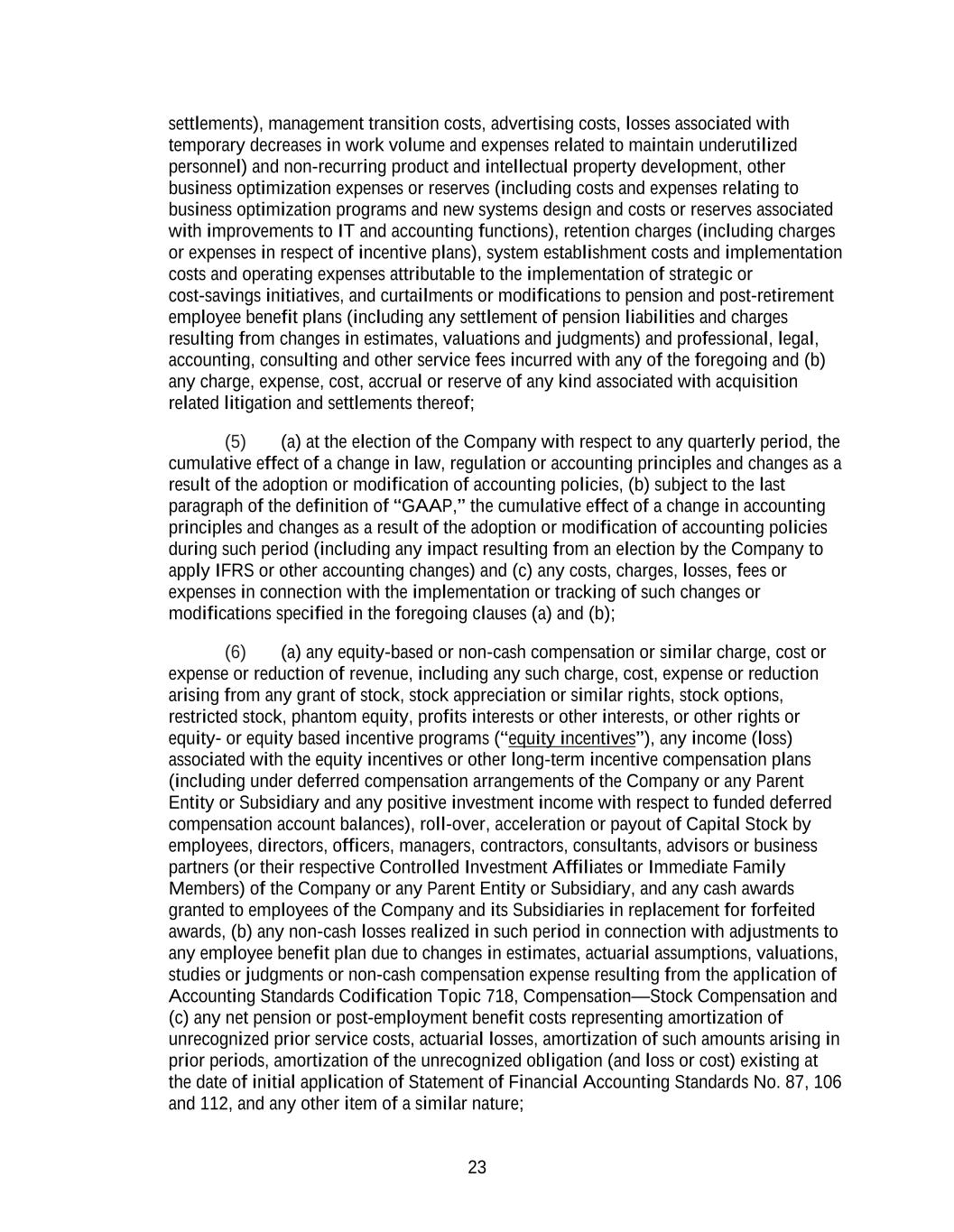 23 settlements), management transition costs, advertising costs, losses associated with temporary decreases in work volume and expenses related to maintain underutilized personnel) and non-recurring product and intellectual property development, other business optimization expenses or reserves (including costs and expenses relating to business optimization programs and new systems design and costs or reserves associated with improvements to IT and accounting functions), retention charges (including charges or expenses in respect of incentive plans), system establishment costs and implementation costs and operating expenses attributable to the implementation of strategic or cost-savings initiatives, and curtailments or modifications to pension and post-retirement employee benefit plans (including any settlement of pension liabilities and charges resulting from changes in estimates, valuations and judgments) and professional, legal, accounting, consulting and other service fees incurred with any of the foregoing and (b) any charge, expense, cost, accrual or reserve of any kind associated with acquisition related litigation and settlements thereof; (5) (a) at the election of the Company with respect to any quarterly period, the cumulative effect of a change in law, regulation or accounting principles and changes as a result of the adoption or modification of accounting policies, (b) subject to the last paragraph of the definition of “GAAP,” the cumulative effect of a change in accounting principles and changes as a result of the adoption or modification of accounting policies during such period (including any impact resulting from an election by the Company to apply IFRS or other accounting changes) and (c) any costs, charges, losses, fees or expenses in connection with the implementation or tracking of such changes or modifications specified in the foregoing clauses (a) and (b); (6) (a) any equity-based or non-cash compensation or similar charge, cost or expense or reduction of revenue, including any such charge, cost, expense or reduction arising from any grant of stock, stock appreciation or similar rights, stock options, restricted stock, phantom equity, profits interests or other interests, or other rights or equity- or equity based incentive programs (“equity incentives”), any income (loss) associated with the equity incentives or other long-term incentive compensation plans (including under deferred compensation arrangements of the Company or any Parent Entity or Subsidiary and any positive investment income with respect to funded deferred compensation account balances), roll-over, acceleration or payout of Capital Stock by employees, directors, officers, managers, contractors, consultants, advisors or business partners (or their respective Controlled Investment Affiliates or Immediate Family Members) of the Company or any Parent Entity or Subsidiary, and any cash awards granted to employees of the Company and its Subsidiaries in replacement for forfeited awards, (b) any non-cash losses realized in such period in connection with adjustments to any employee benefit plan due to changes in estimates, actuarial assumptions, valuations, studies or judgments or non-cash compensation expense resulting from the application of Accounting Standards Codification Topic 718, Compensation—Stock Compensation and (c) any net pension or post-employment benefit costs representing amortization of unrecognized prior service costs, actuarial losses, amortization of such amounts arising in prior periods, amortization of the unrecognized obligation (and loss or cost) existing at the date of initial application of Statement of Financial Accounting Standards No. 87, 106 and 112, and any other item of a similar nature;