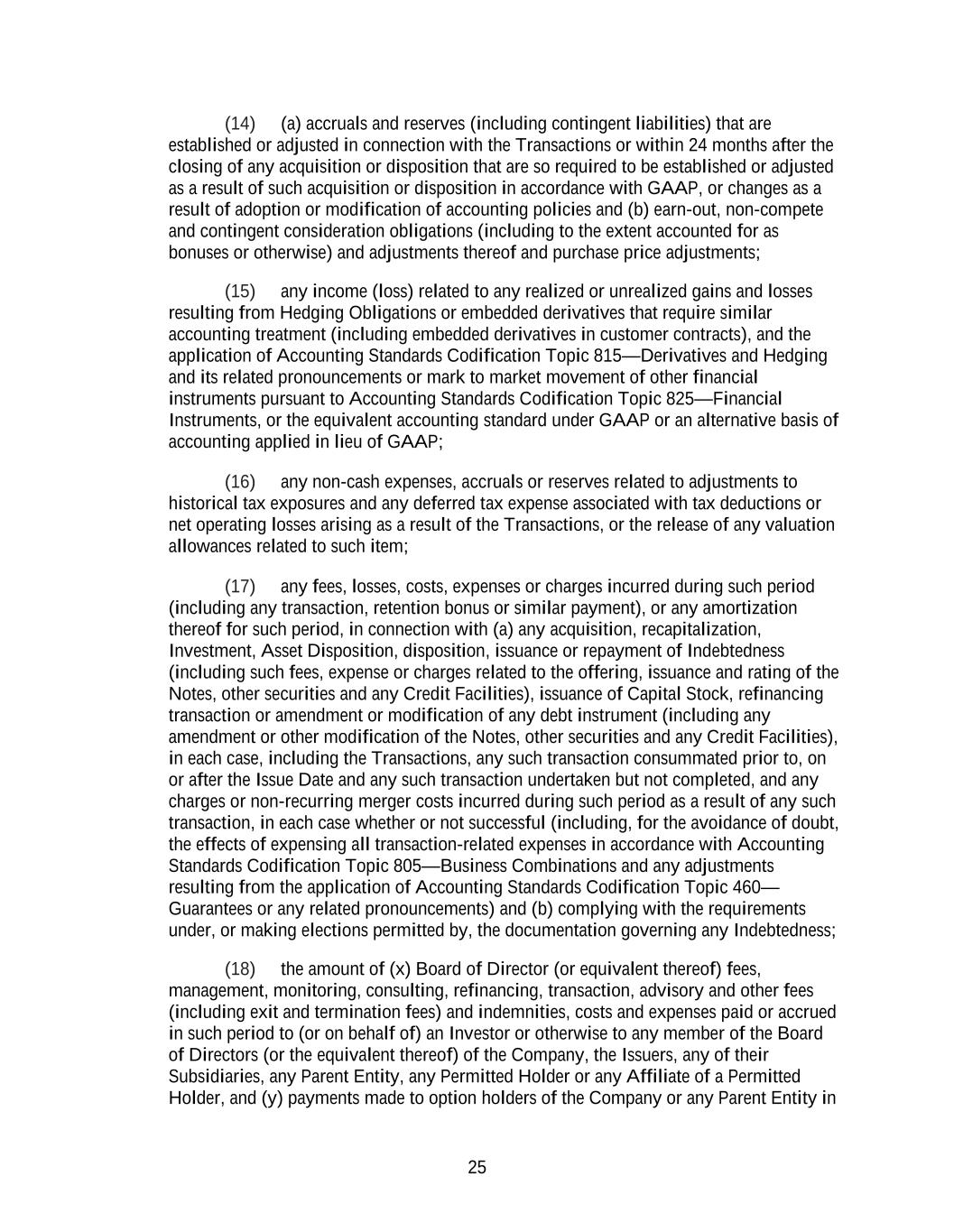 25 (14) (a) accruals and reserves (including contingent liabilities) that are established or adjusted in connection with the Transactions or within 24 months after the closing of any acquisition or disposition that are so required to be established or adjusted as a result of such acquisition or disposition in accordance with GAAP, or changes as a result of adoption or modification of accounting policies and (b) earn-out, non-compete and contingent consideration obligations (including to the extent accounted for as bonuses or otherwise) and adjustments thereof and purchase price adjustments; (15) any income (loss) related to any realized or unrealized gains and losses resulting from Hedging Obligations or embedded derivatives that require similar accounting treatment (including embedded derivatives in customer contracts), and the application of Accounting Standards Codification Topic 815—Derivatives and Hedging and its related pronouncements or mark to market movement of other financial instruments pursuant to Accounting Standards Codification Topic 825—Financial Instruments, or the equivalent accounting standard under GAAP or an alternative basis of accounting applied in lieu of GAAP; (16) any non-cash expenses, accruals or reserves related to adjustments to historical tax exposures and any deferred tax expense associated with tax deductions or net operating losses arising as a result of the Transactions, or the release of any valuation allowances related to such item; (17) any fees, losses, costs, expenses or charges incurred during such period (including any transaction, retention bonus or similar payment), or any amortization thereof for such period, in connection with (a) any acquisition, recapitalization, Investment, Asset Disposition, disposition, issuance or repayment of Indebtedness (including such fees, expense or charges related to the offering, issuance and rating of the Notes, other securities and any Credit Facilities), issuance of Capital Stock, refinancing transaction or amendment or modification of any debt instrument (including any amendment or other modification of the Notes, other securities and any Credit Facilities), in each case, including the Transactions, any such transaction consummated prior to, on or after the Issue Date and any such transaction undertaken but not completed, and any charges or non-recurring merger costs incurred during such period as a result of any such transaction, in each case whether or not successful (including, for the avoidance of doubt, the effects of expensing all transaction-related expenses in accordance with Accounting Standards Codification Topic 805—Business Combinations and any adjustments resulting from the application of Accounting Standards Codification Topic 460— Guarantees or any related pronouncements) and (b) complying with the requirements under, or making elections permitted by, the documentation governing any Indebtedness; (18) the amount of (x) Board of Director (or equivalent thereof) fees, management, monitoring, consulting, refinancing, transaction, advisory and other fees (including exit and termination fees) and indemnities, costs and expenses paid or accrued in such period to (or on behalf of) an Investor or otherwise to any member of the Board of Directors (or the equivalent thereof) of the Company, the Issuers, any of their Subsidiaries, any Parent Entity, any Permitted Holder or any Affiliate of a Permitted Holder, and (y) payments made to option holders of the Company or any Parent Entity in