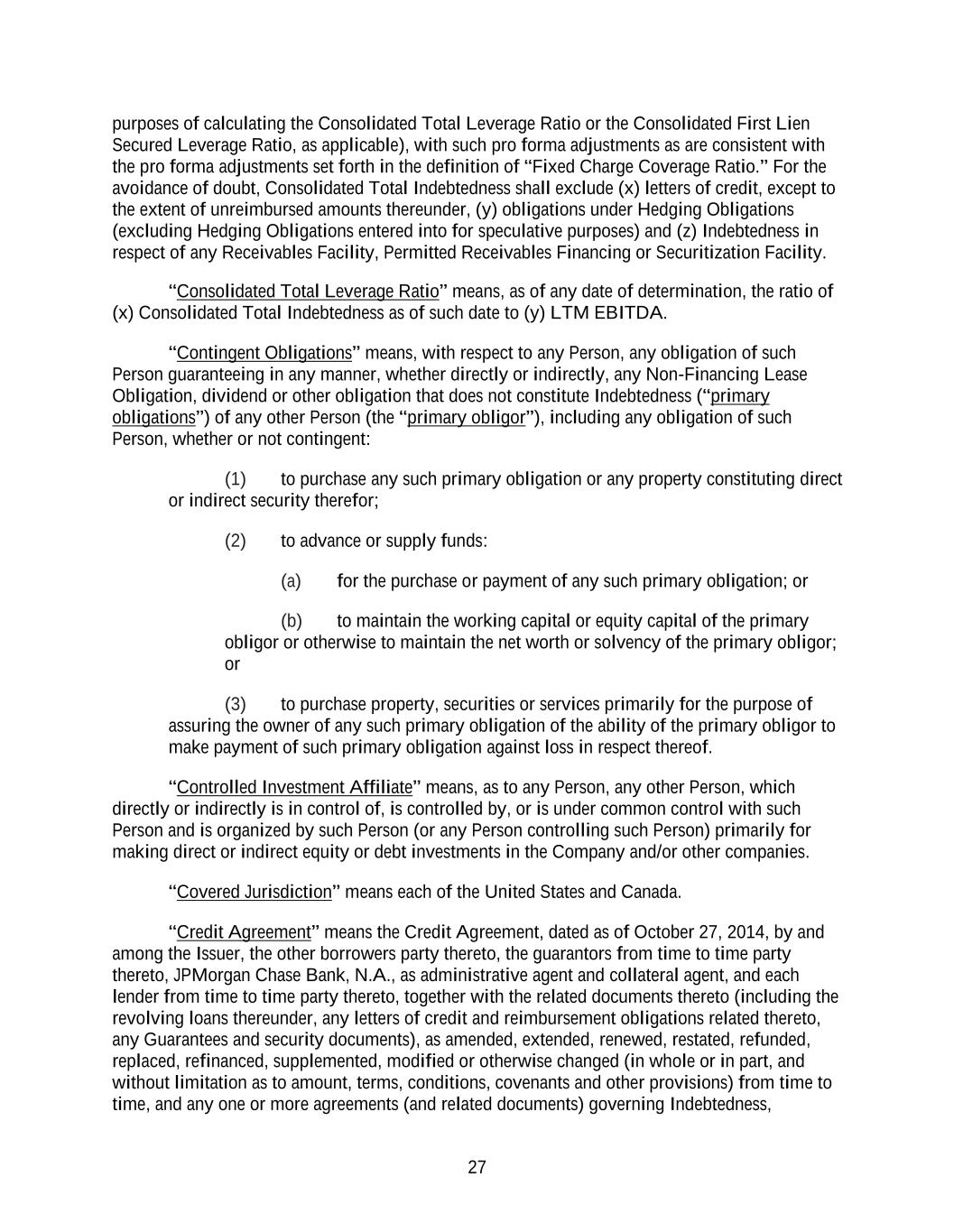 27 purposes of calculating the Consolidated Total Leverage Ratio or the Consolidated First Lien Secured Leverage Ratio, as applicable), with such pro forma adjustments as are consistent with the pro forma adjustments set forth in the definition of “Fixed Charge Coverage Ratio.” For the avoidance of doubt, Consolidated Total Indebtedness shall exclude (x) letters of credit, except to the extent of unreimbursed amounts thereunder, (y) obligations under Hedging Obligations (excluding Hedging Obligations entered into for speculative purposes) and (z) Indebtedness in respect of any Receivables Facility, Permitted Receivables Financing or Securitization Facility. “Consolidated Total Leverage Ratio” means, as of any date of determination, the ratio of (x) Consolidated Total Indebtedness as of such date to (y) LTM EBITDA. “Contingent Obligations” means, with respect to any Person, any obligation of such Person guaranteeing in any manner, whether directly or indirectly, any Non-Financing Lease Obligation, dividend or other obligation that does not constitute Indebtedness (“primary obligations”) of any other Person (the “primary obligor”), including any obligation of such Person, whether or not contingent: (1) to purchase any such primary obligation or any property constituting direct or indirect security therefor; (2) to advance or supply funds: (a) for the purchase or payment of any such primary obligation; or (b) to maintain the working capital or equity capital of the primary obligor or otherwise to maintain the net worth or solvency of the primary obligor; or (3) to purchase property, securities or services primarily for the purpose of assuring the owner of any such primary obligation of the ability of the primary obligor to make payment of such primary obligation against loss in respect thereof. “Controlled Investment Affiliate” means, as to any Person, any other Person, which directly or indirectly is in control of, is controlled by, or is under common control with such Person and is organized by such Person (or any Person controlling such Person) primarily for making direct or indirect equity or debt investments in the Company and/or other companies. “Covered Jurisdiction” means each of the United States and Canada. “Credit Agreement” means the Credit Agreement, dated as of October 27, 2014, by and among the Issuer, the other borrowers party thereto, the guarantors from time to time party thereto, JPMorgan Chase Bank, N.A., as administrative agent and collateral agent, and each lender from time to time party thereto, together with the related documents thereto (including the revolving loans thereunder, any letters of credit and reimbursement obligations related thereto, any Guarantees and security documents), as amended, extended, renewed, restated, refunded, replaced, refinanced, supplemented, modified or otherwise changed (in whole or in part, and without limitation as to amount, terms, conditions, covenants and other provisions) from time to time, and any one or more agreements (and related documents) governing Indebtedness,