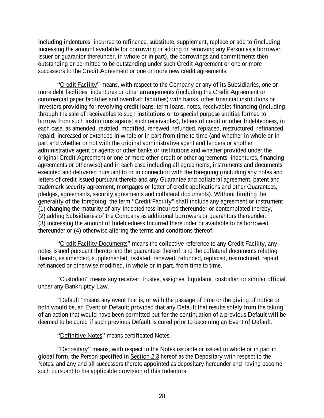 28 including indentures, incurred to refinance, substitute, supplement, replace or add to (including increasing the amount available for borrowing or adding or removing any Person as a borrower, issuer or guarantor thereunder, in whole or in part), the borrowings and commitments then outstanding or permitted to be outstanding under such Credit Agreement or one or more successors to the Credit Agreement or one or more new credit agreements. “Credit Facility” means, with respect to the Company or any of its Subsidiaries, one or more debt facilities, indentures or other arrangements (including the Credit Agreement or commercial paper facilities and overdraft facilities) with banks, other financial institutions or investors providing for revolving credit loans, term loans, notes, receivables financing (including through the sale of receivables to such institutions or to special purpose entities formed to borrow from such institutions against such receivables), letters of credit or other Indebtedness, in each case, as amended, restated, modified, renewed, refunded, replaced, restructured, refinanced, repaid, increased or extended in whole or in part from time to time (and whether in whole or in part and whether or not with the original administrative agent and lenders or another administrative agent or agents or other banks or institutions and whether provided under the original Credit Agreement or one or more other credit or other agreements, indentures, financing agreements or otherwise) and in each case including all agreements, instruments and documents executed and delivered pursuant to or in connection with the foregoing (including any notes and letters of credit issued pursuant thereto and any Guarantee and collateral agreement, patent and trademark security agreement, mortgages or letter of credit applications and other Guarantees, pledges, agreements, security agreements and collateral documents). Without limiting the generality of the foregoing, the term “Credit Facility” shall include any agreement or instrument (1) changing the maturity of any Indebtedness Incurred thereunder or contemplated thereby, (2) adding Subsidiaries of the Company as additional borrowers or guarantors thereunder, (3) increasing the amount of Indebtedness Incurred thereunder or available to be borrowed thereunder or (4) otherwise altering the terms and conditions thereof. “Credit Facility Documents” means the collective reference to any Credit Facility, any notes issued pursuant thereto and the guarantees thereof, and the collateral documents relating thereto, as amended, supplemented, restated, renewed, refunded, replaced, restructured, repaid, refinanced or otherwise modified, in whole or in part, from time to time. “Custodian” means any receiver, trustee, assignee, liquidator, custodian or similar official under any Bankruptcy Law. “Default” means any event that is, or with the passage of time or the giving of notice or both would be, an Event of Default; provided that any Default that results solely from the taking of an action that would have been permitted but for the continuation of a previous Default will be deemed to be cured if such previous Default is cured prior to becoming an Event of Default. “Definitive Notes” means certificated Notes. “Depositary” means, with respect to the Notes issuable or issued in whole or in part in global form, the Person specified in Section 2.3 hereof as the Depositary with respect to the Notes, and any and all successors thereto appointed as depositary hereunder and having become such pursuant to the applicable provision of this Indenture.