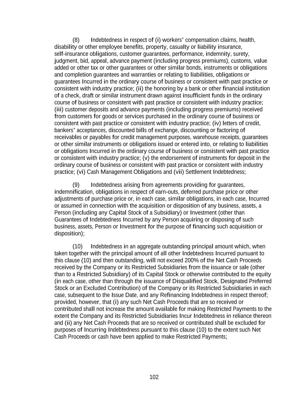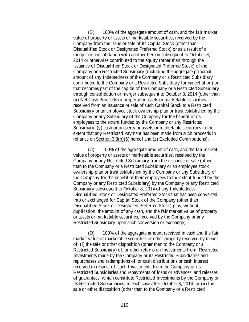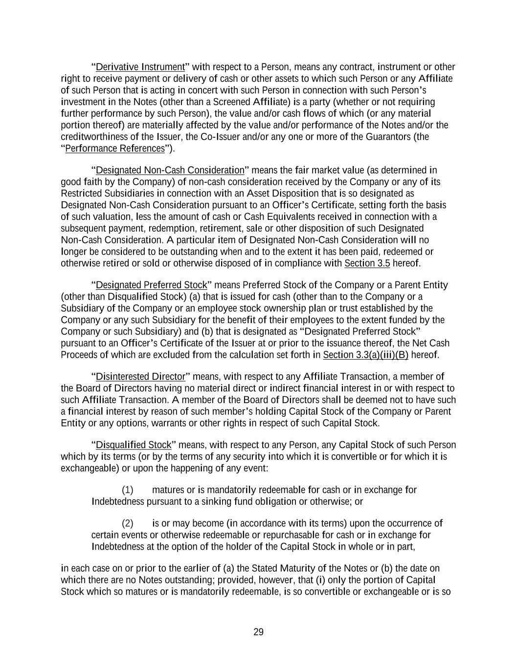 29 “Derivative Instrument” with respect to a Person, means any contract, instrument or other right to receive payment or delivery of cash or other assets to which such Person or any Affiliate of such Person that is acting in concert with such Person in connection with such Person’s investment in the Notes (other than a Screened Affiliate) is a party (whether or not requiring further performance by such Person), the value and/or cash flows of which (or any material portion thereof) are materially affected by the value and/or performance of the Notes and/or the creditworthiness of the Issuer, the Co-Issuer and/or any one or more of the Guarantors (the “Performance References”). “Designated Non-Cash Consideration” means the fair market value (as determined in good faith by the Company) of non-cash consideration received by the Company or any of its Restricted Subsidiaries in connection with an Asset Disposition that is so designated as Designated Non-Cash Consideration pursuant to an Officer’s Certificate, setting forth the basis of such valuation, less the amount of cash or Cash Equivalents received in connection with a subsequent payment, redemption, retirement, sale or other disposition of such Designated Non-Cash Consideration. A particular item of Designated Non-Cash Consideration will no longer be considered to be outstanding when and to the extent it has been paid, redeemed or otherwise retired or sold or otherwise disposed of in compliance with Section 3.5 hereof. “Designated Preferred Stock” means Preferred Stock of the Company or a Parent Entity (other than Disqualified Stock) (a) that is issued for cash (other than to the Company or a Subsidiary of the Company or an employee stock ownership plan or trust established by the Company or any such Subsidiary for the benefit of their employees to the extent funded by the Company or such Subsidiary) and (b) that is designated as “Designated Preferred Stock” pursuant to an Officer’s Certificate of the Issuer at or prior to the issuance thereof, the Net Cash Proceeds of which are excluded from the calculation set forth in Section 3.3(a)(iii)(B) hereof. “Disinterested Director” means, with respect to any Affiliate Transaction, a member of the Board of Directors having no material direct or indirect financial interest in or with respect to such Affiliate Transaction. A member of the Board of Directors shall be deemed not to have such a financial interest by reason of such member’s holding Capital Stock of the Company or Parent Entity or any options, warrants or other rights in respect of such Capital Stock. “Disqualified Stock” means, with respect to any Person, any Capital Stock of such Person which by its terms (or by the terms of any security into which it is convertible or for which it is exchangeable) or upon the happening of any event: (1) matures or is mandatorily redeemable for cash or in exchange for Indebtedness pursuant to a sinking fund obligation or otherwise; or (2) is or may become (in accordance with its terms) upon the occurrence of certain events or otherwise redeemable or repurchasable for cash or in exchange for Indebtedness at the option of the holder of the Capital Stock in whole or in part, in each case on or prior to the earlier of (a) the Stated Maturity of the Notes or (b) the date on which there are no Notes outstanding; provided, however, that (i) only the portion of Capital Stock which so matures or is mandatorily redeemable, is so convertible or exchangeable or is so