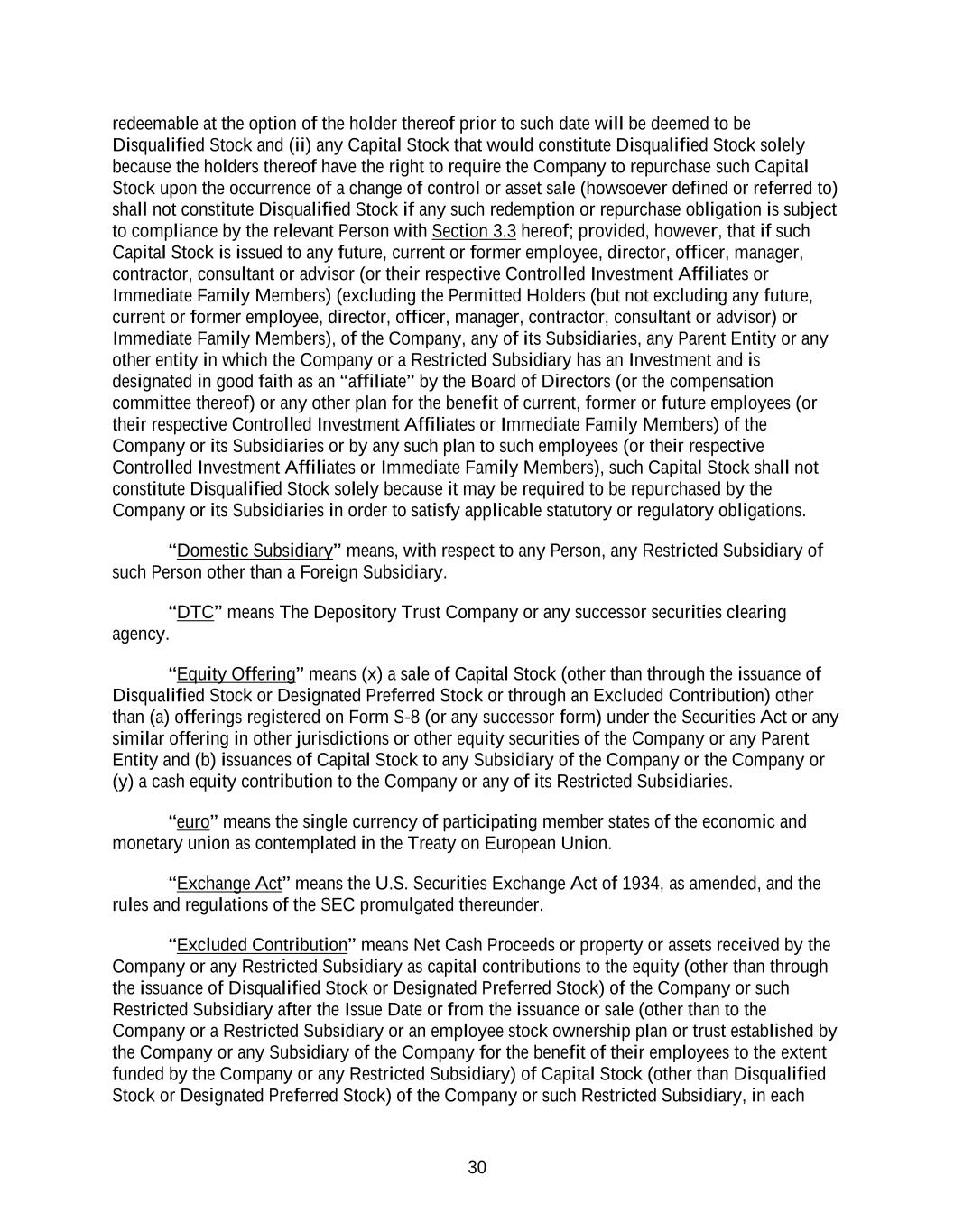 30 redeemable at the option of the holder thereof prior to such date will be deemed to be Disqualified Stock and (ii) any Capital Stock that would constitute Disqualified Stock solely because the holders thereof have the right to require the Company to repurchase such Capital Stock upon the occurrence of a change of control or asset sale (howsoever defined or referred to) shall not constitute Disqualified Stock if any such redemption or repurchase obligation is subject to compliance by the relevant Person with Section 3.3 hereof; provided, however, that if such Capital Stock is issued to any future, current or former employee, director, officer, manager, contractor, consultant or advisor (or their respective Controlled Investment Affiliates or Immediate Family Members) (excluding the Permitted Holders (but not excluding any future, current or former employee, director, officer, manager, contractor, consultant or advisor) or Immediate Family Members), of the Company, any of its Subsidiaries, any Parent Entity or any other entity in which the Company or a Restricted Subsidiary has an Investment and is designated in good faith as an “affiliate” by the Board of Directors (or the compensation committee thereof) or any other plan for the benefit of current, former or future employees (or their respective Controlled Investment Affiliates or Immediate Family Members) of the Company or its Subsidiaries or by any such plan to such employees (or their respective Controlled Investment Affiliates or Immediate Family Members), such Capital Stock shall not constitute Disqualified Stock solely because it may be required to be repurchased by the Company or its Subsidiaries in order to satisfy applicable statutory or regulatory obligations. “Domestic Subsidiary” means, with respect to any Person, any Restricted Subsidiary of such Person other than a Foreign Subsidiary. “DTC” means The Depository Trust Company or any successor securities clearing agency. “Equity Offering” means (x) a sale of Capital Stock (other than through the issuance of Disqualified Stock or Designated Preferred Stock or through an Excluded Contribution) other than (a) offerings registered on Form S-8 (or any successor form) under the Securities Act or any similar offering in other jurisdictions or other equity securities of the Company or any Parent Entity and (b) issuances of Capital Stock to any Subsidiary of the Company or the Company or (y) a cash equity contribution to the Company or any of its Restricted Subsidiaries. “euro” means the single currency of participating member states of the economic and monetary union as contemplated in the Treaty on European Union. “Exchange Act” means the U.S. Securities Exchange Act of 1934, as amended, and the rules and regulations of the SEC promulgated thereunder. “Excluded Contribution” means Net Cash Proceeds or property or assets received by the Company or any Restricted Subsidiary as capital contributions to the equity (other than through the issuance of Disqualified Stock or Designated Preferred Stock) of the Company or such Restricted Subsidiary after the Issue Date or from the issuance or sale (other than to the Company or a Restricted Subsidiary or an employee stock ownership plan or trust established by the Company or any Subsidiary of the Company for the benefit of their employees to the extent funded by the Company or any Restricted Subsidiary) of Capital Stock (other than Disqualified Stock or Designated Preferred Stock) of the Company or such Restricted Subsidiary, in each