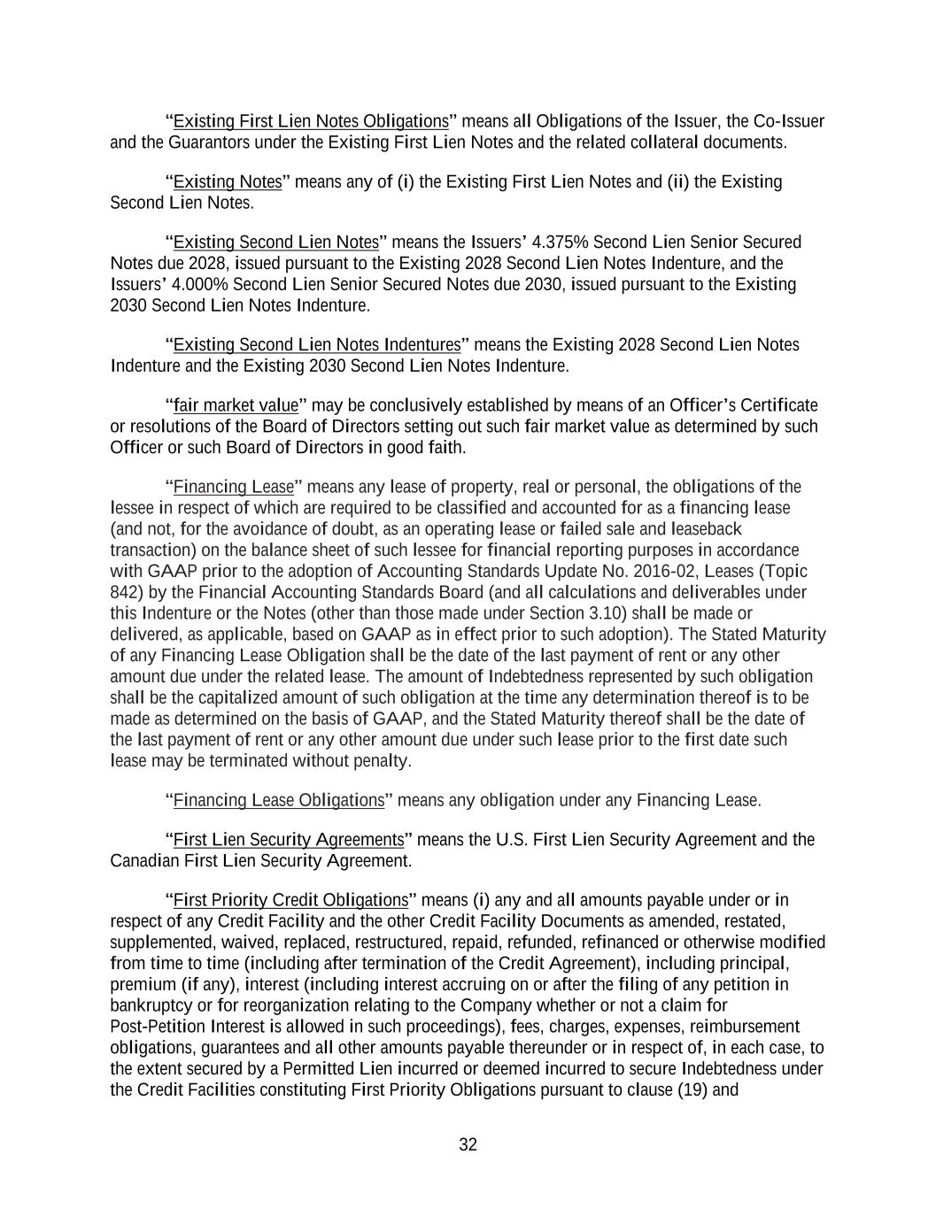 32 “Existing First Lien Notes Obligations” means all Obligations of the Issuer, the Co-Issuer and the Guarantors under the Existing First Lien Notes and the related collateral documents. “Existing Notes” means any of (i) the Existing First Lien Notes and (ii) the Existing Second Lien Notes. “Existing Second Lien Notes” means the Issuers’ 4.375% Second Lien Senior Secured Notes due 2028, issued pursuant to the Existing 2028 Second Lien Notes Indenture, and the Issuers’ 4.000% Second Lien Senior Secured Notes due 2030, issued pursuant to the Existing 2030 Second Lien Notes Indenture. “Existing Second Lien Notes Indentures” means the Existing 2028 Second Lien Notes Indenture and the Existing 2030 Second Lien Notes Indenture. “fair market value” may be conclusively established by means of an Officer’s Certificate or resolutions of the Board of Directors setting out such fair market value as determined by such Officer or such Board of Directors in good faith. “Financing Lease” means any lease of property, real or personal, the obligations of the lessee in respect of which are required to be classified and accounted for as a financing lease (and not, for the avoidance of doubt, as an operating lease or failed sale and leaseback transaction) on the balance sheet of such lessee for financial reporting purposes in accordance with GAAP prior to the adoption of Accounting Standards Update No. 2016-02, Leases (Topic 842) by the Financial Accounting Standards Board (and all calculations and deliverables under this Indenture or the Notes (other than those made under Section 3.10) shall be made or delivered, as applicable, based on GAAP as in effect prior to such adoption). The Stated Maturity of any Financing Lease Obligation shall be the date of the last payment of rent or any other amount due under the related lease. The amount of Indebtedness represented by such obligation shall be the capitalized amount of such obligation at the time any determination thereof is to be made as determined on the basis of GAAP, and the Stated Maturity thereof shall be the date of the last payment of rent or any other amount due under such lease prior to the first date such lease may be terminated without penalty. “Financing Lease Obligations” means any obligation under any Financing Lease. “First Lien Security Agreements” means the U.S. First Lien Security Agreement and the Canadian First Lien Security Agreement. “First Priority Credit Obligations” means (i) any and all amounts payable under or in respect of any Credit Facility and the other Credit Facility Documents as amended, restated, supplemented, waived, replaced, restructured, repaid, refunded, refinanced or otherwise modified from time to time (including after termination of the Credit Agreement), including principal, premium (if any), interest (including interest accruing on or after the filing of any petition in bankruptcy or for reorganization relating to the Company whether or not a claim for Post-Petition Interest is allowed in such proceedings), fees, charges, expenses, reimbursement obligations, guarantees and all other amounts payable thereunder or in respect of, in each case, to the extent secured by a Permitted Lien incurred or deemed incurred to secure Indebtedness under the Credit Facilities constituting First Priority Obligations pursuant to clause (19) and
