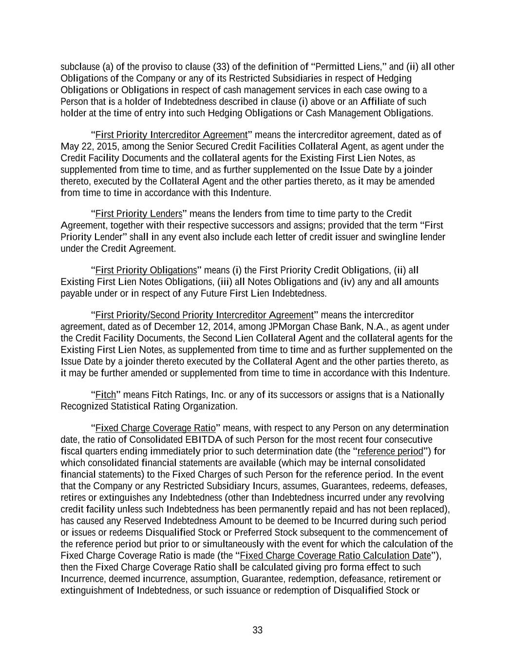 33 subclause (a) of the proviso to clause (33) of the definition of “Permitted Liens,” and (ii) all other Obligations of the Company or any of its Restricted Subsidiaries in respect of Hedging Obligations or Obligations in respect of cash management services in each case owing to a Person that is a holder of Indebtedness described in clause (i) above or an Affiliate of such holder at the time of entry into such Hedging Obligations or Cash Management Obligations. “First Priority Intercreditor Agreement” means the intercreditor agreement, dated as of May 22, 2015, among the Senior Secured Credit Facilities Collateral Agent, as agent under the Credit Facility Documents and the collateral agents for the Existing First Lien Notes, as supplemented from time to time, and as further supplemented on the Issue Date by a joinder thereto, executed by the Collateral Agent and the other parties thereto, as it may be amended from time to time in accordance with this Indenture. “First Priority Lenders” means the lenders from time to time party to the Credit Agreement, together with their respective successors and assigns; provided that the term “First Priority Lender” shall in any event also include each letter of credit issuer and swingline lender under the Credit Agreement. “First Priority Obligations” means (i) the First Priority Credit Obligations, (ii) all Existing First Lien Notes Obligations, (iii) all Notes Obligations and (iv) any and all amounts payable under or in respect of any Future First Lien Indebtedness. “First Priority/Second Priority Intercreditor Agreement” means the intercreditor agreement, dated as of December 12, 2014, among JPMorgan Chase Bank, N.A., as agent under the Credit Facility Documents, the Second Lien Collateral Agent and the collateral agents for the Existing First Lien Notes, as supplemented from time to time and as further supplemented on the Issue Date by a joinder thereto executed by the Collateral Agent and the other parties thereto, as it may be further amended or supplemented from time to time in accordance with this Indenture. “Fitch” means Fitch Ratings, Inc. or any of its successors or assigns that is a Nationally Recognized Statistical Rating Organization. “Fixed Charge Coverage Ratio” means, with respect to any Person on any determination date, the ratio of Consolidated EBITDA of such Person for the most recent four consecutive fiscal quarters ending immediately prior to such determination date (the “reference period”) for which consolidated financial statements are available (which may be internal consolidated financial statements) to the Fixed Charges of such Person for the reference period. In the event that the Company or any Restricted Subsidiary Incurs, assumes, Guarantees, redeems, defeases, retires or extinguishes any Indebtedness (other than Indebtedness incurred under any revolving credit facility unless such Indebtedness has been permanently repaid and has not been replaced), has caused any Reserved Indebtedness Amount to be deemed to be Incurred during such period or issues or redeems Disqualified Stock or Preferred Stock subsequent to the commencement of the reference period but prior to or simultaneously with the event for which the calculation of the Fixed Charge Coverage Ratio is made (the “Fixed Charge Coverage Ratio Calculation Date”), then the Fixed Charge Coverage Ratio shall be calculated giving pro forma effect to such Incurrence, deemed incurrence, assumption, Guarantee, redemption, defeasance, retirement or extinguishment of Indebtedness, or such issuance or redemption of Disqualified Stock or