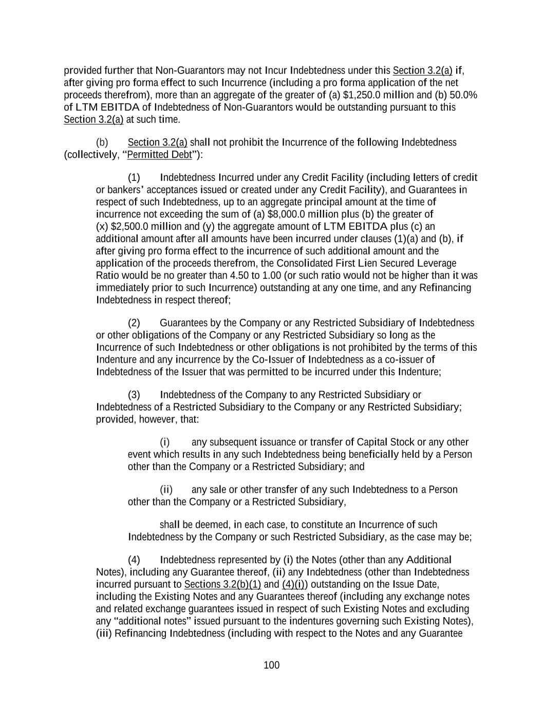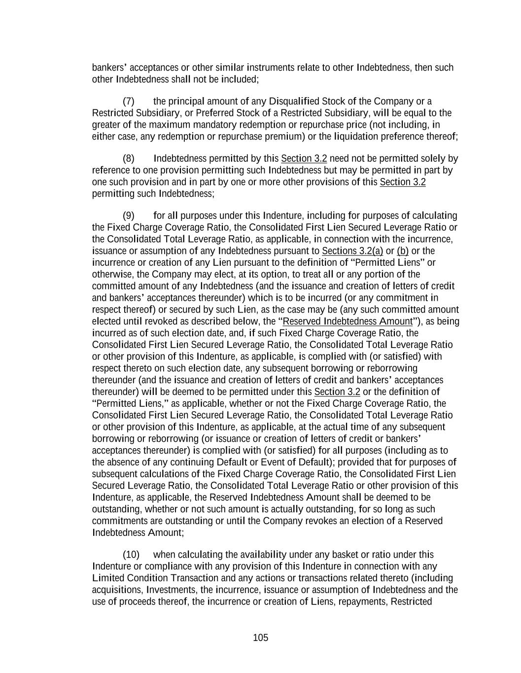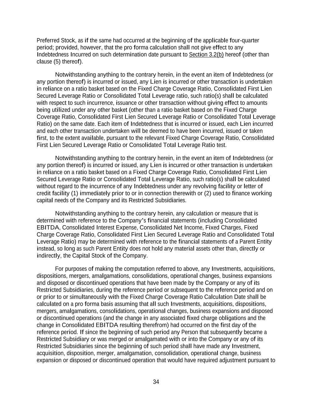 34 Preferred Stock, as if the same had occurred at the beginning of the applicable four-quarter period; provided, however, that the pro forma calculation shall not give effect to any Indebtedness Incurred on such determination date pursuant to Section 3.2(b) hereof (other than clause (5) thereof). Notwithstanding anything to the contrary herein, in the event an item of Indebtedness (or any portion thereof) is incurred or issued, any Lien is incurred or other transaction is undertaken in reliance on a ratio basket based on the Fixed Charge Coverage Ratio, Consolidated First Lien Secured Leverage Ratio or Consolidated Total Leverage ratio, such ratio(s) shall be calculated with respect to such incurrence, issuance or other transaction without giving effect to amounts being utilized under any other basket (other than a ratio basket based on the Fixed Charge Coverage Ratio, Consolidated First Lien Secured Leverage Ratio or Consolidated Total Leverage Ratio) on the same date. Each item of Indebtedness that is incurred or issued, each Lien incurred and each other transaction undertaken will be deemed to have been incurred, issued or taken first, to the extent available, pursuant to the relevant Fixed Charge Coverage Ratio, Consolidated First Lien Secured Leverage Ratio or Consolidated Total Leverage Ratio test. Notwithstanding anything to the contrary herein, in the event an item of Indebtedness (or any portion thereof) is incurred or issued, any Lien is incurred or other transaction is undertaken in reliance on a ratio basket based on a Fixed Charge Coverage Ratio, Consolidated First Lien Secured Leverage Ratio or Consolidated Total Leverage Ratio, such ratio(s) shall be calculated without regard to the incurrence of any Indebtedness under any revolving facility or letter of credit facility (1) immediately prior to or in connection therewith or (2) used to finance working capital needs of the Company and its Restricted Subsidiaries. Notwithstanding anything to the contrary herein, any calculation or measure that is determined with reference to the Company’s financial statements (including Consolidated EBITDA, Consolidated Interest Expense, Consolidated Net Income, Fixed Charges, Fixed Charge Coverage Ratio, Consolidated First Lien Secured Leverage Ratio and Consolidated Total Leverage Ratio) may be determined with reference to the financial statements of a Parent Entity instead, so long as such Parent Entity does not hold any material assets other than, directly or indirectly, the Capital Stock of the Company. For purposes of making the computation referred to above, any Investments, acquisitions, dispositions, mergers, amalgamations, consolidations, operational changes, business expansions and disposed or discontinued operations that have been made by the Company or any of its Restricted Subsidiaries, during the reference period or subsequent to the reference period and on or prior to or simultaneously with the Fixed Charge Coverage Ratio Calculation Date shall be calculated on a pro forma basis assuming that all such Investments, acquisitions, dispositions, mergers, amalgamations, consolidations, operational changes, business expansions and disposed or discontinued operations (and the change in any associated fixed charge obligations and the change in Consolidated EBITDA resulting therefrom) had occurred on the first day of the reference period. If since the beginning of such period any Person that subsequently became a Restricted Subsidiary or was merged or amalgamated with or into the Company or any of its Restricted Subsidiaries since the beginning of such period shall have made any Investment, acquisition, disposition, merger, amalgamation, consolidation, operational change, business expansion or disposed or discontinued operation that would have required adjustment pursuant to