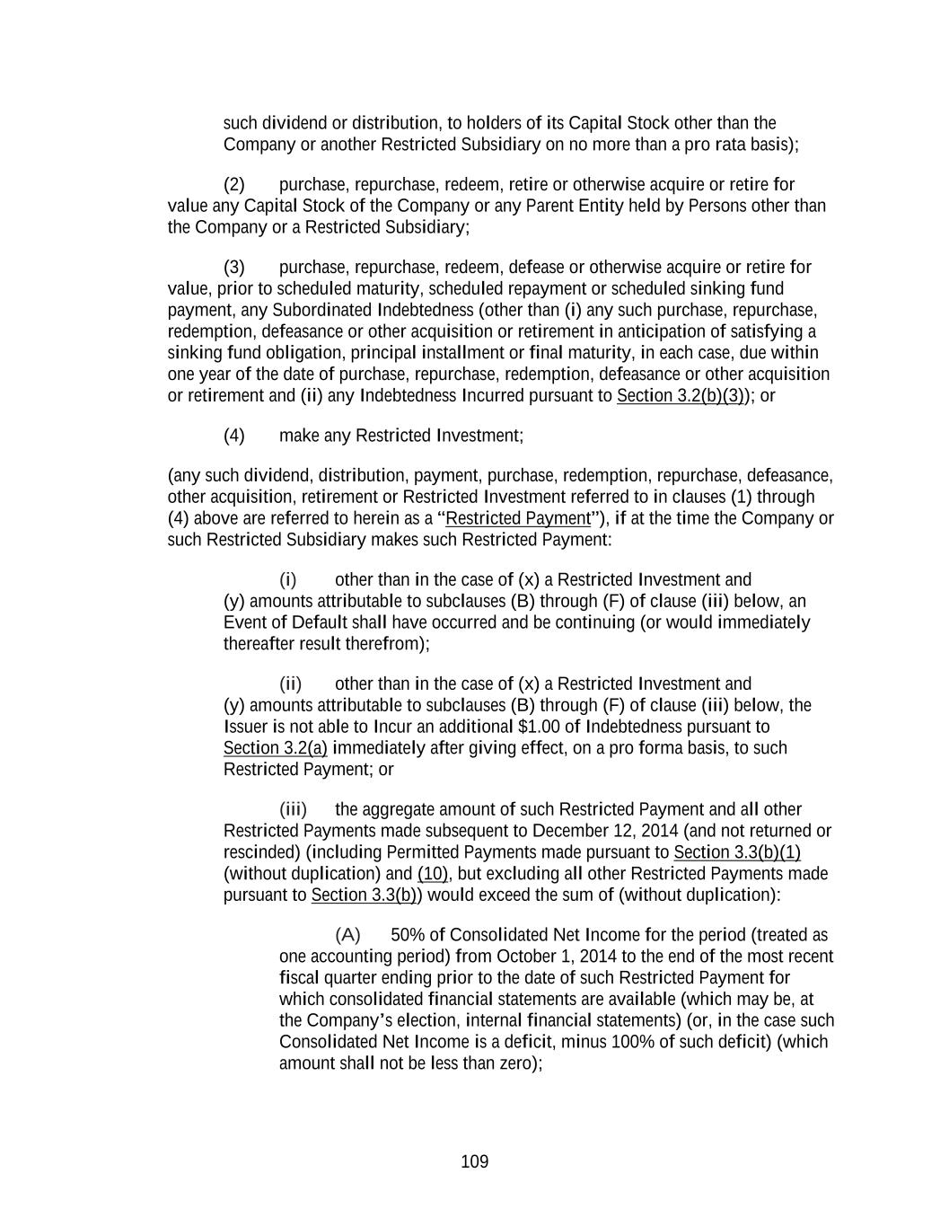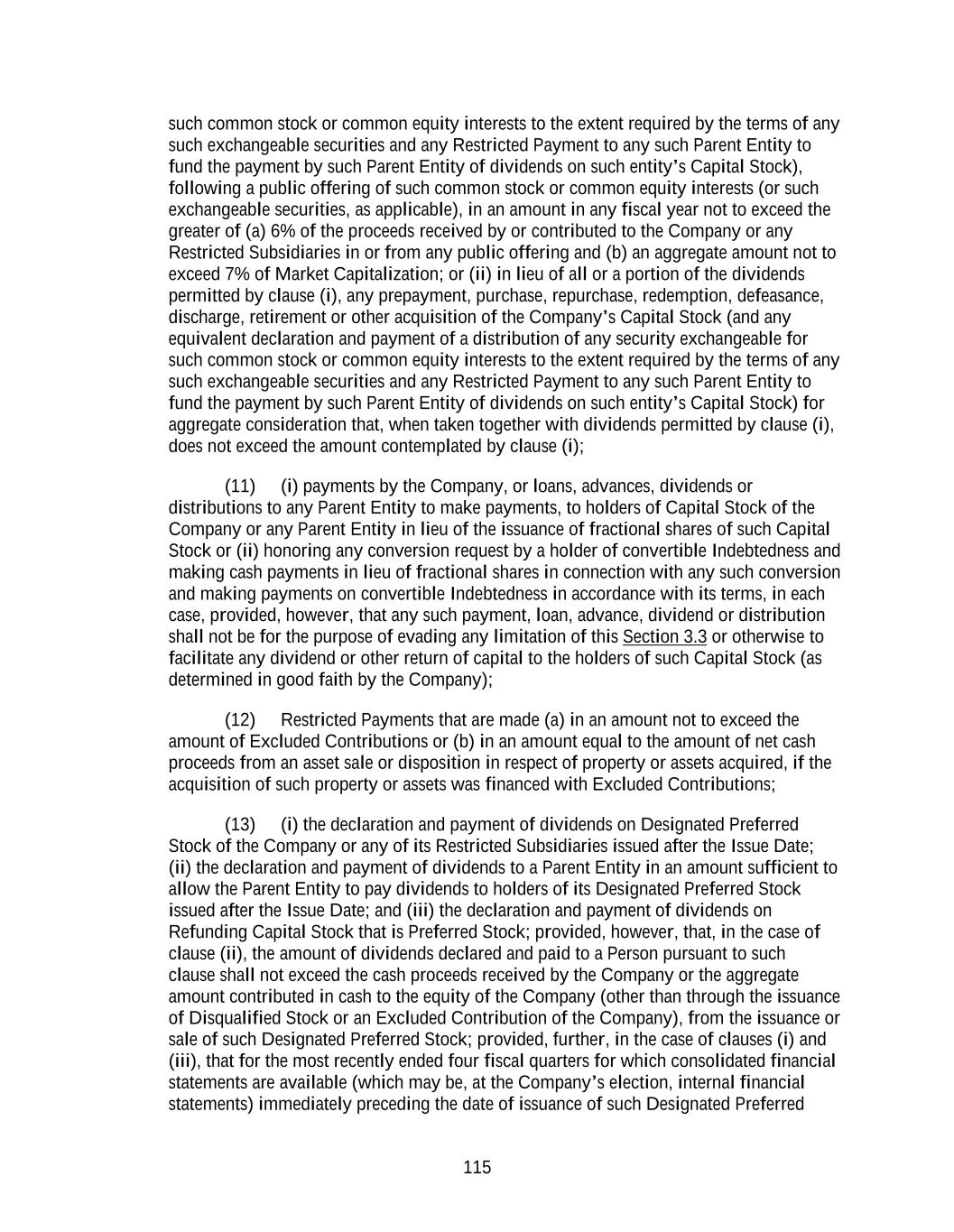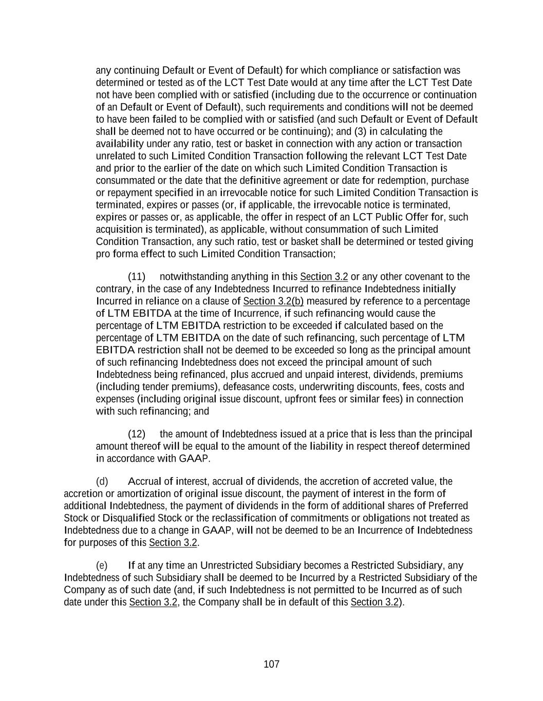 34 Preferred Stock, as if the same had occurred at the beginning of the applicable four-quarter period; provided, however, that the pro forma calculation shall not give effect to any Indebtedness Incurred on such determination date pursuant to Section 3.2(b) hereof (other than clause (5) thereof). Notwithstanding anything to the contrary herein, in the event an item of Indebtedness (or any portion thereof) is incurred or issued, any Lien is incurred or other transaction is undertaken in reliance on a ratio basket based on the Fixed Charge Coverage Ratio, Consolidated First Lien Secured Leverage Ratio or Consolidated Total Leverage ratio, such ratio(s) shall be calculated with respect to such incurrence, issuance or other transaction without giving effect to amounts being utilized under any other basket (other than a ratio basket based on the Fixed Charge Coverage Ratio, Consolidated First Lien Secured Leverage Ratio or Consolidated Total Leverage Ratio) on the same date. Each item of Indebtedness that is incurred or issued, each Lien incurred and each other transaction undertaken will be deemed to have been incurred, issued or taken first, to the extent available, pursuant to the relevant Fixed Charge Coverage Ratio, Consolidated First Lien Secured Leverage Ratio or Consolidated Total Leverage Ratio test. Notwithstanding anything to the contrary herein, in the event an item of Indebtedness (or any portion thereof) is incurred or issued, any Lien is incurred or other transaction is undertaken in reliance on a ratio basket based on a Fixed Charge Coverage Ratio, Consolidated First Lien Secured Leverage Ratio or Consolidated Total Leverage Ratio, such ratio(s) shall be calculated without regard to the incurrence of any Indebtedness under any revolving facility or letter of credit facility (1) immediately prior to or in connection therewith or (2) used to finance working capital needs of the Company and its Restricted Subsidiaries. Notwithstanding anything to the contrary herein, any calculation or measure that is determined with reference to the Company’s financial statements (including Consolidated EBITDA, Consolidated Interest Expense, Consolidated Net Income, Fixed Charges, Fixed Charge Coverage Ratio, Consolidated First Lien Secured Leverage Ratio and Consolidated Total Leverage Ratio) may be determined with reference to the financial statements of a Parent Entity instead, so long as such Parent Entity does not hold any material assets other than, directly or indirectly, the Capital Stock of the Company. For purposes of making the computation referred to above, any Investments, acquisitions, dispositions, mergers, amalgamations, consolidations, operational changes, business expansions and disposed or discontinued operations that have been made by the Company or any of its Restricted Subsidiaries, during the reference period or subsequent to the reference period and on or prior to or simultaneously with the Fixed Charge Coverage Ratio Calculation Date shall be calculated on a pro forma basis assuming that all such Investments, acquisitions, dispositions, mergers, amalgamations, consolidations, operational changes, business expansions and disposed or discontinued operations (and the change in any associated fixed charge obligations and the change in Consolidated EBITDA resulting therefrom) had occurred on the first day of the reference period. If since the beginning of such period any Person that subsequently became a Restricted Subsidiary or was merged or amalgamated with or into the Company or any of its Restricted Subsidiaries since the beginning of such period shall have made any Investment, acquisition, disposition, merger, amalgamation, consolidation, operational change, business expansion or disposed or discontinued operation that would have required adjustment pursuant to