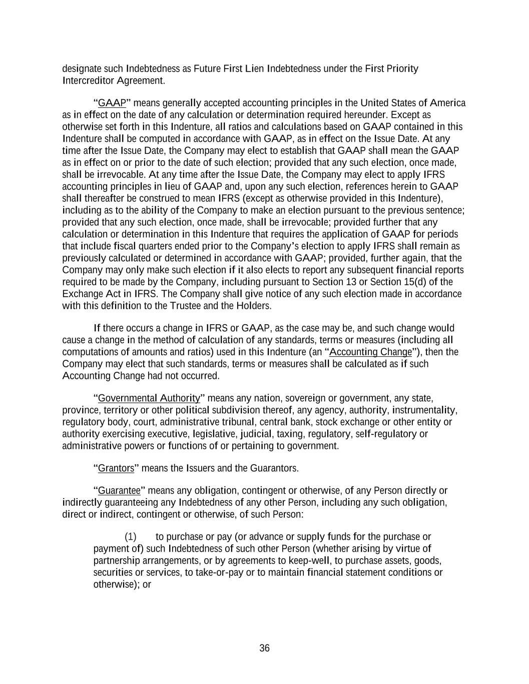 36 designate such Indebtedness as Future First Lien Indebtedness under the First Priority Intercreditor Agreement. “GAAP” means generally accepted accounting principles in the United States of America as in effect on the date of any calculation or determination required hereunder. Except as otherwise set forth in this Indenture, all ratios and calculations based on GAAP contained in this Indenture shall be computed in accordance with GAAP, as in effect on the Issue Date. At any time after the Issue Date, the Company may elect to establish that GAAP shall mean the GAAP as in effect on or prior to the date of such election; provided that any such election, once made, shall be irrevocable. At any time after the Issue Date, the Company may elect to apply IFRS accounting principles in lieu of GAAP and, upon any such election, references herein to GAAP shall thereafter be construed to mean IFRS (except as otherwise provided in this Indenture), including as to the ability of the Company to make an election pursuant to the previous sentence; provided that any such election, once made, shall be irrevocable; provided further that any calculation or determination in this Indenture that requires the application of GAAP for periods that include fiscal quarters ended prior to the Company’s election to apply IFRS shall remain as previously calculated or determined in accordance with GAAP; provided, further again, that the Company may only make such election if it also elects to report any subsequent financial reports required to be made by the Company, including pursuant to Section 13 or Section 15(d) of the Exchange Act in IFRS. The Company shall give notice of any such election made in accordance with this definition to the Trustee and the Holders. If there occurs a change in IFRS or GAAP, as the case may be, and such change would cause a change in the method of calculation of any standards, terms or measures (including all computations of amounts and ratios) used in this Indenture (an “Accounting Change”), then the Company may elect that such standards, terms or measures shall be calculated as if such Accounting Change had not occurred. “Governmental Authority” means any nation, sovereign or government, any state, province, territory or other political subdivision thereof, any agency, authority, instrumentality, regulatory body, court, administrative tribunal, central bank, stock exchange or other entity or authority exercising executive, legislative, judicial, taxing, regulatory, self-regulatory or administrative powers or functions of or pertaining to government. “Grantors” means the Issuers and the Guarantors. “Guarantee” means any obligation, contingent or otherwise, of any Person directly or indirectly guaranteeing any Indebtedness of any other Person, including any such obligation, direct or indirect, contingent or otherwise, of such Person: (1) to purchase or pay (or advance or supply funds for the purchase or payment of) such Indebtedness of such other Person (whether arising by virtue of partnership arrangements, or by agreements to keep-well, to purchase assets, goods, securities or services, to take-or-pay or to maintain financial statement conditions or otherwise); or