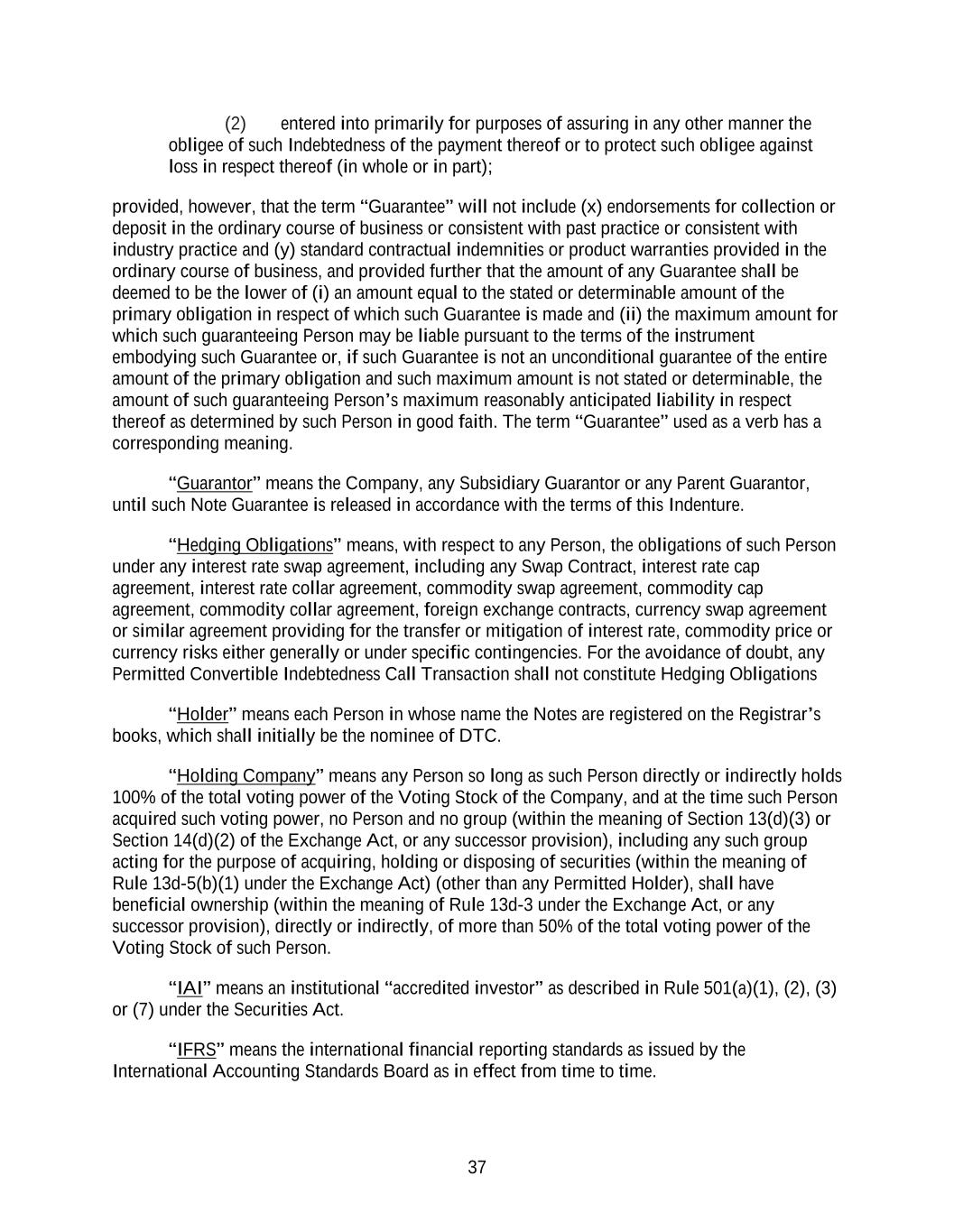 37 (2) entered into primarily for purposes of assuring in any other manner the obligee of such Indebtedness of the payment thereof or to protect such obligee against loss in respect thereof (in whole or in part); provided, however, that the term “Guarantee” will not include (x) endorsements for collection or deposit in the ordinary course of business or consistent with past practice or consistent with industry practice and (y) standard contractual indemnities or product warranties provided in the ordinary course of business, and provided further that the amount of any Guarantee shall be deemed to be the lower of (i) an amount equal to the stated or determinable amount of the primary obligation in respect of which such Guarantee is made and (ii) the maximum amount for which such guaranteeing Person may be liable pursuant to the terms of the instrument embodying such Guarantee or, if such Guarantee is not an unconditional guarantee of the entire amount of the primary obligation and such maximum amount is not stated or determinable, the amount of such guaranteeing Person’s maximum reasonably anticipated liability in respect thereof as determined by such Person in good faith. The term “Guarantee” used as a verb has a corresponding meaning. “Guarantor” means the Company, any Subsidiary Guarantor or any Parent Guarantor, until such Note Guarantee is released in accordance with the terms of this Indenture. “Hedging Obligations” means, with respect to any Person, the obligations of such Person under any interest rate swap agreement, including any Swap Contract, interest rate cap agreement, interest rate collar agreement, commodity swap agreement, commodity cap agreement, commodity collar agreement, foreign exchange contracts, currency swap agreement or similar agreement providing for the transfer or mitigation of interest rate, commodity price or currency risks either generally or under specific contingencies. For the avoidance of doubt, any Permitted Convertible Indebtedness Call Transaction shall not constitute Hedging Obligations “Holder” means each Person in whose name the Notes are registered on the Registrar’s books, which shall initially be the nominee of DTC. “Holding Company” means any Person so long as such Person directly or indirectly holds 100% of the total voting power of the Voting Stock of the Company, and at the time such Person acquired such voting power, no Person and no group (within the meaning of Section 13(d)(3) or Section 14(d)(2) of the Exchange Act, or any successor provision), including any such group acting for the purpose of acquiring, holding or disposing of securities (within the meaning of Rule 13d-5(b)(1) under the Exchange Act) (other than any Permitted Holder), shall have beneficial ownership (within the meaning of Rule 13d-3 under the Exchange Act, or any successor provision), directly or indirectly, of more than 50% of the total voting power of the Voting Stock of such Person. “IAI” means an institutional “accredited investor” as described in Rule 501(a)(1), (2), (3) or (7) under the Securities Act. “IFRS” means the international financial reporting standards as issued by the International Accounting Standards Board as in effect from time to time.