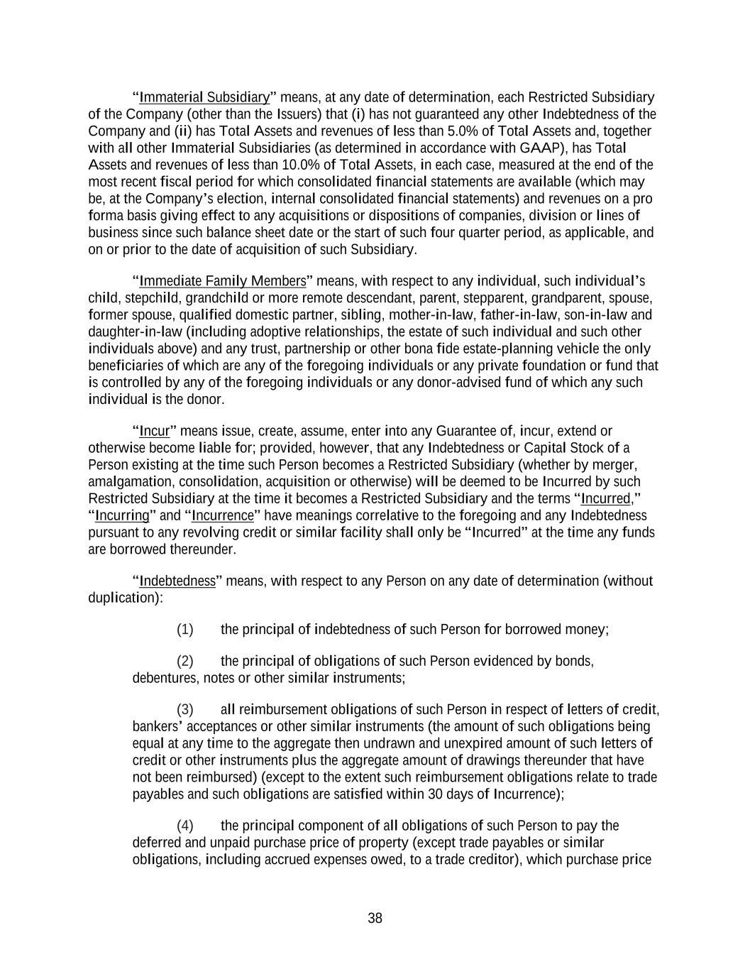 38 “Immaterial Subsidiary” means, at any date of determination, each Restricted Subsidiary of the Company (other than the Issuers) that (i) has not guaranteed any other Indebtedness of the Company and (ii) has Total Assets and revenues of less than 5.0% of Total Assets and, together with all other Immaterial Subsidiaries (as determined in accordance with GAAP), has Total Assets and revenues of less than 10.0% of Total Assets, in each case, measured at the end of the most recent fiscal period for which consolidated financial statements are available (which may be, at the Company’s election, internal consolidated financial statements) and revenues on a pro forma basis giving effect to any acquisitions or dispositions of companies, division or lines of business since such balance sheet date or the start of such four quarter period, as applicable, and on or prior to the date of acquisition of such Subsidiary. “Immediate Family Members” means, with respect to any individual, such individual’s child, stepchild, grandchild or more remote descendant, parent, stepparent, grandparent, spouse, former spouse, qualified domestic partner, sibling, mother-in-law, father-in-law, son-in-law and daughter-in-law (including adoptive relationships, the estate of such individual and such other individuals above) and any trust, partnership or other bona fide estate-planning vehicle the only beneficiaries of which are any of the foregoing individuals or any private foundation or fund that is controlled by any of the foregoing individuals or any donor-advised fund of which any such individual is the donor. “Incur” means issue, create, assume, enter into any Guarantee of, incur, extend or otherwise become liable for; provided, however, that any Indebtedness or Capital Stock of a Person existing at the time such Person becomes a Restricted Subsidiary (whether by merger, amalgamation, consolidation, acquisition or otherwise) will be deemed to be Incurred by such Restricted Subsidiary at the time it becomes a Restricted Subsidiary and the terms “Incurred,” “Incurring” and “Incurrence” have meanings correlative to the foregoing and any Indebtedness pursuant to any revolving credit or similar facility shall only be “Incurred” at the time any funds are borrowed thereunder. “Indebtedness” means, with respect to any Person on any date of determination (without duplication): (1) the principal of indebtedness of such Person for borrowed money; (2) the principal of obligations of such Person evidenced by bonds, debentures, notes or other similar instruments; (3) all reimbursement obligations of such Person in respect of letters of credit, bankers’ acceptances or other similar instruments (the amount of such obligations being equal at any time to the aggregate then undrawn and unexpired amount of such letters of credit or other instruments plus the aggregate amount of drawings thereunder that have not been reimbursed) (except to the extent such reimbursement obligations relate to trade payables and such obligations are satisfied within 30 days of Incurrence); (4) the principal component of all obligations of such Person to pay the deferred and unpaid purchase price of property (except trade payables or similar obligations, including accrued expenses owed, to a trade creditor), which purchase price