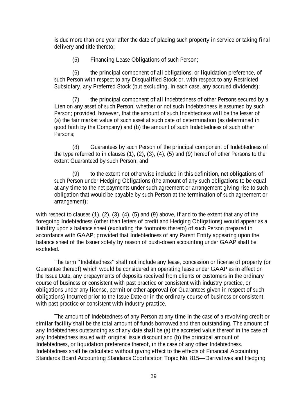 39 is due more than one year after the date of placing such property in service or taking final delivery and title thereto; (5) Financing Lease Obligations of such Person; (6) the principal component of all obligations, or liquidation preference, of such Person with respect to any Disqualified Stock or, with respect to any Restricted Subsidiary, any Preferred Stock (but excluding, in each case, any accrued dividends); (7) the principal component of all Indebtedness of other Persons secured by a Lien on any asset of such Person, whether or not such Indebtedness is assumed by such Person; provided, however, that the amount of such Indebtedness will be the lesser of (a) the fair market value of such asset at such date of determination (as determined in good faith by the Company) and (b) the amount of such Indebtedness of such other Persons; (8) Guarantees by such Person of the principal component of Indebtedness of the type referred to in clauses (1), (2), (3), (4), (5) and (9) hereof of other Persons to the extent Guaranteed by such Person; and (9) to the extent not otherwise included in this definition, net obligations of such Person under Hedging Obligations (the amount of any such obligations to be equal at any time to the net payments under such agreement or arrangement giving rise to such obligation that would be payable by such Person at the termination of such agreement or arrangement); with respect to clauses (1), (2), (3), (4), (5) and (9) above, if and to the extent that any of the foregoing Indebtedness (other than letters of credit and Hedging Obligations) would appear as a liability upon a balance sheet (excluding the footnotes thereto) of such Person prepared in accordance with GAAP; provided that Indebtedness of any Parent Entity appearing upon the balance sheet of the Issuer solely by reason of push-down accounting under GAAP shall be excluded. The term “Indebtedness” shall not include any lease, concession or license of property (or Guarantee thereof) which would be considered an operating lease under GAAP as in effect on the Issue Date, any prepayments of deposits received from clients or customers in the ordinary course of business or consistent with past practice or consistent with industry practice, or obligations under any license, permit or other approval (or Guarantees given in respect of such obligations) Incurred prior to the Issue Date or in the ordinary course of business or consistent with past practice or consistent with industry practice. The amount of Indebtedness of any Person at any time in the case of a revolving credit or similar facility shall be the total amount of funds borrowed and then outstanding. The amount of any Indebtedness outstanding as of any date shall be (a) the accreted value thereof in the case of any Indebtedness issued with original issue discount and (b) the principal amount of Indebtedness, or liquidation preference thereof, in the case of any other Indebtedness. Indebtedness shall be calculated without giving effect to the effects of Financial Accounting Standards Board Accounting Standards Codification Topic No. 815—Derivatives and Hedging