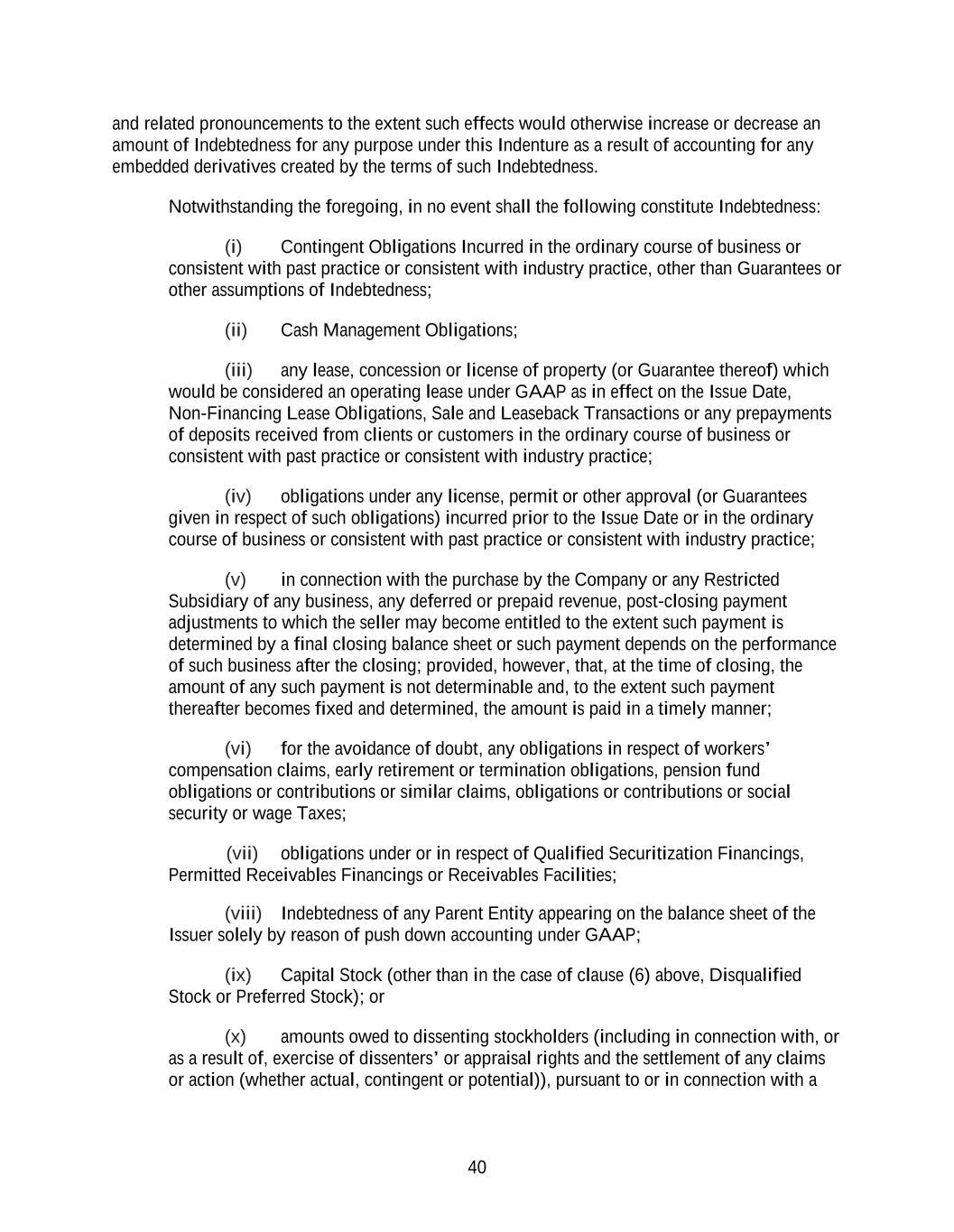 40 and related pronouncements to the extent such effects would otherwise increase or decrease an amount of Indebtedness for any purpose under this Indenture as a result of accounting for any embedded derivatives created by the terms of such Indebtedness. Notwithstanding the foregoing, in no event shall the following constitute Indebtedness: (i) Contingent Obligations Incurred in the ordinary course of business or consistent with past practice or consistent with industry practice, other than Guarantees or other assumptions of Indebtedness; (ii) Cash Management Obligations; (iii) any lease, concession or license of property (or Guarantee thereof) which would be considered an operating lease under GAAP as in effect on the Issue Date, Non-Financing Lease Obligations, Sale and Leaseback Transactions or any prepayments of deposits received from clients or customers in the ordinary course of business or consistent with past practice or consistent with industry practice; (iv) obligations under any license, permit or other approval (or Guarantees given in respect of such obligations) incurred prior to the Issue Date or in the ordinary course of business or consistent with past practice or consistent with industry practice; (v) in connection with the purchase by the Company or any Restricted Subsidiary of any business, any deferred or prepaid revenue, post-closing payment adjustments to which the seller may become entitled to the extent such payment is determined by a final closing balance sheet or such payment depends on the performance of such business after the closing; provided, however, that, at the time of closing, the amount of any such payment is not determinable and, to the extent such payment thereafter becomes fixed and determined, the amount is paid in a timely manner; (vi) for the avoidance of doubt, any obligations in respect of workers’ compensation claims, early retirement or termination obligations, pension fund obligations or contributions or similar claims, obligations or contributions or social security or wage Taxes; (vii) obligations under or in respect of Qualified Securitization Financings, Permitted Receivables Financings or Receivables Facilities; (viii) Indebtedness of any Parent Entity appearing on the balance sheet of the Issuer solely by reason of push down accounting under GAAP; (ix) Capital Stock (other than in the case of clause (6) above, Disqualified Stock or Preferred Stock); or (x) amounts owed to dissenting stockholders (including in connection with, or as a result of, exercise of dissenters’ or appraisal rights and the settlement of any claims or action (whether actual, contingent or potential)), pursuant to or in connection with a