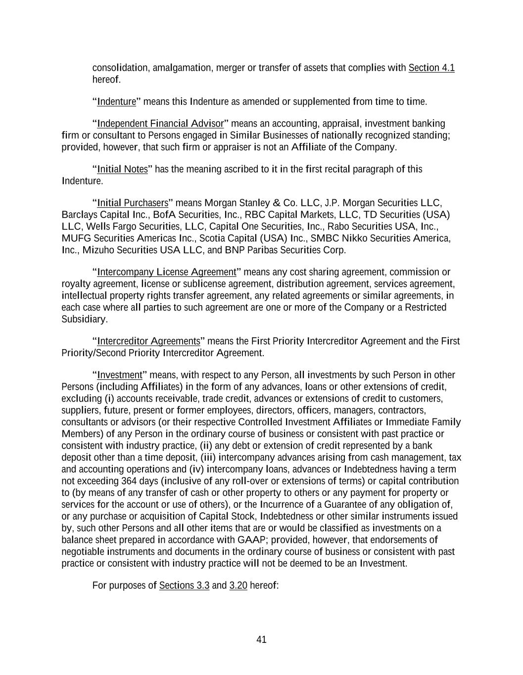 41 consolidation, amalgamation, merger or transfer of assets that complies with Section 4.1 hereof. “Indenture” means this Indenture as amended or supplemented from time to time. “Independent Financial Advisor” means an accounting, appraisal, investment banking firm or consultant to Persons engaged in Similar Businesses of nationally recognized standing; provided, however, that such firm or appraiser is not an Affiliate of the Company. “Initial Notes” has the meaning ascribed to it in the first recital paragraph of this Indenture. “Initial Purchasers” means Morgan Stanley & Co. LLC, J.P. Morgan Securities LLC, Barclays Capital Inc., BofA Securities, Inc., RBC Capital Markets, LLC, TD Securities (USA) LLC, Wells Fargo Securities, LLC, Capital One Securities, Inc., Rabo Securities USA, Inc., MUFG Securities Americas Inc., Scotia Capital (USA) Inc., SMBC Nikko Securities America, Inc., Mizuho Securities USA LLC, and BNP Paribas Securities Corp. “Intercompany License Agreement” means any cost sharing agreement, commission or royalty agreement, license or sublicense agreement, distribution agreement, services agreement, intellectual property rights transfer agreement, any related agreements or similar agreements, in each case where all parties to such agreement are one or more of the Company or a Restricted Subsidiary. “Intercreditor Agreements” means the First Priority Intercreditor Agreement and the First Priority/Second Priority Intercreditor Agreement. “Investment” means, with respect to any Person, all investments by such Person in other Persons (including Affiliates) in the form of any advances, loans or other extensions of credit, excluding (i) accounts receivable, trade credit, advances or extensions of credit to customers, suppliers, future, present or former employees, directors, officers, managers, contractors, consultants or advisors (or their respective Controlled Investment Affiliates or Immediate Family Members) of any Person in the ordinary course of business or consistent with past practice or consistent with industry practice, (ii) any debt or extension of credit represented by a bank deposit other than a time deposit, (iii) intercompany advances arising from cash management, tax and accounting operations and (iv) intercompany loans, advances or Indebtedness having a term not exceeding 364 days (inclusive of any roll-over or extensions of terms) or capital contribution to (by means of any transfer of cash or other property to others or any payment for property or services for the account or use of others), or the Incurrence of a Guarantee of any obligation of, or any purchase or acquisition of Capital Stock, Indebtedness or other similar instruments issued by, such other Persons and all other items that are or would be classified as investments on a balance sheet prepared in accordance with GAAP; provided, however, that endorsements of negotiable instruments and documents in the ordinary course of business or consistent with past practice or consistent with industry practice will not be deemed to be an Investment. For purposes of Sections 3.3 and 3.20 hereof: