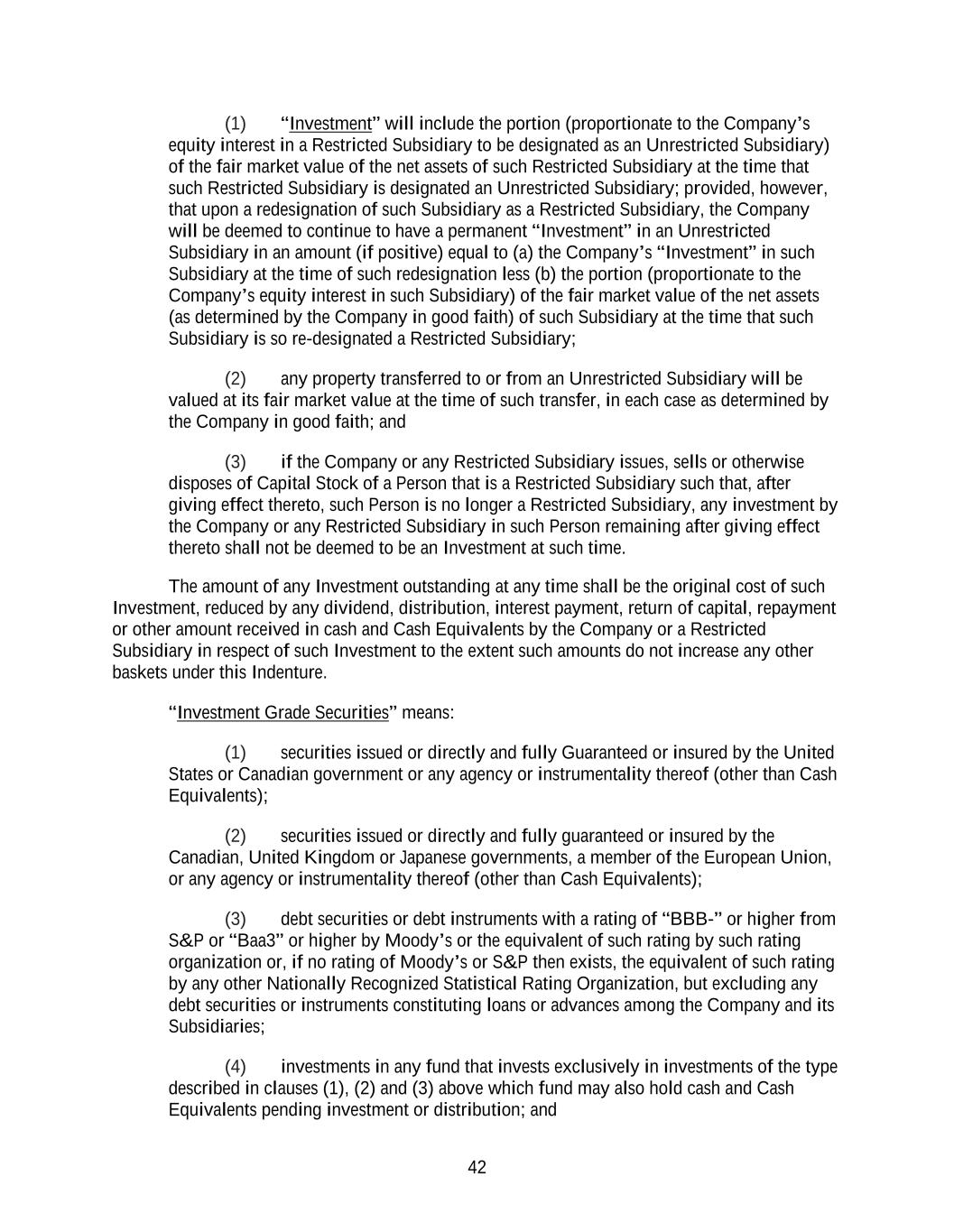 42 (1) “Investment” will include the portion (proportionate to the Company’s equity interest in a Restricted Subsidiary to be designated as an Unrestricted Subsidiary) of the fair market value of the net assets of such Restricted Subsidiary at the time that such Restricted Subsidiary is designated an Unrestricted Subsidiary; provided, however, that upon a redesignation of such Subsidiary as a Restricted Subsidiary, the Company will be deemed to continue to have a permanent “Investment” in an Unrestricted Subsidiary in an amount (if positive) equal to (a) the Company’s “Investment” in such Subsidiary at the time of such redesignation less (b) the portion (proportionate to the Company’s equity interest in such Subsidiary) of the fair market value of the net assets (as determined by the Company in good faith) of such Subsidiary at the time that such Subsidiary is so re-designated a Restricted Subsidiary; (2) any property transferred to or from an Unrestricted Subsidiary will be valued at its fair market value at the time of such transfer, in each case as determined by the Company in good faith; and (3) if the Company or any Restricted Subsidiary issues, sells or otherwise disposes of Capital Stock of a Person that is a Restricted Subsidiary such that, after giving effect thereto, such Person is no longer a Restricted Subsidiary, any investment by the Company or any Restricted Subsidiary in such Person remaining after giving effect thereto shall not be deemed to be an Investment at such time. The amount of any Investment outstanding at any time shall be the original cost of such Investment, reduced by any dividend, distribution, interest payment, return of capital, repayment or other amount received in cash and Cash Equivalents by the Company or a Restricted Subsidiary in respect of such Investment to the extent such amounts do not increase any other baskets under this Indenture. “Investment Grade Securities” means: (1) securities issued or directly and fully Guaranteed or insured by the United States or Canadian government or any agency or instrumentality thereof (other than Cash Equivalents); (2) securities issued or directly and fully guaranteed or insured by the Canadian, United Kingdom or Japanese governments, a member of the European Union, or any agency or instrumentality thereof (other than Cash Equivalents); (3) debt securities or debt instruments with a rating of “BBB-” or higher from S&P or “Baa3” or higher by Moody’s or the equivalent of such rating by such rating organization or, if no rating of Moody’s or S&P then exists, the equivalent of such rating by any other Nationally Recognized Statistical Rating Organization, but excluding any debt securities or instruments constituting loans or advances among the Company and its Subsidiaries; (4) investments in any fund that invests exclusively in investments of the type described in clauses (1), (2) and (3) above which fund may also hold cash and Cash Equivalents pending investment or distribution; and