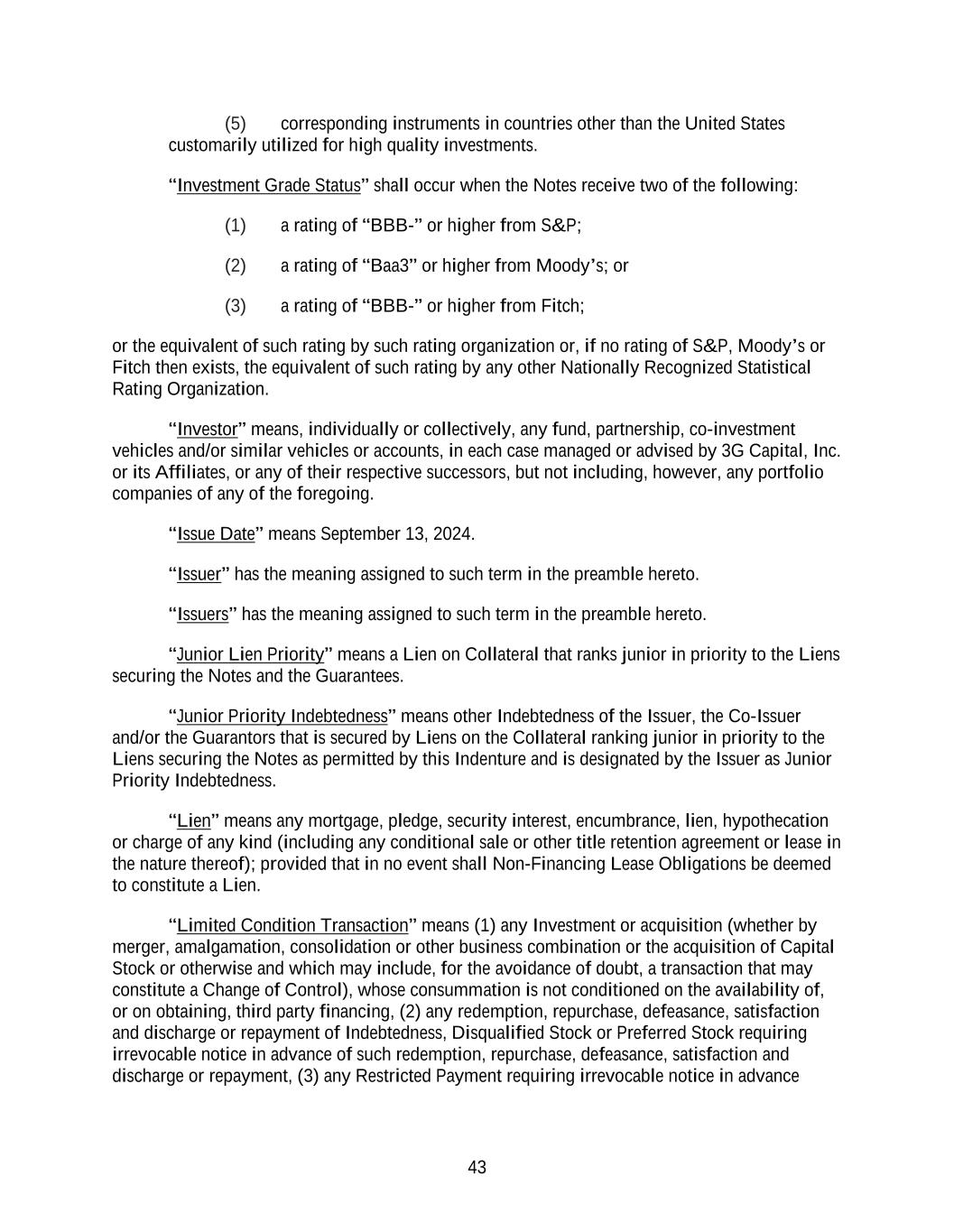 43 (5) corresponding instruments in countries other than the United States customarily utilized for high quality investments. “Investment Grade Status” shall occur when the Notes receive two of the following: (1) a rating of “BBB-” or higher from S&P; (2) a rating of “Baa3” or higher from Moody’s; or (3) a rating of “BBB-” or higher from Fitch; or the equivalent of such rating by such rating organization or, if no rating of S&P, Moody’s or Fitch then exists, the equivalent of such rating by any other Nationally Recognized Statistical Rating Organization. “Investor” means, individually or collectively, any fund, partnership, co-investment vehicles and/or similar vehicles or accounts, in each case managed or advised by 3G Capital, Inc. or its Affiliates, or any of their respective successors, but not including, however, any portfolio companies of any of the foregoing. “Issue Date” means September 13, 2024. “Issuer” has the meaning assigned to such term in the preamble hereto. “Issuers” has the meaning assigned to such term in the preamble hereto. “Junior Lien Priority” means a Lien on Collateral that ranks junior in priority to the Liens securing the Notes and the Guarantees. “Junior Priority Indebtedness” means other Indebtedness of the Issuer, the Co-Issuer and/or the Guarantors that is secured by Liens on the Collateral ranking junior in priority to the Liens securing the Notes as permitted by this Indenture and is designated by the Issuer as Junior Priority Indebtedness. “Lien” means any mortgage, pledge, security interest, encumbrance, lien, hypothecation or charge of any kind (including any conditional sale or other title retention agreement or lease in the nature thereof); provided that in no event shall Non-Financing Lease Obligations be deemed to constitute a Lien. “Limited Condition Transaction” means (1) any Investment or acquisition (whether by merger, amalgamation, consolidation or other business combination or the acquisition of Capital Stock or otherwise and which may include, for the avoidance of doubt, a transaction that may constitute a Change of Control), whose consummation is not conditioned on the availability of, or on obtaining, third party financing, (2) any redemption, repurchase, defeasance, satisfaction and discharge or repayment of Indebtedness, Disqualified Stock or Preferred Stock requiring irrevocable notice in advance of such redemption, repurchase, defeasance, satisfaction and discharge or repayment, (3) any Restricted Payment requiring irrevocable notice in advance