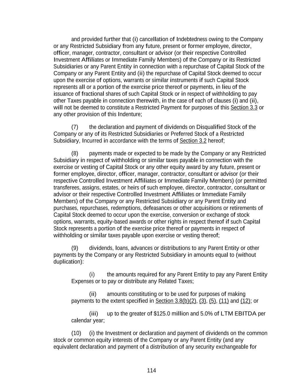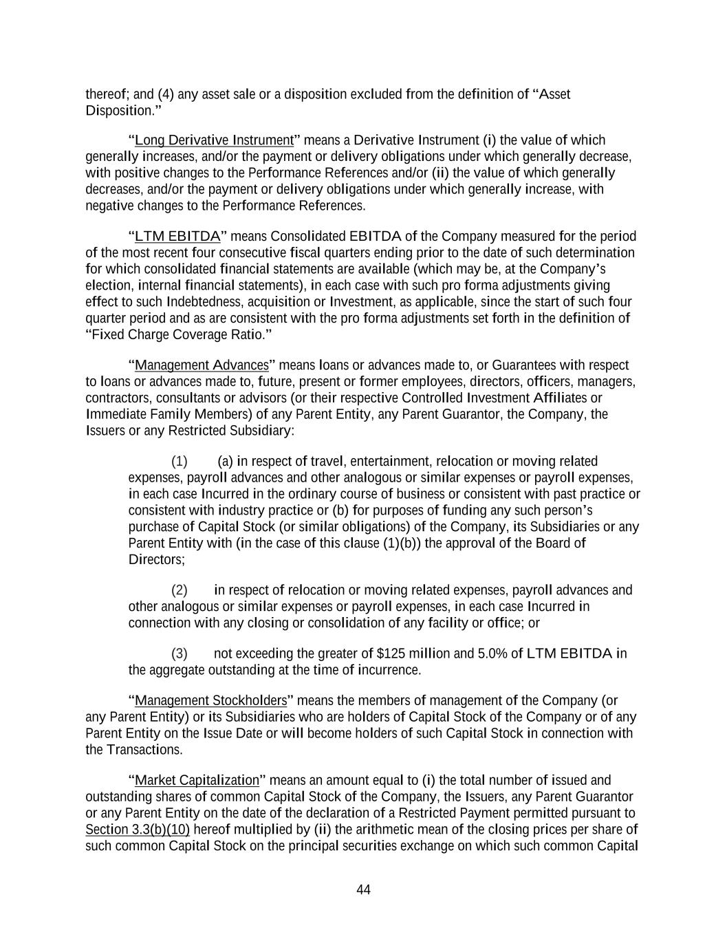44 thereof; and (4) any asset sale or a disposition excluded from the definition of “Asset Disposition.” “Long Derivative Instrument” means a Derivative Instrument (i) the value of which generally increases, and/or the payment or delivery obligations under which generally decrease, with positive changes to the Performance References and/or (ii) the value of which generally decreases, and/or the payment or delivery obligations under which generally increase, with negative changes to the Performance References. “LTM EBITDA” means Consolidated EBITDA of the Company measured for the period of the most recent four consecutive fiscal quarters ending prior to the date of such determination for which consolidated financial statements are available (which may be, at the Company’s election, internal financial statements), in each case with such pro forma adjustments giving effect to such Indebtedness, acquisition or Investment, as applicable, since the start of such four quarter period and as are consistent with the pro forma adjustments set forth in the definition of “Fixed Charge Coverage Ratio.” “Management Advances” means loans or advances made to, or Guarantees with respect to loans or advances made to, future, present or former employees, directors, officers, managers, contractors, consultants or advisors (or their respective Controlled Investment Affiliates or Immediate Family Members) of any Parent Entity, any Parent Guarantor, the Company, the Issuers or any Restricted Subsidiary: (1) (a) in respect of travel, entertainment, relocation or moving related expenses, payroll advances and other analogous or similar expenses or payroll expenses, in each case Incurred in the ordinary course of business or consistent with past practice or consistent with industry practice or (b) for purposes of funding any such person’s purchase of Capital Stock (or similar obligations) of the Company, its Subsidiaries or any Parent Entity with (in the case of this clause (1)(b)) the approval of the Board of Directors; (2) in respect of relocation or moving related expenses, payroll advances and other analogous or similar expenses or payroll expenses, in each case Incurred in connection with any closing or consolidation of any facility or office; or (3) not exceeding the greater of $125 million and 5.0% of LTM EBITDA in the aggregate outstanding at the time of incurrence. “Management Stockholders” means the members of management of the Company (or any Parent Entity) or its Subsidiaries who are holders of Capital Stock of the Company or of any Parent Entity on the Issue Date or will become holders of such Capital Stock in connection with the Transactions. “Market Capitalization” means an amount equal to (i) the total number of issued and outstanding shares of common Capital Stock of the Company, the Issuers, any Parent Guarantor or any Parent Entity on the date of the declaration of a Restricted Payment permitted pursuant to Section 3.3(b)(10) hereof multiplied by (ii) the arithmetic mean of the closing prices per share of such common Capital Stock on the principal securities exchange on which such common Capital