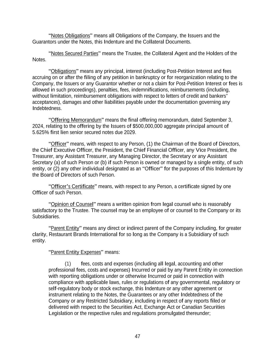 47 “Notes Obligations” means all Obligations of the Company, the Issuers and the Guarantors under the Notes, this Indenture and the Collateral Documents. “Notes Secured Parties” means the Trustee, the Collateral Agent and the Holders of the Notes. “Obligations” means any principal, interest (including Post-Petition Interest and fees accruing on or after the filing of any petition in bankruptcy or for reorganization relating to the Company, the Issuers or any Guarantor whether or not a claim for Post-Petition Interest or fees is allowed in such proceedings), penalties, fees, indemnifications, reimbursements (including, without limitation, reimbursement obligations with respect to letters of credit and bankers’ acceptances), damages and other liabilities payable under the documentation governing any Indebtedness. “Offering Memorandum” means the final offering memorandum, dated September 3, 2024, relating to the offering by the Issuers of $500,000,000 aggregate principal amount of 5.625% first lien senior secured notes due 2029. “Officer” means, with respect to any Person, (1) the Chairman of the Board of Directors, the Chief Executive Officer, the President, the Chief Financial Officer, any Vice President, the Treasurer, any Assistant Treasurer, any Managing Director, the Secretary or any Assistant Secretary (a) of such Person or (b) if such Person is owned or managed by a single entity, of such entity, or (2) any other individual designated as an “Officer” for the purposes of this Indenture by the Board of Directors of such Person. “Officer’s Certificate” means, with respect to any Person, a certificate signed by one Officer of such Person. “Opinion of Counsel” means a written opinion from legal counsel who is reasonably satisfactory to the Trustee. The counsel may be an employee of or counsel to the Company or its Subsidiaries. “Parent Entity” means any direct or indirect parent of the Company including, for greater clarity, Restaurant Brands International for so long as the Company is a Subsidiary of such entity. “Parent Entity Expenses” means: (1) fees, costs and expenses (including all legal, accounting and other professional fees, costs and expenses) Incurred or paid by any Parent Entity in connection with reporting obligations under or otherwise Incurred or paid in connection with compliance with applicable laws, rules or regulations of any governmental, regulatory or self-regulatory body or stock exchange, this Indenture or any other agreement or instrument relating to the Notes, the Guarantees or any other Indebtedness of the Company or any Restricted Subsidiary, including in respect of any reports filed or delivered with respect to the Securities Act, Exchange Act or Canadian Securities Legislation or the respective rules and regulations promulgated thereunder;