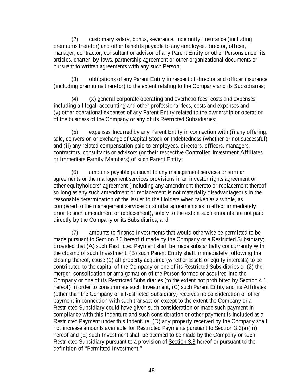 48 (2) customary salary, bonus, severance, indemnity, insurance (including premiums therefor) and other benefits payable to any employee, director, officer, manager, contractor, consultant or advisor of any Parent Entity or other Persons under its articles, charter, by-laws, partnership agreement or other organizational documents or pursuant to written agreements with any such Person; (3) obligations of any Parent Entity in respect of director and officer insurance (including premiums therefor) to the extent relating to the Company and its Subsidiaries; (4) (x) general corporate operating and overhead fees, costs and expenses, including all legal, accounting and other professional fees, costs and expenses and (y) other operational expenses of any Parent Entity related to the ownership or operation of the business of the Company or any of its Restricted Subsidiaries; (5) expenses Incurred by any Parent Entity in connection with (i) any offering, sale, conversion or exchange of Capital Stock or Indebtedness (whether or not successful) and (ii) any related compensation paid to employees, directors, officers, managers, contractors, consultants or advisors (or their respective Controlled Investment Affiliates or Immediate Family Members) of such Parent Entity; (6) amounts payable pursuant to any management services or similar agreements or the management services provisions in an investor rights agreement or other equityholders’ agreement (including any amendment thereto or replacement thereof so long as any such amendment or replacement is not materially disadvantageous in the reasonable determination of the Issuer to the Holders when taken as a whole, as compared to the management services or similar agreements as in effect immediately prior to such amendment or replacement), solely to the extent such amounts are not paid directly by the Company or its Subsidiaries; and (7) amounts to finance Investments that would otherwise be permitted to be made pursuant to Section 3.3 hereof if made by the Company or a Restricted Subsidiary; provided that (A) such Restricted Payment shall be made substantially concurrently with the closing of such Investment, (B) such Parent Entity shall, immediately following the closing thereof, cause (1) all property acquired (whether assets or equity interests) to be contributed to the capital of the Company or one of its Restricted Subsidiaries or (2) the merger, consolidation or amalgamation of the Person formed or acquired into the Company or one of its Restricted Subsidiaries (to the extent not prohibited by Section 4.1 hereof) in order to consummate such Investment, (C) such Parent Entity and its Affiliates (other than the Company or a Restricted Subsidiary) receives no consideration or other payment in connection with such transaction except to the extent the Company or a Restricted Subsidiary could have given such consideration or made such payment in compliance with this Indenture and such consideration or other payment is included as a Restricted Payment under this Indenture, (D) any property received by the Company shall not increase amounts available for Restricted Payments pursuant to Section 3.3(a)(iii) hereof and (E) such Investment shall be deemed to be made by the Company or such Restricted Subsidiary pursuant to a provision of Section 3.3 hereof or pursuant to the definition of “Permitted Investment.”