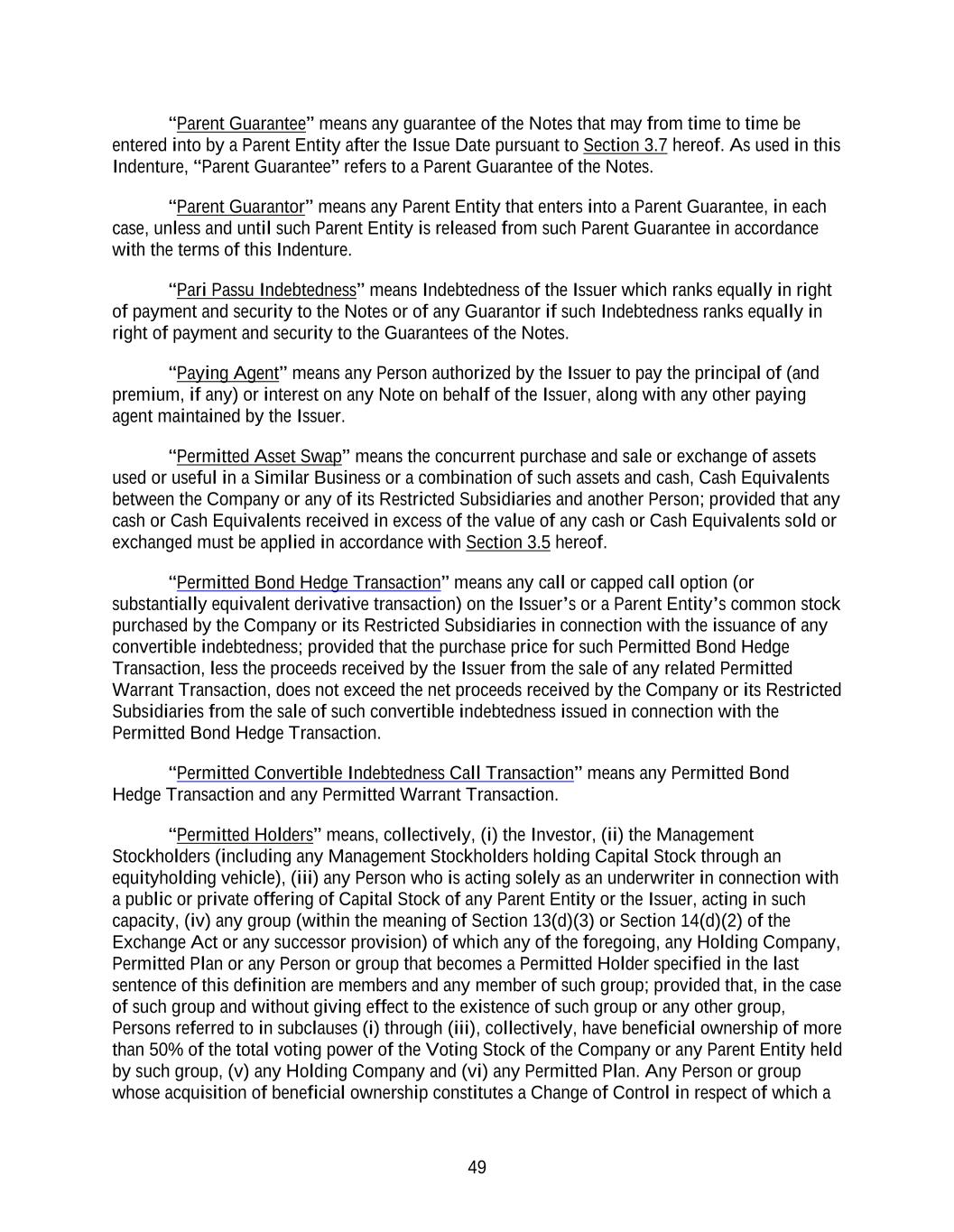 49 “Parent Guarantee” means any guarantee of the Notes that may from time to time be entered into by a Parent Entity after the Issue Date pursuant to Section 3.7 hereof. As used in this Indenture, “Parent Guarantee” refers to a Parent Guarantee of the Notes. “Parent Guarantor” means any Parent Entity that enters into a Parent Guarantee, in each case, unless and until such Parent Entity is released from such Parent Guarantee in accordance with the terms of this Indenture. “Pari Passu Indebtedness” means Indebtedness of the Issuer which ranks equally in right of payment and security to the Notes or of any Guarantor if such Indebtedness ranks equally in right of payment and security to the Guarantees of the Notes. “Paying Agent” means any Person authorized by the Issuer to pay the principal of (and premium, if any) or interest on any Note on behalf of the Issuer, along with any other paying agent maintained by the Issuer. “Permitted Asset Swap” means the concurrent purchase and sale or exchange of assets used or useful in a Similar Business or a combination of such assets and cash, Cash Equivalents between the Company or any of its Restricted Subsidiaries and another Person; provided that any cash or Cash Equivalents received in excess of the value of any cash or Cash Equivalents sold or exchanged must be applied in accordance with Section 3.5 hereof. “Permitted Bond Hedge Transaction” means any call or capped call option (or substantially equivalent derivative transaction) on the Issuer’s or a Parent Entity’s common stock purchased by the Company or its Restricted Subsidiaries in connection with the issuance of any convertible indebtedness; provided that the purchase price for such Permitted Bond Hedge Transaction, less the proceeds received by the Issuer from the sale of any related Permitted Warrant Transaction, does not exceed the net proceeds received by the Company or its Restricted Subsidiaries from the sale of such convertible indebtedness issued in connection with the Permitted Bond Hedge Transaction. “Permitted Convertible Indebtedness Call Transaction” means any Permitted Bond Hedge Transaction and any Permitted Warrant Transaction. “Permitted Holders” means, collectively, (i) the Investor, (ii) the Management Stockholders (including any Management Stockholders holding Capital Stock through an equityholding vehicle), (iii) any Person who is acting solely as an underwriter in connection with a public or private offering of Capital Stock of any Parent Entity or the Issuer, acting in such capacity, (iv) any group (within the meaning of Section 13(d)(3) or Section 14(d)(2) of the Exchange Act or any successor provision) of which any of the foregoing, any Holding Company, Permitted Plan or any Person or group that becomes a Permitted Holder specified in the last sentence of this definition are members and any member of such group; provided that, in the case of such group and without giving effect to the existence of such group or any other group, Persons referred to in subclauses (i) through (iii), collectively, have beneficial ownership of more than 50% of the total voting power of the Voting Stock of the Company or any Parent Entity held by such group, (v) any Holding Company and (vi) any Permitted Plan. Any Person or group whose acquisition of beneficial ownership constitutes a Change of Control in respect of which a