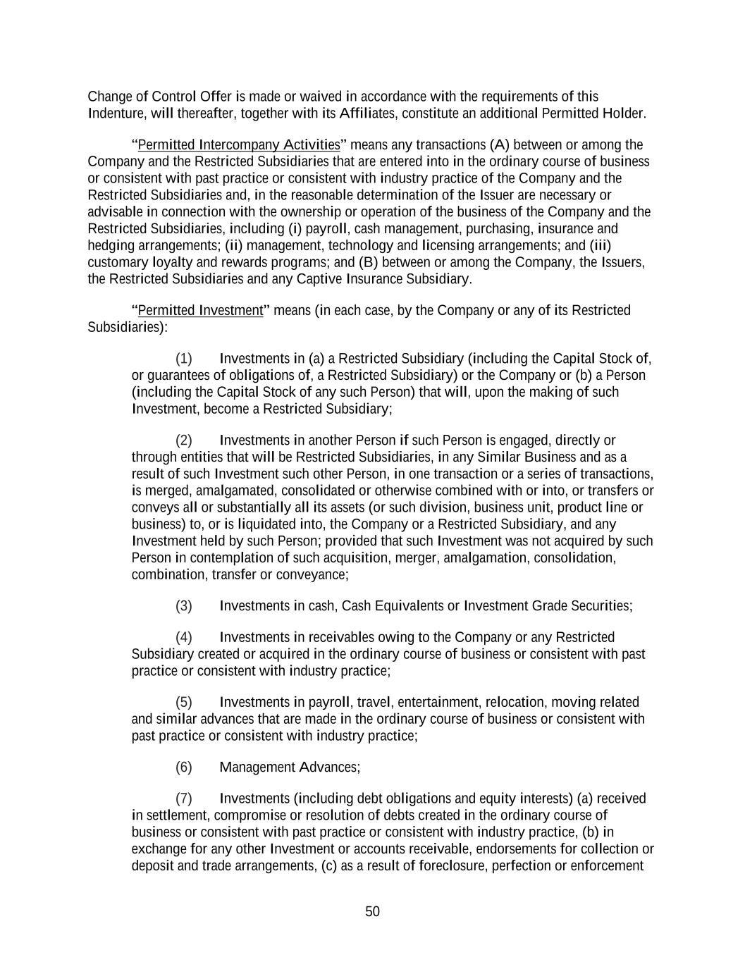 50 Change of Control Offer is made or waived in accordance with the requirements of this Indenture, will thereafter, together with its Affiliates, constitute an additional Permitted Holder. “Permitted Intercompany Activities” means any transactions (A) between or among the Company and the Restricted Subsidiaries that are entered into in the ordinary course of business or consistent with past practice or consistent with industry practice of the Company and the Restricted Subsidiaries and, in the reasonable determination of the Issuer are necessary or advisable in connection with the ownership or operation of the business of the Company and the Restricted Subsidiaries, including (i) payroll, cash management, purchasing, insurance and hedging arrangements; (ii) management, technology and licensing arrangements; and (iii) customary loyalty and rewards programs; and (B) between or among the Company, the Issuers, the Restricted Subsidiaries and any Captive Insurance Subsidiary. “Permitted Investment” means (in each case, by the Company or any of its Restricted Subsidiaries): (1) Investments in (a) a Restricted Subsidiary (including the Capital Stock of, or guarantees of obligations of, a Restricted Subsidiary) or the Company or (b) a Person (including the Capital Stock of any such Person) that will, upon the making of such Investment, become a Restricted Subsidiary; (2) Investments in another Person if such Person is engaged, directly or through entities that will be Restricted Subsidiaries, in any Similar Business and as a result of such Investment such other Person, in one transaction or a series of transactions, is merged, amalgamated, consolidated or otherwise combined with or into, or transfers or conveys all or substantially all its assets (or such division, business unit, product line or business) to, or is liquidated into, the Company or a Restricted Subsidiary, and any Investment held by such Person; provided that such Investment was not acquired by such Person in contemplation of such acquisition, merger, amalgamation, consolidation, combination, transfer or conveyance; (3) Investments in cash, Cash Equivalents or Investment Grade Securities; (4) Investments in receivables owing to the Company or any Restricted Subsidiary created or acquired in the ordinary course of business or consistent with past practice or consistent with industry practice; (5) Investments in payroll, travel, entertainment, relocation, moving related and similar advances that are made in the ordinary course of business or consistent with past practice or consistent with industry practice; (6) Management Advances; (7) Investments (including debt obligations and equity interests) (a) received in settlement, compromise or resolution of debts created in the ordinary course of business or consistent with past practice or consistent with industry practice, (b) in exchange for any other Investment or accounts receivable, endorsements for collection or deposit and trade arrangements, (c) as a result of foreclosure, perfection or enforcement
