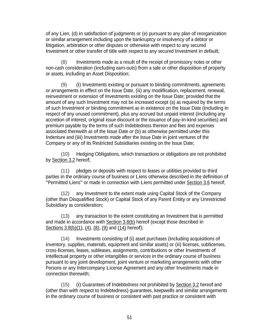 51 of any Lien, (d) in satisfaction of judgments or (e) pursuant to any plan of reorganization or similar arrangement including upon the bankruptcy or insolvency of a debtor or litigation, arbitration or other disputes or otherwise with respect to any secured Investment or other transfer of title with respect to any secured Investment in default; (8) Investments made as a result of the receipt of promissory notes or other non-cash consideration (including earn-outs) from a sale or other disposition of property or assets, including an Asset Disposition; (9) (i) Investments existing or pursuant to binding commitments, agreements or arrangements in effect on the Issue Date, (ii) any modification, replacement, renewal, reinvestment or extension of Investments existing on the Issue Date; provided that the amount of any such Investment may not be increased except (a) as required by the terms of such Investment or binding commitment as in existence on the Issue Date (including in respect of any unused commitment), plus any accrued but unpaid interest (including any accretion of interest, original issue discount or the issuance of pay-in-kind securities) and premium payable by the terms of such Indebtedness thereon and fees and expenses associated therewith as of the Issue Date or (b) as otherwise permitted under this Indenture and (iii) Investments made after the Issue Date in joint ventures of the Company or any of its Restricted Subsidiaries existing on the Issue Date; (10) Hedging Obligations, which transactions or obligations are not prohibited by Section 3.2 hereof; (11) pledges or deposits with respect to leases or utilities provided to third parties in the ordinary course of business or Liens otherwise described in the definition of “Permitted Liens” or made in connection with Liens permitted under Section 3.6 hereof; (12) any Investment to the extent made using Capital Stock of the Company (other than Disqualified Stock) or Capital Stock of any Parent Entity or any Unrestricted Subsidiary as consideration; (13) any transaction to the extent constituting an Investment that is permitted and made in accordance with Section 3.8(b) hereof (except those described in Sections 3.8(b)(1), (4), (8), (9) and (14) hereof); (14) Investments consisting of (i) asset purchases (including acquisitions of inventory, supplies, materials, equipment and similar assets) or (ii) licenses, sublicenses, cross-licenses, leases, subleases, assignments, contributions or other Investments of intellectual property or other intangibles or services in the ordinary course of business pursuant to any joint development, joint venture or marketing arrangements with other Persons or any Intercompany License Agreement and any other Investments made in connection therewith; (15) (i) Guarantees of Indebtedness not prohibited by Section 3.2 hereof and (other than with respect to Indebtedness) guarantees, keepwells and similar arrangements in the ordinary course of business or consistent with past practice or consistent with