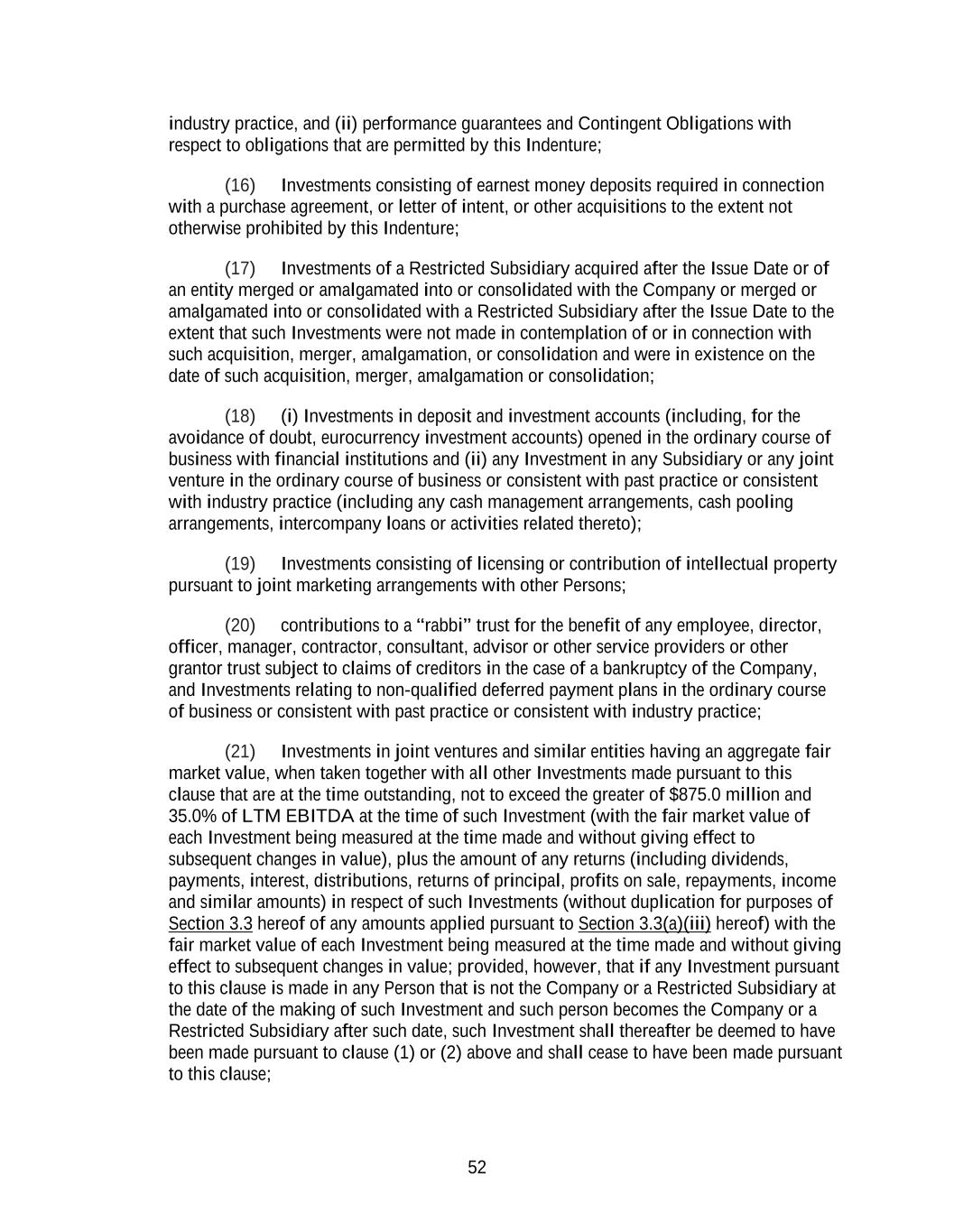 52 industry practice, and (ii) performance guarantees and Contingent Obligations with respect to obligations that are permitted by this Indenture; (16) Investments consisting of earnest money deposits required in connection with a purchase agreement, or letter of intent, or other acquisitions to the extent not otherwise prohibited by this Indenture; (17) Investments of a Restricted Subsidiary acquired after the Issue Date or of an entity merged or amalgamated into or consolidated with the Company or merged or amalgamated into or consolidated with a Restricted Subsidiary after the Issue Date to the extent that such Investments were not made in contemplation of or in connection with such acquisition, merger, amalgamation, or consolidation and were in existence on the date of such acquisition, merger, amalgamation or consolidation; (18) (i) Investments in deposit and investment accounts (including, for the avoidance of doubt, eurocurrency investment accounts) opened in the ordinary course of business with financial institutions and (ii) any Investment in any Subsidiary or any joint venture in the ordinary course of business or consistent with past practice or consistent with industry practice (including any cash management arrangements, cash pooling arrangements, intercompany loans or activities related thereto); (19) Investments consisting of licensing or contribution of intellectual property pursuant to joint marketing arrangements with other Persons; (20) contributions to a “rabbi” trust for the benefit of any employee, director, officer, manager, contractor, consultant, advisor or other service providers or other grantor trust subject to claims of creditors in the case of a bankruptcy of the Company, and Investments relating to non-qualified deferred payment plans in the ordinary course of business or consistent with past practice or consistent with industry practice; (21) Investments in joint ventures and similar entities having an aggregate fair market value, when taken together with all other Investments made pursuant to this clause that are at the time outstanding, not to exceed the greater of $875.0 million and 35.0% of LTM EBITDA at the time of such Investment (with the fair market value of each Investment being measured at the time made and without giving effect to subsequent changes in value), plus the amount of any returns (including dividends, payments, interest, distributions, returns of principal, profits on sale, repayments, income and similar amounts) in respect of such Investments (without duplication for purposes of Section 3.3 hereof of any amounts applied pursuant to Section 3.3(a)(iii) hereof) with the fair market value of each Investment being measured at the time made and without giving effect to subsequent changes in value; provided, however, that if any Investment pursuant to this clause is made in any Person that is not the Company or a Restricted Subsidiary at the date of the making of such Investment and such person becomes the Company or a Restricted Subsidiary after such date, such Investment shall thereafter be deemed to have been made pursuant to clause (1) or (2) above and shall cease to have been made pursuant to this clause;