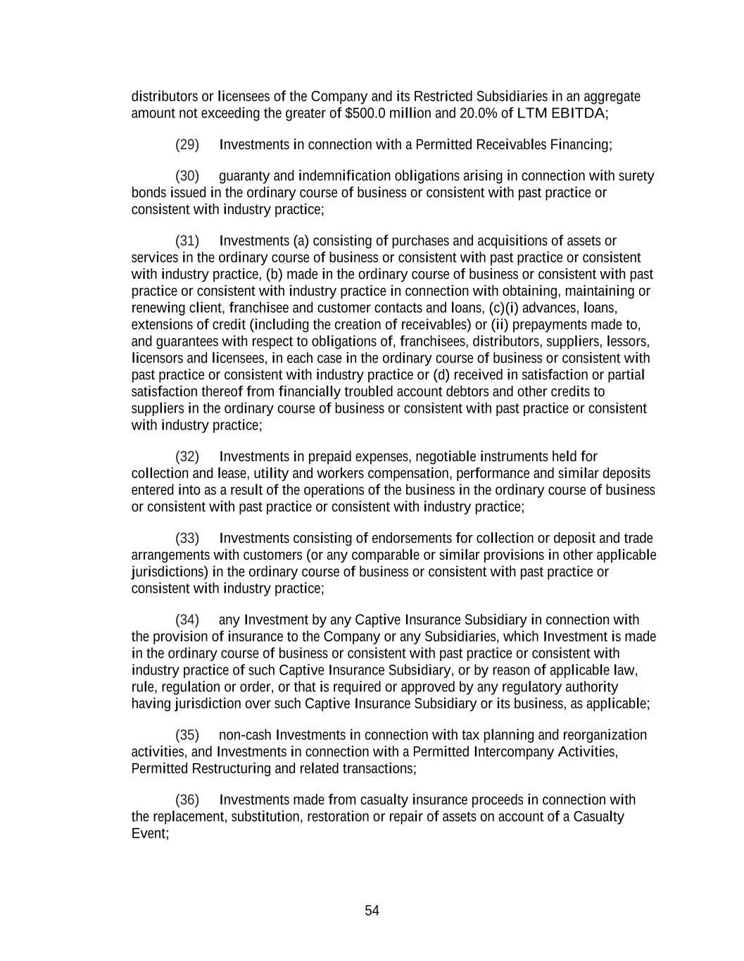 54 distributors or licensees of the Company and its Restricted Subsidiaries in an aggregate amount not exceeding the greater of $500.0 million and 20.0% of LTM EBITDA; (29) Investments in connection with a Permitted Receivables Financing; (30) guaranty and indemnification obligations arising in connection with surety bonds issued in the ordinary course of business or consistent with past practice or consistent with industry practice; (31) Investments (a) consisting of purchases and acquisitions of assets or services in the ordinary course of business or consistent with past practice or consistent with industry practice, (b) made in the ordinary course of business or consistent with past practice or consistent with industry practice in connection with obtaining, maintaining or renewing client, franchisee and customer contacts and loans, (c)(i) advances, loans, extensions of credit (including the creation of receivables) or (ii) prepayments made to, and guarantees with respect to obligations of, franchisees, distributors, suppliers, lessors, licensors and licensees, in each case in the ordinary course of business or consistent with past practice or consistent with industry practice or (d) received in satisfaction or partial satisfaction thereof from financially troubled account debtors and other credits to suppliers in the ordinary course of business or consistent with past practice or consistent with industry practice; (32) Investments in prepaid expenses, negotiable instruments held for collection and lease, utility and workers compensation, performance and similar deposits entered into as a result of the operations of the business in the ordinary course of business or consistent with past practice or consistent with industry practice; (33) Investments consisting of endorsements for collection or deposit and trade arrangements with customers (or any comparable or similar provisions in other applicable jurisdictions) in the ordinary course of business or consistent with past practice or consistent with industry practice; (34) any Investment by any Captive Insurance Subsidiary in connection with the provision of insurance to the Company or any Subsidiaries, which Investment is made in the ordinary course of business or consistent with past practice or consistent with industry practice of such Captive Insurance Subsidiary, or by reason of applicable law, rule, regulation or order, or that is required or approved by any regulatory authority having jurisdiction over such Captive Insurance Subsidiary or its business, as applicable; (35) non-cash Investments in connection with tax planning and reorganization activities, and Investments in connection with a Permitted Intercompany Activities, Permitted Restructuring and related transactions; (36) Investments made from casualty insurance proceeds in connection with the replacement, substitution, restoration or repair of assets on account of a Casualty Event;