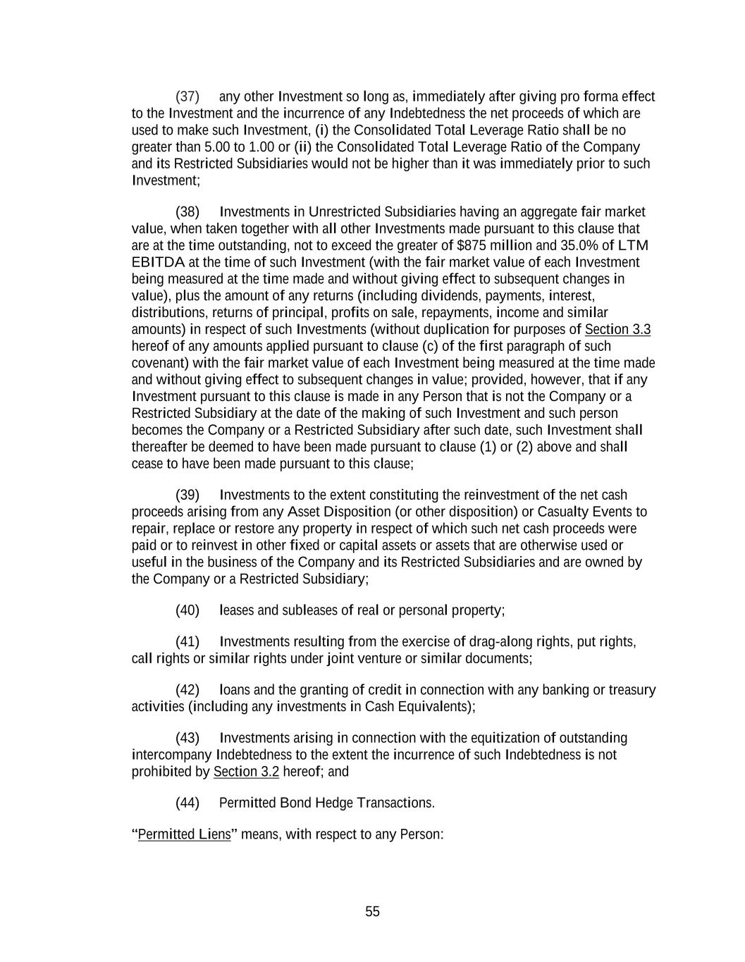 55 (37) any other Investment so long as, immediately after giving pro forma effect to the Investment and the incurrence of any Indebtedness the net proceeds of which are used to make such Investment, (i) the Consolidated Total Leverage Ratio shall be no greater than 5.00 to 1.00 or (ii) the Consolidated Total Leverage Ratio of the Company and its Restricted Subsidiaries would not be higher than it was immediately prior to such Investment; (38) Investments in Unrestricted Subsidiaries having an aggregate fair market value, when taken together with all other Investments made pursuant to this clause that are at the time outstanding, not to exceed the greater of $875 million and 35.0% of LTM EBITDA at the time of such Investment (with the fair market value of each Investment being measured at the time made and without giving effect to subsequent changes in value), plus the amount of any returns (including dividends, payments, interest, distributions, returns of principal, profits on sale, repayments, income and similar amounts) in respect of such Investments (without duplication for purposes of Section 3.3 hereof of any amounts applied pursuant to clause (c) of the first paragraph of such covenant) with the fair market value of each Investment being measured at the time made and without giving effect to subsequent changes in value; provided, however, that if any Investment pursuant to this clause is made in any Person that is not the Company or a Restricted Subsidiary at the date of the making of such Investment and such person becomes the Company or a Restricted Subsidiary after such date, such Investment shall thereafter be deemed to have been made pursuant to clause (1) or (2) above and shall cease to have been made pursuant to this clause; (39) Investments to the extent constituting the reinvestment of the net cash proceeds arising from any Asset Disposition (or other disposition) or Casualty Events to repair, replace or restore any property in respect of which such net cash proceeds were paid or to reinvest in other fixed or capital assets or assets that are otherwise used or useful in the business of the Company and its Restricted Subsidiaries and are owned by the Company or a Restricted Subsidiary; (40) leases and subleases of real or personal property; (41) Investments resulting from the exercise of drag-along rights, put rights, call rights or similar rights under joint venture or similar documents; (42) loans and the granting of credit in connection with any banking or treasury activities (including any investments in Cash Equivalents); (43) Investments arising in connection with the equitization of outstanding intercompany Indebtedness to the extent the incurrence of such Indebtedness is not prohibited by Section 3.2 hereof; and (44) Permitted Bond Hedge Transactions. “Permitted Liens” means, with respect to any Person: