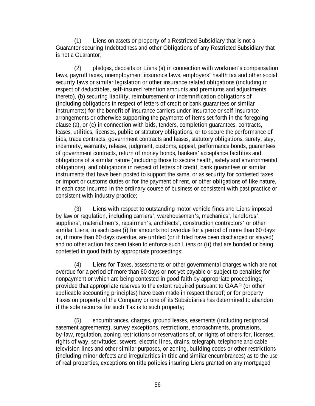 56 (1) Liens on assets or property of a Restricted Subsidiary that is not a Guarantor securing Indebtedness and other Obligations of any Restricted Subsidiary that is not a Guarantor; (2) pledges, deposits or Liens (a) in connection with workmen’s compensation laws, payroll taxes, unemployment insurance laws, employers’ health tax and other social security laws or similar legislation or other insurance related obligations (including in respect of deductibles, self-insured retention amounts and premiums and adjustments thereto), (b) securing liability, reimbursement or indemnification obligations of (including obligations in respect of letters of credit or bank guarantees or similar instruments) for the benefit of insurance carriers under insurance or self-insurance arrangements or otherwise supporting the payments of items set forth in the foregoing clause (a), or (c) in connection with bids, tenders, completion guarantees, contracts, leases, utilities, licenses, public or statutory obligations, or to secure the performance of bids, trade contracts, government contracts and leases, statutory obligations, surety, stay, indemnity, warranty, release, judgment, customs, appeal, performance bonds, guarantees of government contracts, return of money bonds, bankers’ acceptance facilities and obligations of a similar nature (including those to secure health, safety and environmental obligations), and obligations in respect of letters of credit, bank guarantees or similar instruments that have been posted to support the same, or as security for contested taxes or import or customs duties or for the payment of rent, or other obligations of like nature, in each case incurred in the ordinary course of business or consistent with past practice or consistent with industry practice; (3) Liens with respect to outstanding motor vehicle fines and Liens imposed by law or regulation, including carriers’, warehousemen’s, mechanics’, landlords’, suppliers’, materialmen’s, repairmen’s, architects’, construction contractors’ or other similar Liens, in each case (i) for amounts not overdue for a period of more than 60 days or, if more than 60 days overdue, are unfiled (or if filed have been discharged or stayed) and no other action has been taken to enforce such Liens or (ii) that are bonded or being contested in good faith by appropriate proceedings; (4) Liens for Taxes, assessments or other governmental charges which are not overdue for a period of more than 60 days or not yet payable or subject to penalties for nonpayment or which are being contested in good faith by appropriate proceedings; provided that appropriate reserves to the extent required pursuant to GAAP (or other applicable accounting principles) have been made in respect thereof; or for property Taxes on property of the Company or one of its Subsidiaries has determined to abandon if the sole recourse for such Tax is to such property; (5) encumbrances, charges, ground leases, easements (including reciprocal easement agreements), survey exceptions, restrictions, encroachments, protrusions, by-law, regulation, zoning restrictions or reservations of, or rights of others for, licenses, rights of way, servitudes, sewers, electric lines, drains, telegraph, telephone and cable television lines and other similar purposes, or zoning, building codes or other restrictions (including minor defects and irregularities in title and similar encumbrances) as to the use of real properties, exceptions on title policies insuring Liens granted on any mortgaged