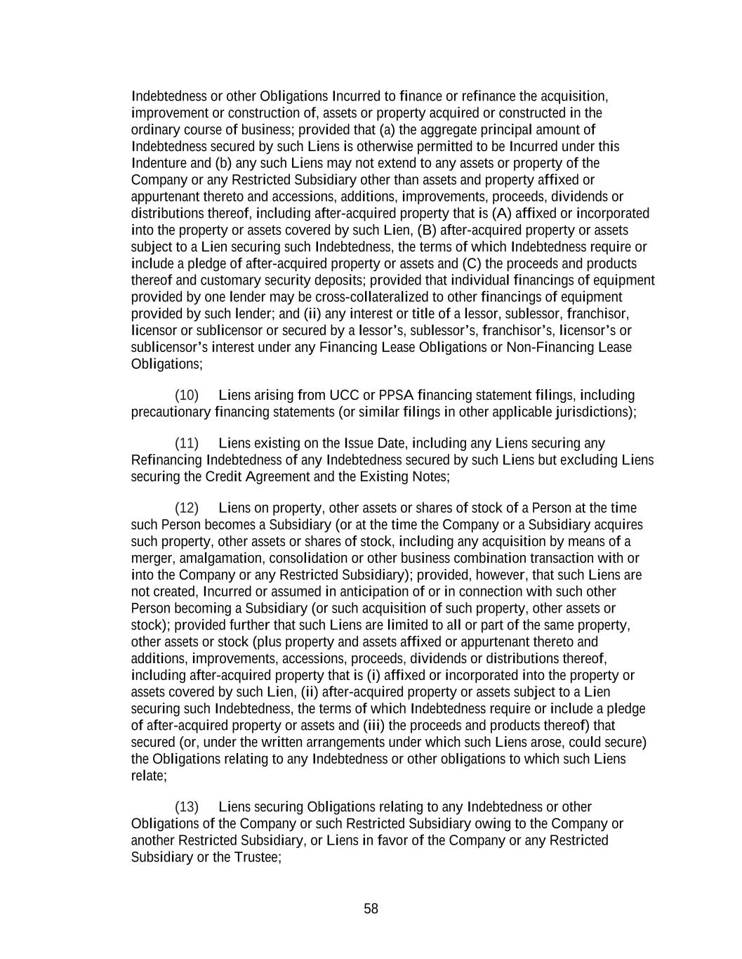 58 Indebtedness or other Obligations Incurred to finance or refinance the acquisition, improvement or construction of, assets or property acquired or constructed in the ordinary course of business; provided that (a) the aggregate principal amount of Indebtedness secured by such Liens is otherwise permitted to be Incurred under this Indenture and (b) any such Liens may not extend to any assets or property of the Company or any Restricted Subsidiary other than assets and property affixed or appurtenant thereto and accessions, additions, improvements, proceeds, dividends or distributions thereof, including after-acquired property that is (A) affixed or incorporated into the property or assets covered by such Lien, (B) after-acquired property or assets subject to a Lien securing such Indebtedness, the terms of which Indebtedness require or include a pledge of after-acquired property or assets and (C) the proceeds and products thereof and customary security deposits; provided that individual financings of equipment provided by one lender may be cross-collateralized to other financings of equipment provided by such lender; and (ii) any interest or title of a lessor, sublessor, franchisor, licensor or sublicensor or secured by a lessor’s, sublessor’s, franchisor’s, licensor’s or sublicensor’s interest under any Financing Lease Obligations or Non-Financing Lease Obligations; (10) Liens arising from UCC or PPSA financing statement filings, including precautionary financing statements (or similar filings in other applicable jurisdictions); (11) Liens existing on the Issue Date, including any Liens securing any Refinancing Indebtedness of any Indebtedness secured by such Liens but excluding Liens securing the Credit Agreement and the Existing Notes; (12) Liens on property, other assets or shares of stock of a Person at the time such Person becomes a Subsidiary (or at the time the Company or a Subsidiary acquires such property, other assets or shares of stock, including any acquisition by means of a merger, amalgamation, consolidation or other business combination transaction with or into the Company or any Restricted Subsidiary); provided, however, that such Liens are not created, Incurred or assumed in anticipation of or in connection with such other Person becoming a Subsidiary (or such acquisition of such property, other assets or stock); provided further that such Liens are limited to all or part of the same property, other assets or stock (plus property and assets affixed or appurtenant thereto and additions, improvements, accessions, proceeds, dividends or distributions thereof, including after-acquired property that is (i) affixed or incorporated into the property or assets covered by such Lien, (ii) after-acquired property or assets subject to a Lien securing such Indebtedness, the terms of which Indebtedness require or include a pledge of after-acquired property or assets and (iii) the proceeds and products thereof) that secured (or, under the written arrangements under which such Liens arose, could secure) the Obligations relating to any Indebtedness or other obligations to which such Liens relate; (13) Liens securing Obligations relating to any Indebtedness or other Obligations of the Company or such Restricted Subsidiary owing to the Company or another Restricted Subsidiary, or Liens in favor of the Company or any Restricted Subsidiary or the Trustee;