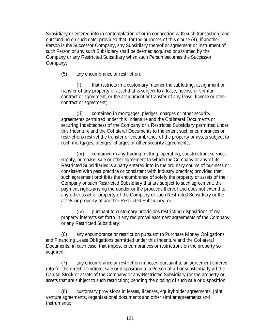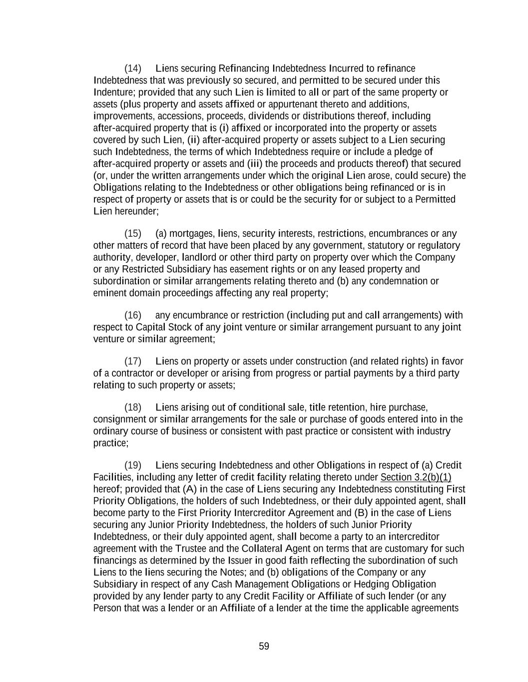 59 (14) Liens securing Refinancing Indebtedness Incurred to refinance Indebtedness that was previously so secured, and permitted to be secured under this Indenture; provided that any such Lien is limited to all or part of the same property or assets (plus property and assets affixed or appurtenant thereto and additions, improvements, accessions, proceeds, dividends or distributions thereof, including after-acquired property that is (i) affixed or incorporated into the property or assets covered by such Lien, (ii) after-acquired property or assets subject to a Lien securing such Indebtedness, the terms of which Indebtedness require or include a pledge of after-acquired property or assets and (iii) the proceeds and products thereof) that secured (or, under the written arrangements under which the original Lien arose, could secure) the Obligations relating to the Indebtedness or other obligations being refinanced or is in respect of property or assets that is or could be the security for or subject to a Permitted Lien hereunder; (15) (a) mortgages, liens, security interests, restrictions, encumbrances or any other matters of record that have been placed by any government, statutory or regulatory authority, developer, landlord or other third party on property over which the Company or any Restricted Subsidiary has easement rights or on any leased property and subordination or similar arrangements relating thereto and (b) any condemnation or eminent domain proceedings affecting any real property; (16) any encumbrance or restriction (including put and call arrangements) with respect to Capital Stock of any joint venture or similar arrangement pursuant to any joint venture or similar agreement; (17) Liens on property or assets under construction (and related rights) in favor of a contractor or developer or arising from progress or partial payments by a third party relating to such property or assets; (18) Liens arising out of conditional sale, title retention, hire purchase, consignment or similar arrangements for the sale or purchase of goods entered into in the ordinary course of business or consistent with past practice or consistent with industry practice; (19) Liens securing Indebtedness and other Obligations in respect of (a) Credit Facilities, including any letter of credit facility relating thereto under Section 3.2(b)(1) hereof; provided that (A) in the case of Liens securing any Indebtedness constituting First Priority Obligations, the holders of such Indebtedness, or their duly appointed agent, shall become party to the First Priority Intercreditor Agreement and (B) in the case of Liens securing any Junior Priority Indebtedness, the holders of such Junior Priority Indebtedness, or their duly appointed agent, shall become a party to an intercreditor agreement with the Trustee and the Collateral Agent on terms that are customary for such financings as determined by the Issuer in good faith reflecting the subordination of such Liens to the liens securing the Notes; and (b) obligations of the Company or any Subsidiary in respect of any Cash Management Obligations or Hedging Obligation provided by any lender party to any Credit Facility or Affiliate of such lender (or any Person that was a lender or an Affiliate of a lender at the time the applicable agreements