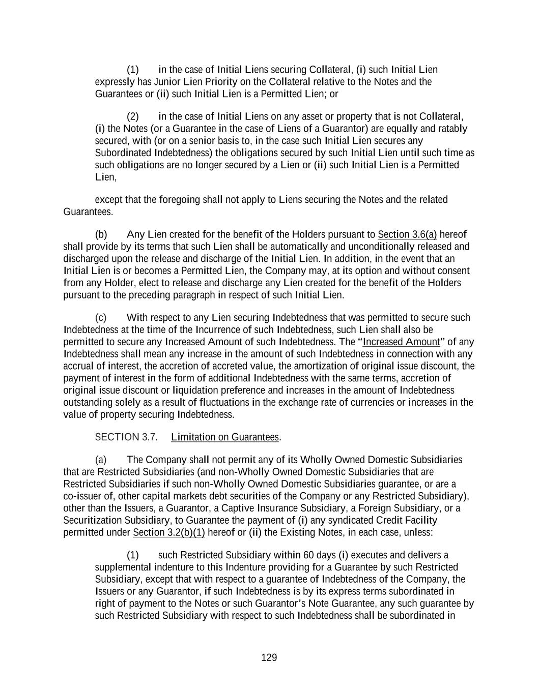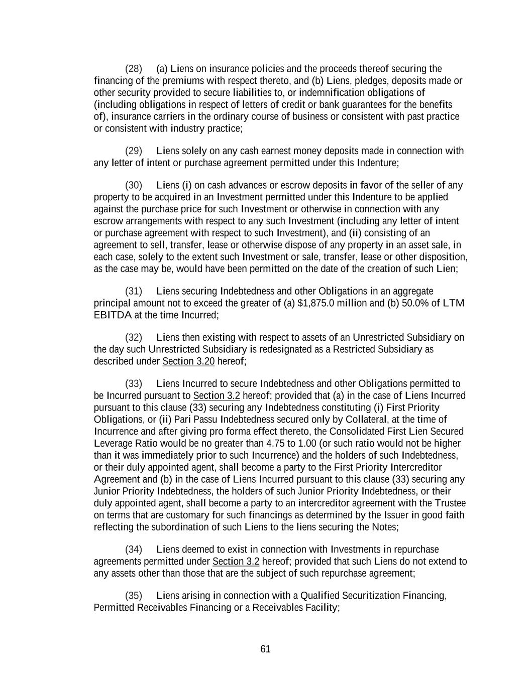 61 (28) (a) Liens on insurance policies and the proceeds thereof securing the financing of the premiums with respect thereto, and (b) Liens, pledges, deposits made or other security provided to secure liabilities to, or indemnification obligations of (including obligations in respect of letters of credit or bank guarantees for the benefits of), insurance carriers in the ordinary course of business or consistent with past practice or consistent with industry practice; (29) Liens solely on any cash earnest money deposits made in connection with any letter of intent or purchase agreement permitted under this Indenture; (30) Liens (i) on cash advances or escrow deposits in favor of the seller of any property to be acquired in an Investment permitted under this Indenture to be applied against the purchase price for such Investment or otherwise in connection with any escrow arrangements with respect to any such Investment (including any letter of intent or purchase agreement with respect to such Investment), and (ii) consisting of an agreement to sell, transfer, lease or otherwise dispose of any property in an asset sale, in each case, solely to the extent such Investment or sale, transfer, lease or other disposition, as the case may be, would have been permitted on the date of the creation of such Lien; (31) Liens securing Indebtedness and other Obligations in an aggregate principal amount not to exceed the greater of (a) $1,875.0 million and (b) 50.0% of LTM EBITDA at the time Incurred; (32) Liens then existing with respect to assets of an Unrestricted Subsidiary on the day such Unrestricted Subsidiary is redesignated as a Restricted Subsidiary as described under Section 3.20 hereof; (33) Liens Incurred to secure Indebtedness and other Obligations permitted to be Incurred pursuant to Section 3.2 hereof; provided that (a) in the case of Liens Incurred pursuant to this clause (33) securing any Indebtedness constituting (i) First Priority Obligations, or (ii) Pari Passu Indebtedness secured only by Collateral, at the time of Incurrence and after giving pro forma effect thereto, the Consolidated First Lien Secured Leverage Ratio would be no greater than 4.75 to 1.00 (or such ratio would not be higher than it was immediately prior to such Incurrence) and the holders of such Indebtedness, or their duly appointed agent, shall become a party to the First Priority Intercreditor Agreement and (b) in the case of Liens Incurred pursuant to this clause (33) securing any Junior Priority Indebtedness, the holders of such Junior Priority Indebtedness, or their duly appointed agent, shall become a party to an intercreditor agreement with the Trustee on terms that are customary for such financings as determined by the Issuer in good faith reflecting the subordination of such Liens to the liens securing the Notes; (34) Liens deemed to exist in connection with Investments in repurchase agreements permitted under Section 3.2 hereof; provided that such Liens do not extend to any assets other than those that are the subject of such repurchase agreement; (35) Liens arising in connection with a Qualified Securitization Financing, Permitted Receivables Financing or a Receivables Facility;