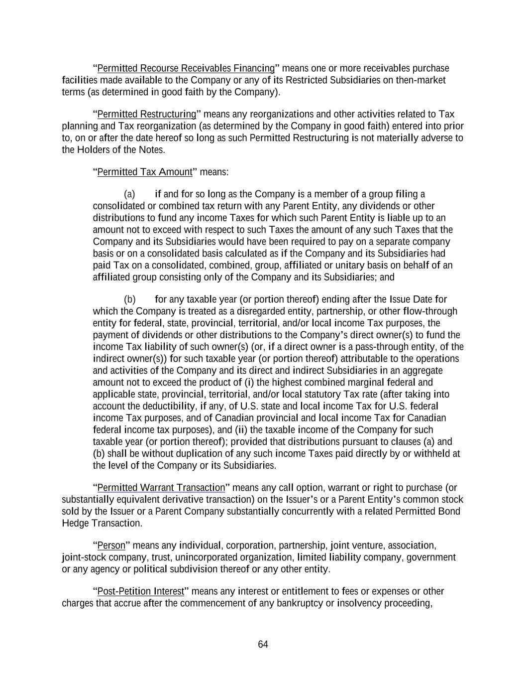 64 “Permitted Recourse Receivables Financing” means one or more receivables purchase facilities made available to the Company or any of its Restricted Subsidiaries on then-market terms (as determined in good faith by the Company). “Permitted Restructuring” means any reorganizations and other activities related to Tax planning and Tax reorganization (as determined by the Company in good faith) entered into prior to, on or after the date hereof so long as such Permitted Restructuring is not materially adverse to the Holders of the Notes. “Permitted Tax Amount” means: (a) if and for so long as the Company is a member of a group filing a consolidated or combined tax return with any Parent Entity, any dividends or other distributions to fund any income Taxes for which such Parent Entity is liable up to an amount not to exceed with respect to such Taxes the amount of any such Taxes that the Company and its Subsidiaries would have been required to pay on a separate company basis or on a consolidated basis calculated as if the Company and its Subsidiaries had paid Tax on a consolidated, combined, group, affiliated or unitary basis on behalf of an affiliated group consisting only of the Company and its Subsidiaries; and (b) for any taxable year (or portion thereof) ending after the Issue Date for which the Company is treated as a disregarded entity, partnership, or other flow-through entity for federal, state, provincial, territorial, and/or local income Tax purposes, the payment of dividends or other distributions to the Company’s direct owner(s) to fund the income Tax liability of such owner(s) (or, if a direct owner is a pass-through entity, of the indirect owner(s)) for such taxable year (or portion thereof) attributable to the operations and activities of the Company and its direct and indirect Subsidiaries in an aggregate amount not to exceed the product of (i) the highest combined marginal federal and applicable state, provincial, territorial, and/or local statutory Tax rate (after taking into account the deductibility, if any, of U.S. state and local income Tax for U.S. federal income Tax purposes, and of Canadian provincial and local income Tax for Canadian federal income tax purposes), and (ii) the taxable income of the Company for such taxable year (or portion thereof); provided that distributions pursuant to clauses (a) and (b) shall be without duplication of any such income Taxes paid directly by or withheld at the level of the Company or its Subsidiaries. “Permitted Warrant Transaction” means any call option, warrant or right to purchase (or substantially equivalent derivative transaction) on the Issuer’s or a Parent Entity’s common stock sold by the Issuer or a Parent Company substantially concurrently with a related Permitted Bond Hedge Transaction. “Person” means any individual, corporation, partnership, joint venture, association, joint-stock company, trust, unincorporated organization, limited liability company, government or any agency or political subdivision thereof or any other entity. “Post-Petition Interest” means any interest or entitlement to fees or expenses or other charges that accrue after the commencement of any bankruptcy or insolvency proceeding,