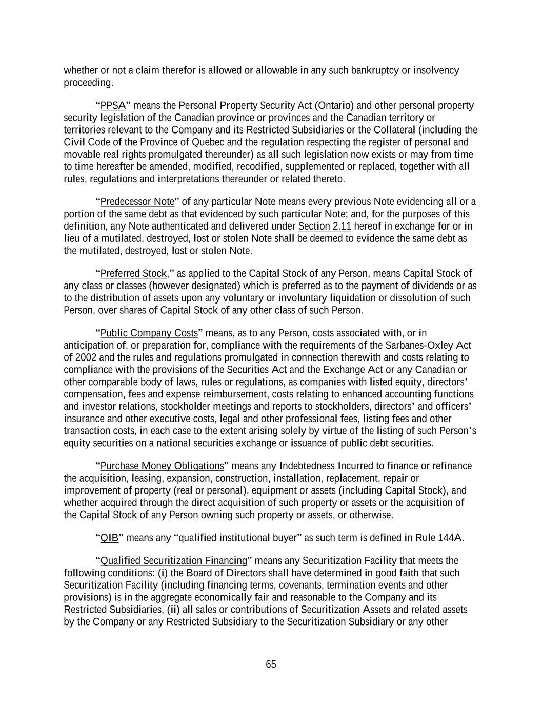 65 whether or not a claim therefor is allowed or allowable in any such bankruptcy or insolvency proceeding. “PPSA” means the Personal Property Security Act (Ontario) and other personal property security legislation of the Canadian province or provinces and the Canadian territory or territories relevant to the Company and its Restricted Subsidiaries or the Collateral (including the Civil Code of the Province of Quebec and the regulation respecting the register of personal and movable real rights promulgated thereunder) as all such legislation now exists or may from time to time hereafter be amended, modified, recodified, supplemented or replaced, together with all rules, regulations and interpretations thereunder or related thereto. “Predecessor Note” of any particular Note means every previous Note evidencing all or a portion of the same debt as that evidenced by such particular Note; and, for the purposes of this definition, any Note authenticated and delivered under Section 2.11 hereof in exchange for or in lieu of a mutilated, destroyed, lost or stolen Note shall be deemed to evidence the same debt as the mutilated, destroyed, lost or stolen Note. “Preferred Stock,” as applied to the Capital Stock of any Person, means Capital Stock of any class or classes (however designated) which is preferred as to the payment of dividends or as to the distribution of assets upon any voluntary or involuntary liquidation or dissolution of such Person, over shares of Capital Stock of any other class of such Person. “Public Company Costs” means, as to any Person, costs associated with, or in anticipation of, or preparation for, compliance with the requirements of the Sarbanes-Oxley Act of 2002 and the rules and regulations promulgated in connection therewith and costs relating to compliance with the provisions of the Securities Act and the Exchange Act or any Canadian or other comparable body of laws, rules or regulations, as companies with listed equity, directors’ compensation, fees and expense reimbursement, costs relating to enhanced accounting functions and investor relations, stockholder meetings and reports to stockholders, directors’ and officers’ insurance and other executive costs, legal and other professional fees, listing fees and other transaction costs, in each case to the extent arising solely by virtue of the listing of such Person’s equity securities on a national securities exchange or issuance of public debt securities. “Purchase Money Obligations” means any Indebtedness Incurred to finance or refinance the acquisition, leasing, expansion, construction, installation, replacement, repair or improvement of property (real or personal), equipment or assets (including Capital Stock), and whether acquired through the direct acquisition of such property or assets or the acquisition of the Capital Stock of any Person owning such property or assets, or otherwise. “QIB” means any “qualified institutional buyer” as such term is defined in Rule 144A. “Qualified Securitization Financing” means any Securitization Facility that meets the following conditions: (i) the Board of Directors shall have determined in good faith that such Securitization Facility (including financing terms, covenants, termination events and other provisions) is in the aggregate economically fair and reasonable to the Company and its Restricted Subsidiaries, (ii) all sales or contributions of Securitization Assets and related assets by the Company or any Restricted Subsidiary to the Securitization Subsidiary or any other