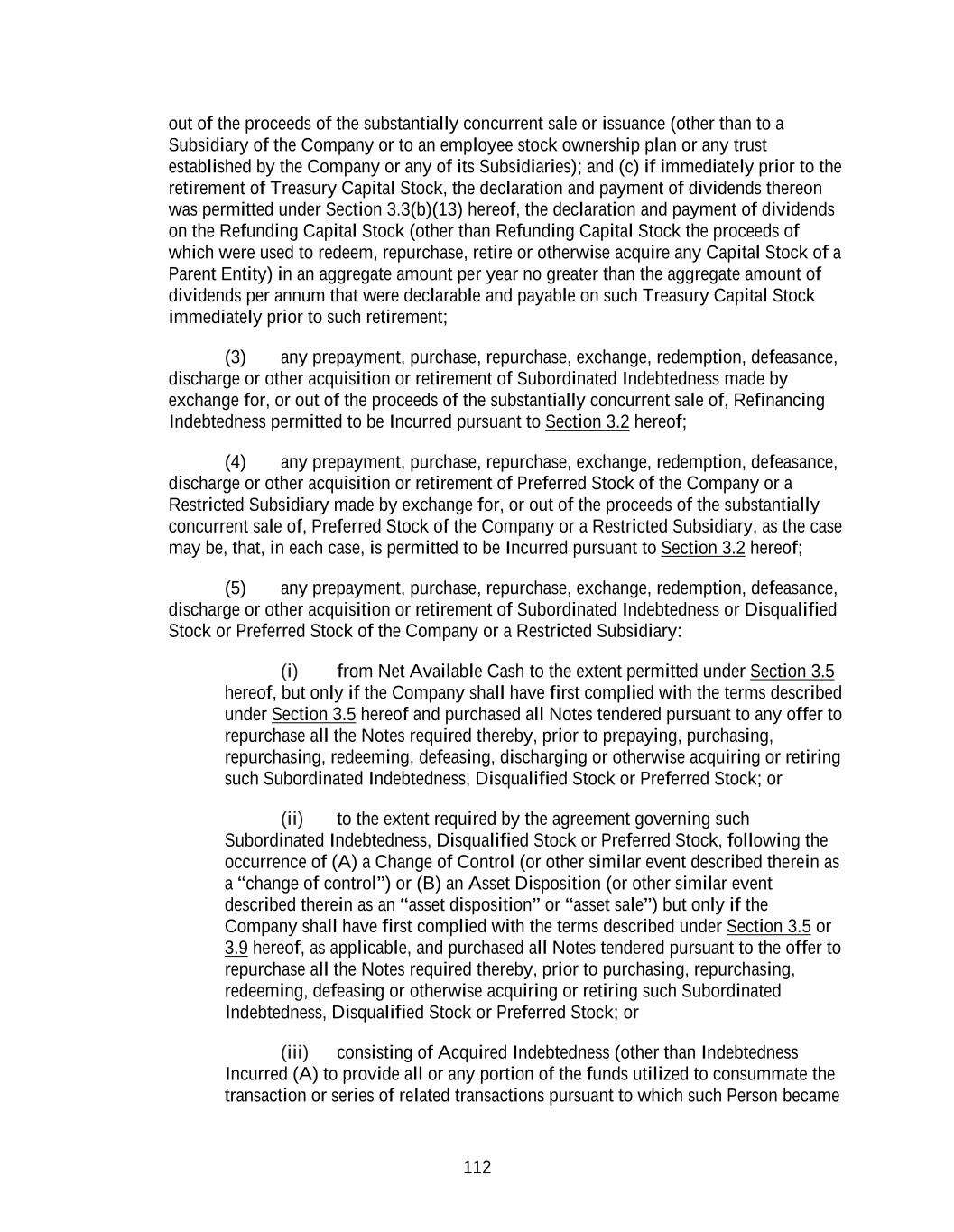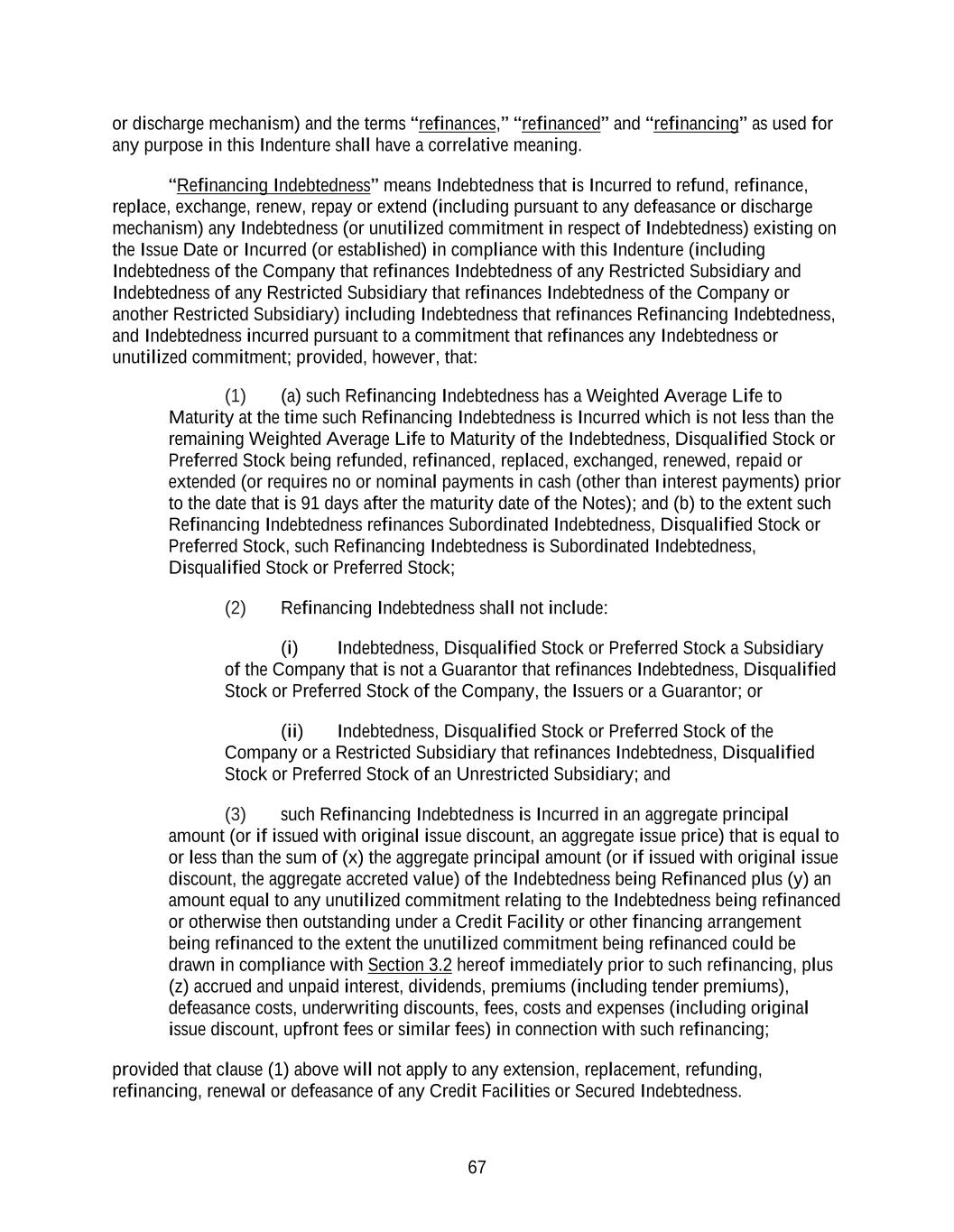 67 or discharge mechanism) and the terms “refinances,” “refinanced” and “refinancing” as used for any purpose in this Indenture shall have a correlative meaning. “Refinancing Indebtedness” means Indebtedness that is Incurred to refund, refinance, replace, exchange, renew, repay or extend (including pursuant to any defeasance or discharge mechanism) any Indebtedness (or unutilized commitment in respect of Indebtedness) existing on the Issue Date or Incurred (or established) in compliance with this Indenture (including Indebtedness of the Company that refinances Indebtedness of any Restricted Subsidiary and Indebtedness of any Restricted Subsidiary that refinances Indebtedness of the Company or another Restricted Subsidiary) including Indebtedness that refinances Refinancing Indebtedness, and Indebtedness incurred pursuant to a commitment that refinances any Indebtedness or unutilized commitment; provided, however, that: (1) (a) such Refinancing Indebtedness has a Weighted Average Life to Maturity at the time such Refinancing Indebtedness is Incurred which is not less than the remaining Weighted Average Life to Maturity of the Indebtedness, Disqualified Stock or Preferred Stock being refunded, refinanced, replaced, exchanged, renewed, repaid or extended (or requires no or nominal payments in cash (other than interest payments) prior to the date that is 91 days after the maturity date of the Notes); and (b) to the extent such Refinancing Indebtedness refinances Subordinated Indebtedness, Disqualified Stock or Preferred Stock, such Refinancing Indebtedness is Subordinated Indebtedness, Disqualified Stock or Preferred Stock; (2) Refinancing Indebtedness shall not include: (i) Indebtedness, Disqualified Stock or Preferred Stock a Subsidiary of the Company that is not a Guarantor that refinances Indebtedness, Disqualified Stock or Preferred Stock of the Company, the Issuers or a Guarantor; or (ii) Indebtedness, Disqualified Stock or Preferred Stock of the Company or a Restricted Subsidiary that refinances Indebtedness, Disqualified Stock or Preferred Stock of an Unrestricted Subsidiary; and (3) such Refinancing Indebtedness is Incurred in an aggregate principal amount (or if issued with original issue discount, an aggregate issue price) that is equal to or less than the sum of (x) the aggregate principal amount (or if issued with original issue discount, the aggregate accreted value) of the Indebtedness being Refinanced plus (y) an amount equal to any unutilized commitment relating to the Indebtedness being refinanced or otherwise then outstanding under a Credit Facility or other financing arrangement being refinanced to the extent the unutilized commitment being refinanced could be drawn in compliance with Section 3.2 hereof immediately prior to such refinancing, plus (z) accrued and unpaid interest, dividends, premiums (including tender premiums), defeasance costs, underwriting discounts, fees, costs and expenses (including original issue discount, upfront fees or similar fees) in connection with such refinancing; provided that clause (1) above will not apply to any extension, replacement, refunding, refinancing, renewal or defeasance of any Credit Facilities or Secured Indebtedness.