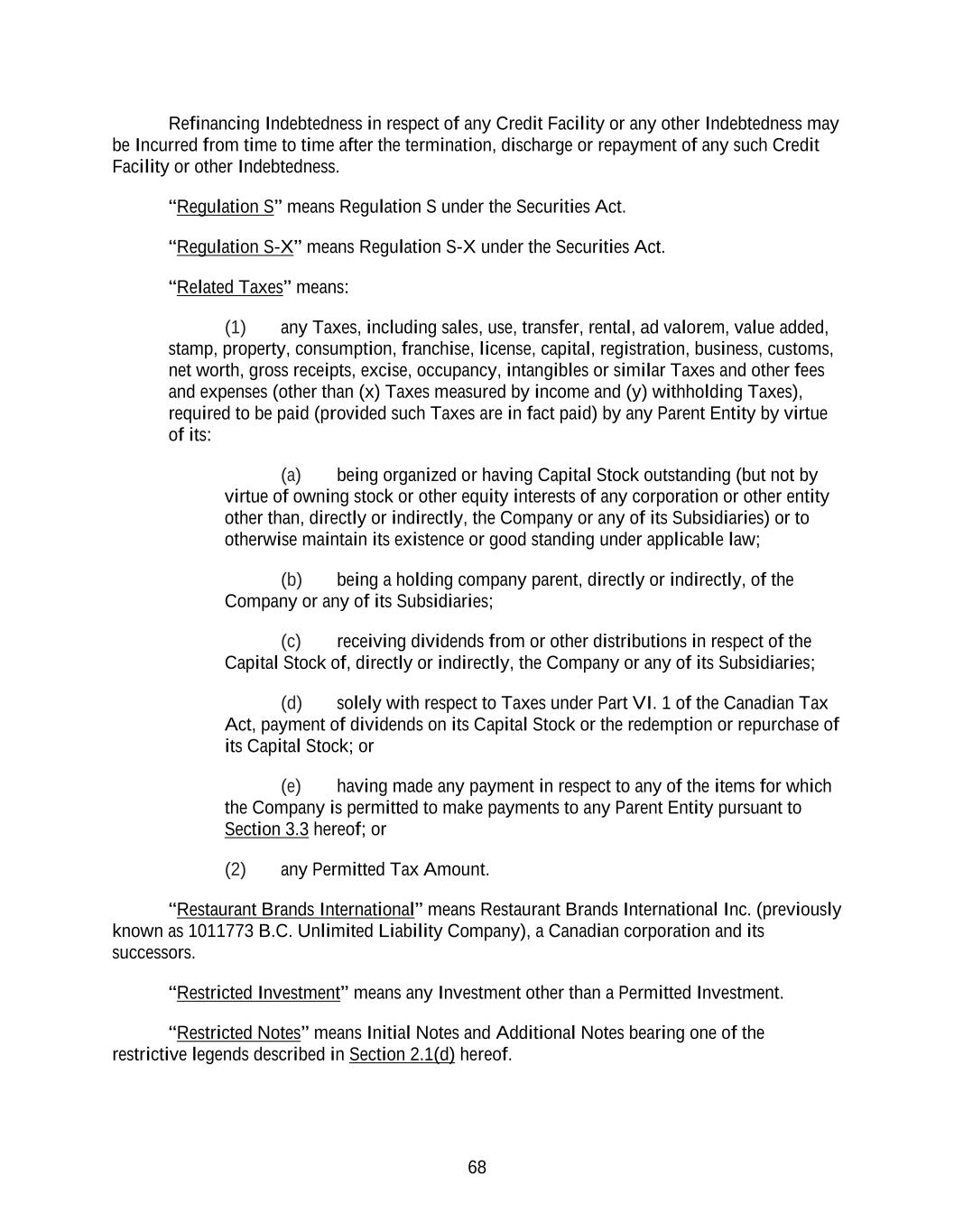 68 Refinancing Indebtedness in respect of any Credit Facility or any other Indebtedness may be Incurred from time to time after the termination, discharge or repayment of any such Credit Facility or other Indebtedness. “Regulation S” means Regulation S under the Securities Act. “Regulation S-X” means Regulation S-X under the Securities Act. “Related Taxes” means: (1) any Taxes, including sales, use, transfer, rental, ad valorem, value added, stamp, property, consumption, franchise, license, capital, registration, business, customs, net worth, gross receipts, excise, occupancy, intangibles or similar Taxes and other fees and expenses (other than (x) Taxes measured by income and (y) withholding Taxes), required to be paid (provided such Taxes are in fact paid) by any Parent Entity by virtue of its: (a) being organized or having Capital Stock outstanding (but not by virtue of owning stock or other equity interests of any corporation or other entity other than, directly or indirectly, the Company or any of its Subsidiaries) or to otherwise maintain its existence or good standing under applicable law; (b) being a holding company parent, directly or indirectly, of the Company or any of its Subsidiaries; (c) receiving dividends from or other distributions in respect of the Capital Stock of, directly or indirectly, the Company or any of its Subsidiaries; (d) solely with respect to Taxes under Part VI. 1 of the Canadian Tax Act, payment of dividends on its Capital Stock or the redemption or repurchase of its Capital Stock; or (e) having made any payment in respect to any of the items for which the Company is permitted to make payments to any Parent Entity pursuant to Section 3.3 hereof; or (2) any Permitted Tax Amount. “Restaurant Brands International” means Restaurant Brands International Inc. (previously known as 1011773 B.C. Unlimited Liability Company), a Canadian corporation and its successors. “Restricted Investment” means any Investment other than a Permitted Investment. “Restricted Notes” means Initial Notes and Additional Notes bearing one of the restrictive legends described in Section 2.1(d) hereof.