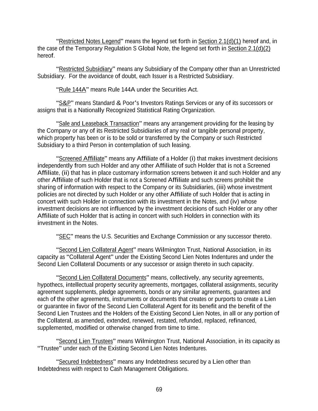 69 “Restricted Notes Legend” means the legend set forth in Section 2.1(d)(1) hereof and, in the case of the Temporary Regulation S Global Note, the legend set forth in Section 2.1(d)(2) hereof. “Restricted Subsidiary” means any Subsidiary of the Company other than an Unrestricted Subsidiary. For the avoidance of doubt, each Issuer is a Restricted Subsidiary. “Rule 144A” means Rule 144A under the Securities Act. “S&P” means Standard & Poor’s Investors Ratings Services or any of its successors or assigns that is a Nationally Recognized Statistical Rating Organization. “Sale and Leaseback Transaction” means any arrangement providing for the leasing by the Company or any of its Restricted Subsidiaries of any real or tangible personal property, which property has been or is to be sold or transferred by the Company or such Restricted Subsidiary to a third Person in contemplation of such leasing. “Screened Affiliate” means any Affiliate of a Holder (i) that makes investment decisions independently from such Holder and any other Affiliate of such Holder that is not a Screened Affiliate, (ii) that has in place customary information screens between it and such Holder and any other Affiliate of such Holder that is not a Screened Affiliate and such screens prohibit the sharing of information with respect to the Company or its Subsidiaries, (iii) whose investment policies are not directed by such Holder or any other Affiliate of such Holder that is acting in concert with such Holder in connection with its investment in the Notes, and (iv) whose investment decisions are not influenced by the investment decisions of such Holder or any other Affiliate of such Holder that is acting in concert with such Holders in connection with its investment in the Notes. “SEC” means the U.S. Securities and Exchange Commission or any successor thereto. “Second Lien Collateral Agent” means Wilmington Trust, National Association, in its capacity as “Collateral Agent” under the Existing Second Lien Notes Indentures and under the Second Lien Collateral Documents or any successor or assign thereto in such capacity. “Second Lien Collateral Documents” means, collectively, any security agreements, hypothecs, intellectual property security agreements, mortgages, collateral assignments, security agreement supplements, pledge agreements, bonds or any similar agreements, guarantees and each of the other agreements, instruments or documents that creates or purports to create a Lien or guarantee in favor of the Second Lien Collateral Agent for its benefit and the benefit of the Second Lien Trustees and the Holders of the Existing Second Lien Notes, in all or any portion of the Collateral, as amended, extended, renewed, restated, refunded, replaced, refinanced, supplemented, modified or otherwise changed from time to time. “Second Lien Trustees” means Wilmington Trust, National Association, in its capacity as “Trustee” under each of the Existing Second Lien Notes Indentures. “Secured Indebtedness” means any Indebtedness secured by a Lien other than Indebtedness with respect to Cash Management Obligations.