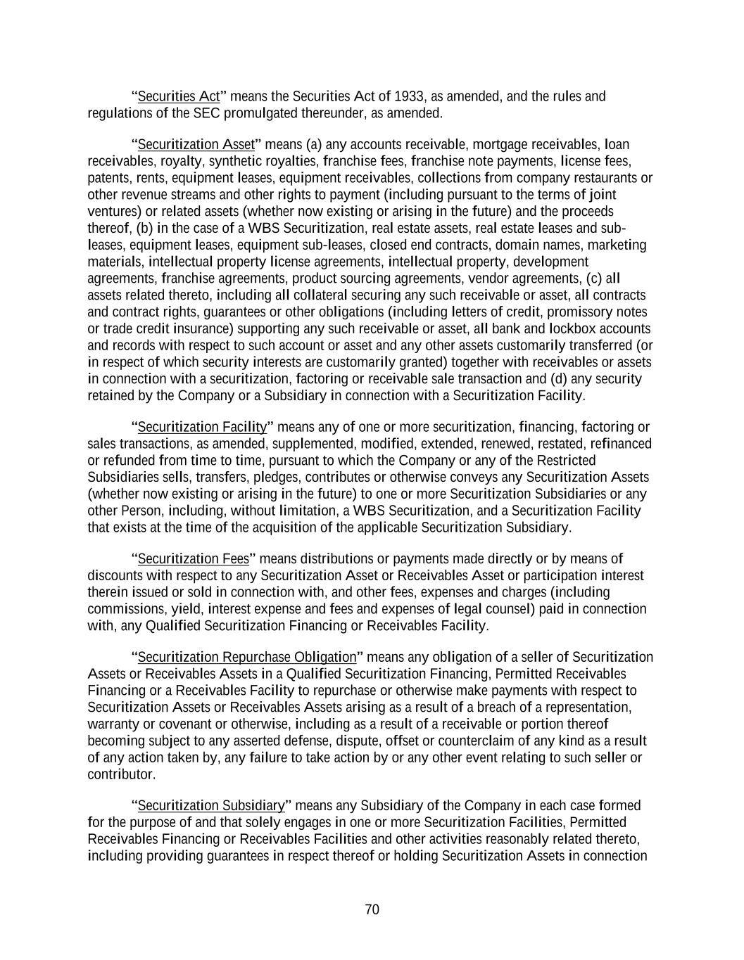 70 “Securities Act” means the Securities Act of 1933, as amended, and the rules and regulations of the SEC promulgated thereunder, as amended. “Securitization Asset” means (a) any accounts receivable, mortgage receivables, loan receivables, royalty, synthetic royalties, franchise fees, franchise note payments, license fees, patents, rents, equipment leases, equipment receivables, collections from company restaurants or other revenue streams and other rights to payment (including pursuant to the terms of joint ventures) or related assets (whether now existing or arising in the future) and the proceeds thereof, (b) in the case of a WBS Securitization, real estate assets, real estate leases and sub- leases, equipment leases, equipment sub-leases, closed end contracts, domain names, marketing materials, intellectual property license agreements, intellectual property, development agreements, franchise agreements, product sourcing agreements, vendor agreements, (c) all assets related thereto, including all collateral securing any such receivable or asset, all contracts and contract rights, guarantees or other obligations (including letters of credit, promissory notes or trade credit insurance) supporting any such receivable or asset, all bank and lockbox accounts and records with respect to such account or asset and any other assets customarily transferred (or in respect of which security interests are customarily granted) together with receivables or assets in connection with a securitization, factoring or receivable sale transaction and (d) any security retained by the Company or a Subsidiary in connection with a Securitization Facility. “Securitization Facility” means any of one or more securitization, financing, factoring or sales transactions, as amended, supplemented, modified, extended, renewed, restated, refinanced or refunded from time to time, pursuant to which the Company or any of the Restricted Subsidiaries sells, transfers, pledges, contributes or otherwise conveys any Securitization Assets (whether now existing or arising in the future) to one or more Securitization Subsidiaries or any other Person, including, without limitation, a WBS Securitization, and a Securitization Facility that exists at the time of the acquisition of the applicable Securitization Subsidiary. “Securitization Fees” means distributions or payments made directly or by means of discounts with respect to any Securitization Asset or Receivables Asset or participation interest therein issued or sold in connection with, and other fees, expenses and charges (including commissions, yield, interest expense and fees and expenses of legal counsel) paid in connection with, any Qualified Securitization Financing or Receivables Facility. “Securitization Repurchase Obligation” means any obligation of a seller of Securitization Assets or Receivables Assets in a Qualified Securitization Financing, Permitted Receivables Financing or a Receivables Facility to repurchase or otherwise make payments with respect to Securitization Assets or Receivables Assets arising as a result of a breach of a representation, warranty or covenant or otherwise, including as a result of a receivable or portion thereof becoming subject to any asserted defense, dispute, offset or counterclaim of any kind as a result of any action taken by, any failure to take action by or any other event relating to such seller or contributor. “Securitization Subsidiary” means any Subsidiary of the Company in each case formed for the purpose of and that solely engages in one or more Securitization Facilities, Permitted Receivables Financing or Receivables Facilities and other activities reasonably related thereto, including providing guarantees in respect thereof or holding Securitization Assets in connection