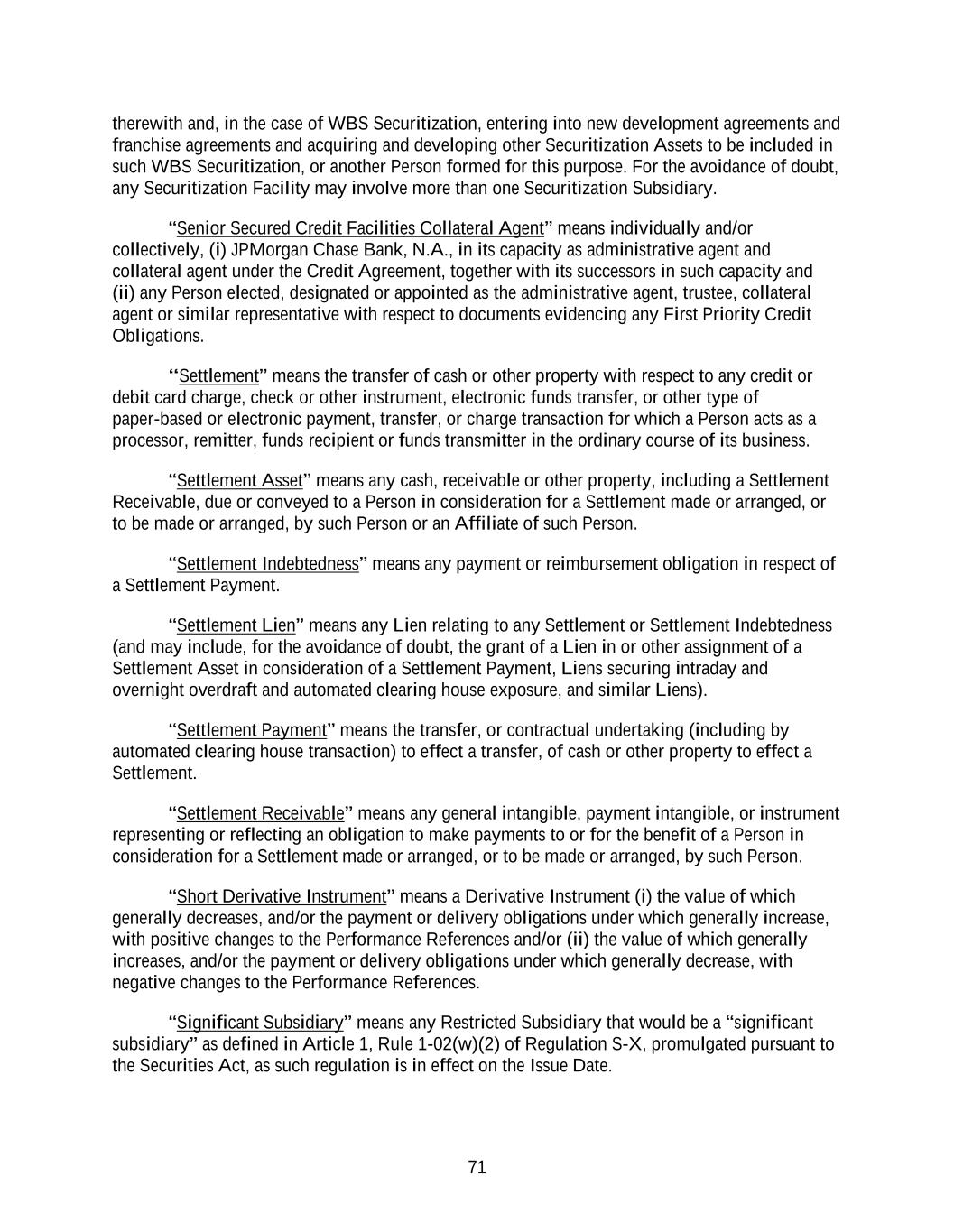 71 therewith and, in the case of WBS Securitization, entering into new development agreements and franchise agreements and acquiring and developing other Securitization Assets to be included in such WBS Securitization, or another Person formed for this purpose. For the avoidance of doubt, any Securitization Facility may involve more than one Securitization Subsidiary. “Senior Secured Credit Facilities Collateral Agent” means individually and/or collectively, (i) JPMorgan Chase Bank, N.A., in its capacity as administrative agent and collateral agent under the Credit Agreement, together with its successors in such capacity and (ii) any Person elected, designated or appointed as the administrative agent, trustee, collateral agent or similar representative with respect to documents evidencing any First Priority Credit Obligations. “Settlement” means the transfer of cash or other property with respect to any credit or debit card charge, check or other instrument, electronic funds transfer, or other type of paper-based or electronic payment, transfer, or charge transaction for which a Person acts as a processor, remitter, funds recipient or funds transmitter in the ordinary course of its business. “Settlement Asset” means any cash, receivable or other property, including a Settlement Receivable, due or conveyed to a Person in consideration for a Settlement made or arranged, or to be made or arranged, by such Person or an Affiliate of such Person. “Settlement Indebtedness” means any payment or reimbursement obligation in respect of a Settlement Payment. “Settlement Lien” means any Lien relating to any Settlement or Settlement Indebtedness (and may include, for the avoidance of doubt, the grant of a Lien in or other assignment of a Settlement Asset in consideration of a Settlement Payment, Liens securing intraday and overnight overdraft and automated clearing house exposure, and similar Liens). “Settlement Payment” means the transfer, or contractual undertaking (including by automated clearing house transaction) to effect a transfer, of cash or other property to effect a Settlement. “Settlement Receivable” means any general intangible, payment intangible, or instrument representing or reflecting an obligation to make payments to or for the benefit of a Person in consideration for a Settlement made or arranged, or to be made or arranged, by such Person. “Short Derivative Instrument” means a Derivative Instrument (i) the value of which generally decreases, and/or the payment or delivery obligations under which generally increase, with positive changes to the Performance References and/or (ii) the value of which generally increases, and/or the payment or delivery obligations under which generally decrease, with negative changes to the Performance References. “Significant Subsidiary” means any Restricted Subsidiary that would be a “significant subsidiary” as defined in Article 1, Rule 1-02(w)(2) of Regulation S-X, promulgated pursuant to the Securities Act, as such regulation is in effect on the Issue Date.