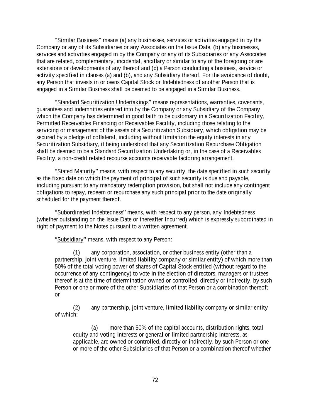72 “Similar Business” means (a) any businesses, services or activities engaged in by the Company or any of its Subsidiaries or any Associates on the Issue Date, (b) any businesses, services and activities engaged in by the Company or any of its Subsidiaries or any Associates that are related, complementary, incidental, ancillary or similar to any of the foregoing or are extensions or developments of any thereof and (c) a Person conducting a business, service or activity specified in clauses (a) and (b), and any Subsidiary thereof. For the avoidance of doubt, any Person that invests in or owns Capital Stock or Indebtedness of another Person that is engaged in a Similar Business shall be deemed to be engaged in a Similar Business. “Standard Securitization Undertakings” means representations, warranties, covenants, guarantees and indemnities entered into by the Company or any Subsidiary of the Company which the Company has determined in good faith to be customary in a Securitization Facility, Permitted Receivables Financing or Receivables Facility, including those relating to the servicing or management of the assets of a Securitization Subsidiary, which obligation may be secured by a pledge of collateral, including without limitation the equity interests in any Securitization Subsidiary, it being understood that any Securitization Repurchase Obligation shall be deemed to be a Standard Securitization Undertaking or, in the case of a Receivables Facility, a non-credit related recourse accounts receivable factoring arrangement. “Stated Maturity” means, with respect to any security, the date specified in such security as the fixed date on which the payment of principal of such security is due and payable, including pursuant to any mandatory redemption provision, but shall not include any contingent obligations to repay, redeem or repurchase any such principal prior to the date originally scheduled for the payment thereof. “Subordinated Indebtedness” means, with respect to any person, any Indebtedness (whether outstanding on the Issue Date or thereafter Incurred) which is expressly subordinated in right of payment to the Notes pursuant to a written agreement. “Subsidiary” means, with respect to any Person: (1) any corporation, association, or other business entity (other than a partnership, joint venture, limited liability company or similar entity) of which more than 50% of the total voting power of shares of Capital Stock entitled (without regard to the occurrence of any contingency) to vote in the election of directors, managers or trustees thereof is at the time of determination owned or controlled, directly or indirectly, by such Person or one or more of the other Subsidiaries of that Person or a combination thereof; or (2) any partnership, joint venture, limited liability company or similar entity of which: (a) more than 50% of the capital accounts, distribution rights, total equity and voting interests or general or limited partnership interests, as applicable, are owned or controlled, directly or indirectly, by such Person or one or more of the other Subsidiaries of that Person or a combination thereof whether
