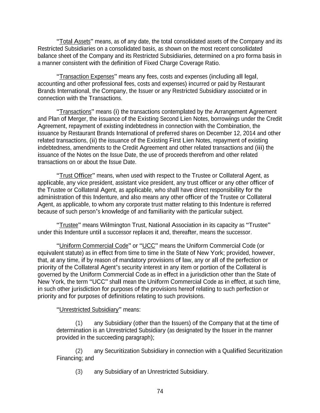 74 “Total Assets” means, as of any date, the total consolidated assets of the Company and its Restricted Subsidiaries on a consolidated basis, as shown on the most recent consolidated balance sheet of the Company and its Restricted Subsidiaries, determined on a pro forma basis in a manner consistent with the definition of Fixed Charge Coverage Ratio. “Transaction Expenses” means any fees, costs and expenses (including all legal, accounting and other professional fees, costs and expenses) incurred or paid by Restaurant Brands International, the Company, the Issuer or any Restricted Subsidiary associated or in connection with the Transactions. “Transactions” means (i) the transactions contemplated by the Arrangement Agreement and Plan of Merger, the issuance of the Existing Second Lien Notes, borrowings under the Credit Agreement, repayment of existing indebtedness in connection with the Combination, the issuance by Restaurant Brands International of preferred shares on December 12, 2014 and other related transactions, (ii) the issuance of the Existing First Lien Notes, repayment of existing indebtedness, amendments to the Credit Agreement and other related transactions and (iii) the issuance of the Notes on the Issue Date, the use of proceeds therefrom and other related transactions on or about the Issue Date. “Trust Officer” means, when used with respect to the Trustee or Collateral Agent, as applicable, any vice president, assistant vice president, any trust officer or any other officer of the Trustee or Collateral Agent, as applicable, who shall have direct responsibility for the administration of this Indenture, and also means any other officer of the Trustee or Collateral Agent, as applicable, to whom any corporate trust matter relating to this Indenture is referred because of such person’s knowledge of and familiarity with the particular subject. “Trustee” means Wilmington Trust, National Association in its capacity as “Trustee” under this Indenture until a successor replaces it and, thereafter, means the successor. “Uniform Commercial Code” or “UCC” means the Uniform Commercial Code (or equivalent statute) as in effect from time to time in the State of New York; provided, however, that, at any time, if by reason of mandatory provisions of law, any or all of the perfection or priority of the Collateral Agent’s security interest in any item or portion of the Collateral is governed by the Uniform Commercial Code as in effect in a jurisdiction other than the State of New York, the term “UCC” shall mean the Uniform Commercial Code as in effect, at such time, in such other jurisdiction for purposes of the provisions hereof relating to such perfection or priority and for purposes of definitions relating to such provisions. “Unrestricted Subsidiary” means: (1) any Subsidiary (other than the Issuers) of the Company that at the time of determination is an Unrestricted Subsidiary (as designated by the Issuer in the manner provided in the succeeding paragraph); (2) any Securitization Subsidiary in connection with a Qualified Securitization Financing; and (3) any Subsidiary of an Unrestricted Subsidiary.