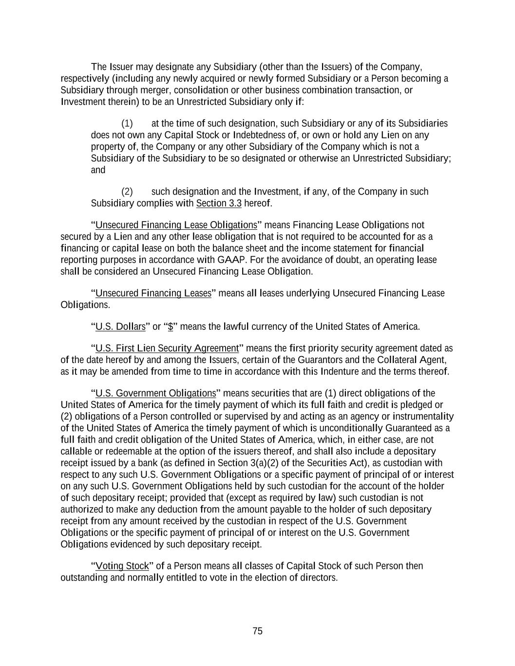75 The Issuer may designate any Subsidiary (other than the Issuers) of the Company, respectively (including any newly acquired or newly formed Subsidiary or a Person becoming a Subsidiary through merger, consolidation or other business combination transaction, or Investment therein) to be an Unrestricted Subsidiary only if: (1) at the time of such designation, such Subsidiary or any of its Subsidiaries does not own any Capital Stock or Indebtedness of, or own or hold any Lien on any property of, the Company or any other Subsidiary of the Company which is not a Subsidiary of the Subsidiary to be so designated or otherwise an Unrestricted Subsidiary; and (2) such designation and the Investment, if any, of the Company in such Subsidiary complies with Section 3.3 hereof. “Unsecured Financing Lease Obligations” means Financing Lease Obligations not secured by a Lien and any other lease obligation that is not required to be accounted for as a financing or capital lease on both the balance sheet and the income statement for financial reporting purposes in accordance with GAAP. For the avoidance of doubt, an operating lease shall be considered an Unsecured Financing Lease Obligation. “Unsecured Financing Leases” means all leases underlying Unsecured Financing Lease Obligations. “U.S. Dollars” or “$” means the lawful currency of the United States of America. “U.S. First Lien Security Agreement” means the first priority security agreement dated as of the date hereof by and among the Issuers, certain of the Guarantors and the Collateral Agent, as it may be amended from time to time in accordance with this Indenture and the terms thereof. “U.S. Government Obligations” means securities that are (1) direct obligations of the United States of America for the timely payment of which its full faith and credit is pledged or (2) obligations of a Person controlled or supervised by and acting as an agency or instrumentality of the United States of America the timely payment of which is unconditionally Guaranteed as a full faith and credit obligation of the United States of America, which, in either case, are not callable or redeemable at the option of the issuers thereof, and shall also include a depositary receipt issued by a bank (as defined in Section 3(a)(2) of the Securities Act), as custodian with respect to any such U.S. Government Obligations or a specific payment of principal of or interest on any such U.S. Government Obligations held by such custodian for the account of the holder of such depositary receipt; provided that (except as required by law) such custodian is not authorized to make any deduction from the amount payable to the holder of such depositary receipt from any amount received by the custodian in respect of the U.S. Government Obligations or the specific payment of principal of or interest on the U.S. Government Obligations evidenced by such depositary receipt. “Voting Stock” of a Person means all classes of Capital Stock of such Person then outstanding and normally entitled to vote in the election of directors.