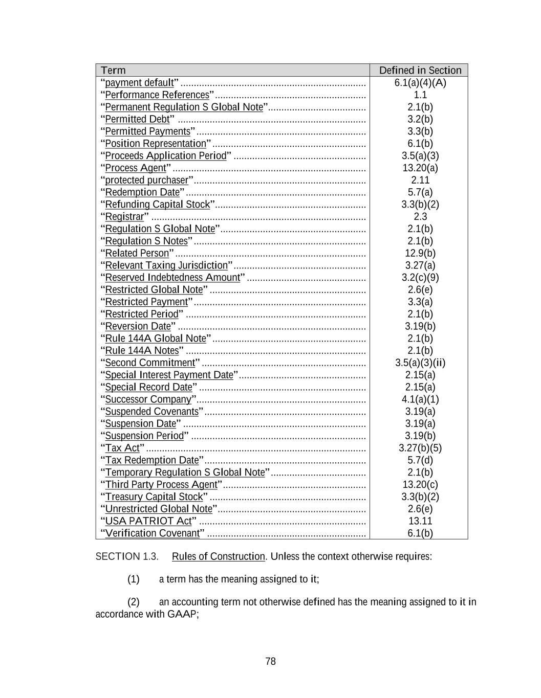 78 Term Defined in Section “payment default” ...................................................................... 6.1(a)(4)(A) “Performance References” ......................................................... 1.1 “Permanent Regulation S Global Note”..................................... 2.1(b) “Permitted Debt” ....................................................................... 3.2(b) “Permitted Payments” ................................................................ 3.3(b) “Position Representation” .......................................................... 6.1(b) “Proceeds Application Period” .................................................. 3.5(a)(3) “Process Agent” ......................................................................... 13.20(a) “protected purchaser” ................................................................. 2.11 “Redemption Date” .................................................................... 5.7(a) “Refunding Capital Stock” ......................................................... 3.3(b)(2) “Registrar” ................................................................................. 2.3 “Regulation S Global Note” ....................................................... 2.1(b) “Regulation S Notes” ................................................................. 2.1(b) “Related Person” ........................................................................ 12.9(b) “Relevant Taxing Jurisdiction” .................................................. 3.27(a) “Reserved Indebtedness Amount” ............................................. 3.2(c)(9) “Restricted Global Note” ........................................................... 2.6(e) “Restricted Payment” ................................................................. 3.3(a) “Restricted Period” .................................................................... 2.1(b) “Reversion Date” ....................................................................... 3.19(b) “Rule 144A Global Note” .......................................................... 2.1(b) “Rule 144A Notes” .................................................................... 2.1(b) “Second Commitment” .............................................................. 3.5(a)(3)(ii) “Special Interest Payment Date” ................................................ 2.15(a) “Special Record Date” ............................................................... 2.15(a) “Successor Company”................................................................ 4.1(a)(1) “Suspended Covenants” ............................................................. 3.19(a) “Suspension Date” ..................................................................... 3.19(a) “Suspension Period” .................................................................. 3.19(b) “Tax Act” ................................................................................... 3.27(b)(5) “Tax Redemption Date” ............................................................. 5.7(d) “Temporary Regulation S Global Note” .................................... 2.1(b) “Third Party Process Agent” ...................................................... 13.20(c) “Treasury Capital Stock” ........................................................... 3.3(b)(2) “Unrestricted Global Note” ........................................................ 2.6(e) “USA PATRIOT Act” ............................................................... 13.11 “Verification Covenant” ............................................................ 6.1(b) SECTION 1.3. Rules of Construction. Unless the context otherwise requires: (1) a term has the meaning assigned to it; (2) an accounting term not otherwise defined has the meaning assigned to it in accordance with GAAP;